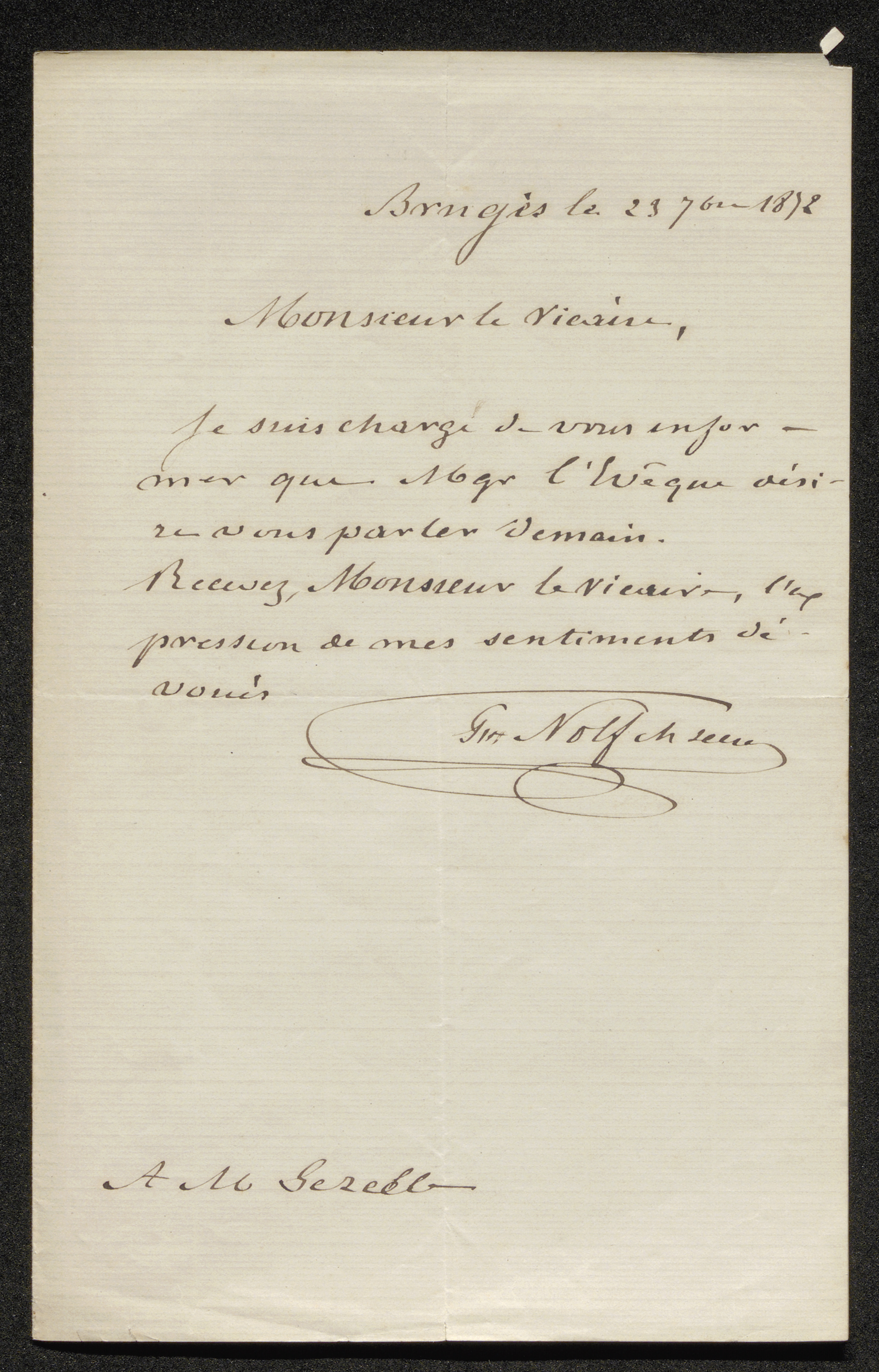 Je suis chargé de vous informer que Mgr l'Evêque désire vous parler demain.