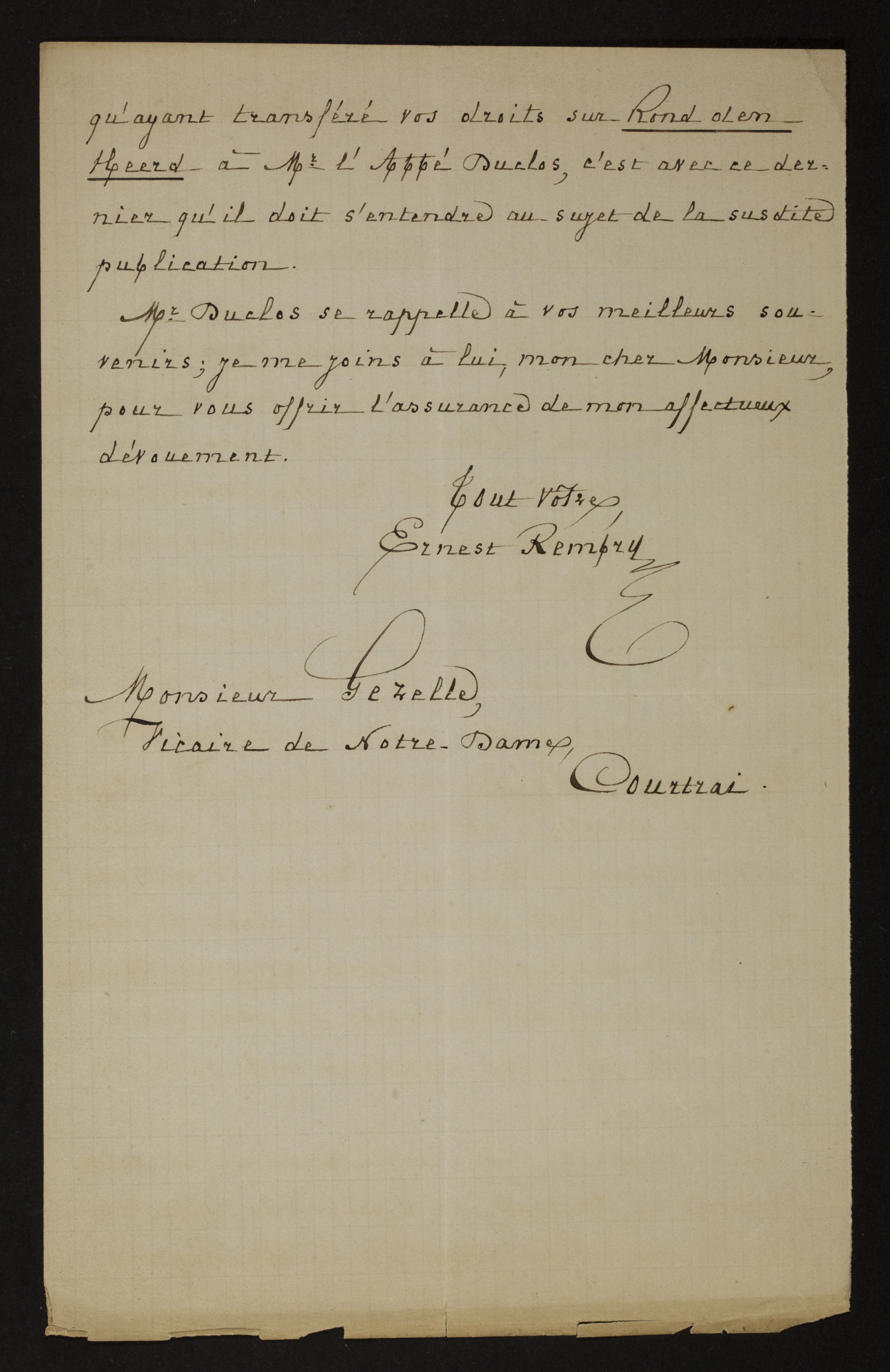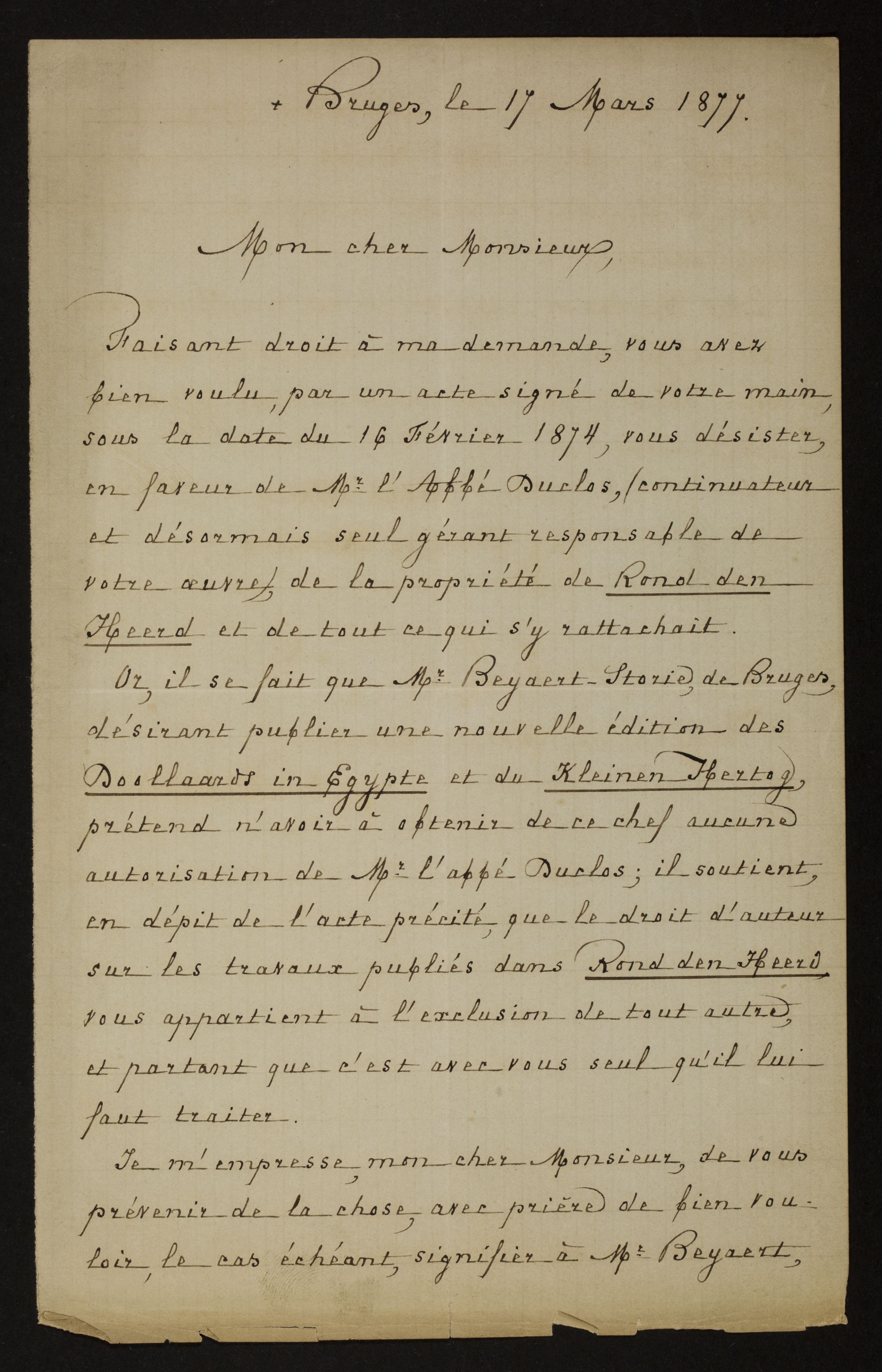 Je m’empresse, mon cher Monsieur, de vous prévenir de la chose, avec prière de bien vouloir, le cas échéant, signifier à Mr Beyaert,p2qu’ayant transféré vos droits sur Rond den Heerd à Mr l’Abbé Duclos, c’est avec ce dernier qu’il doit s’entendre au sujet de la susdite publication.