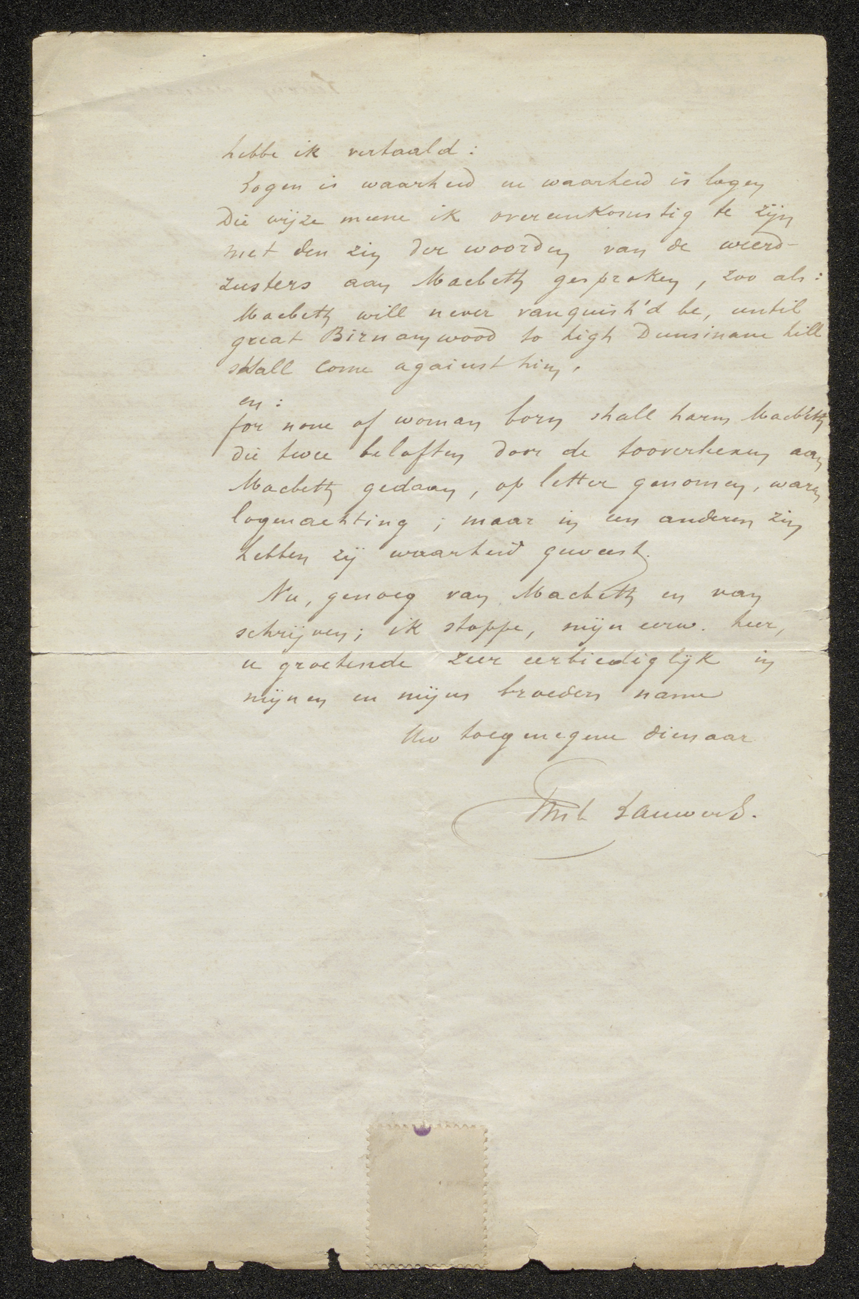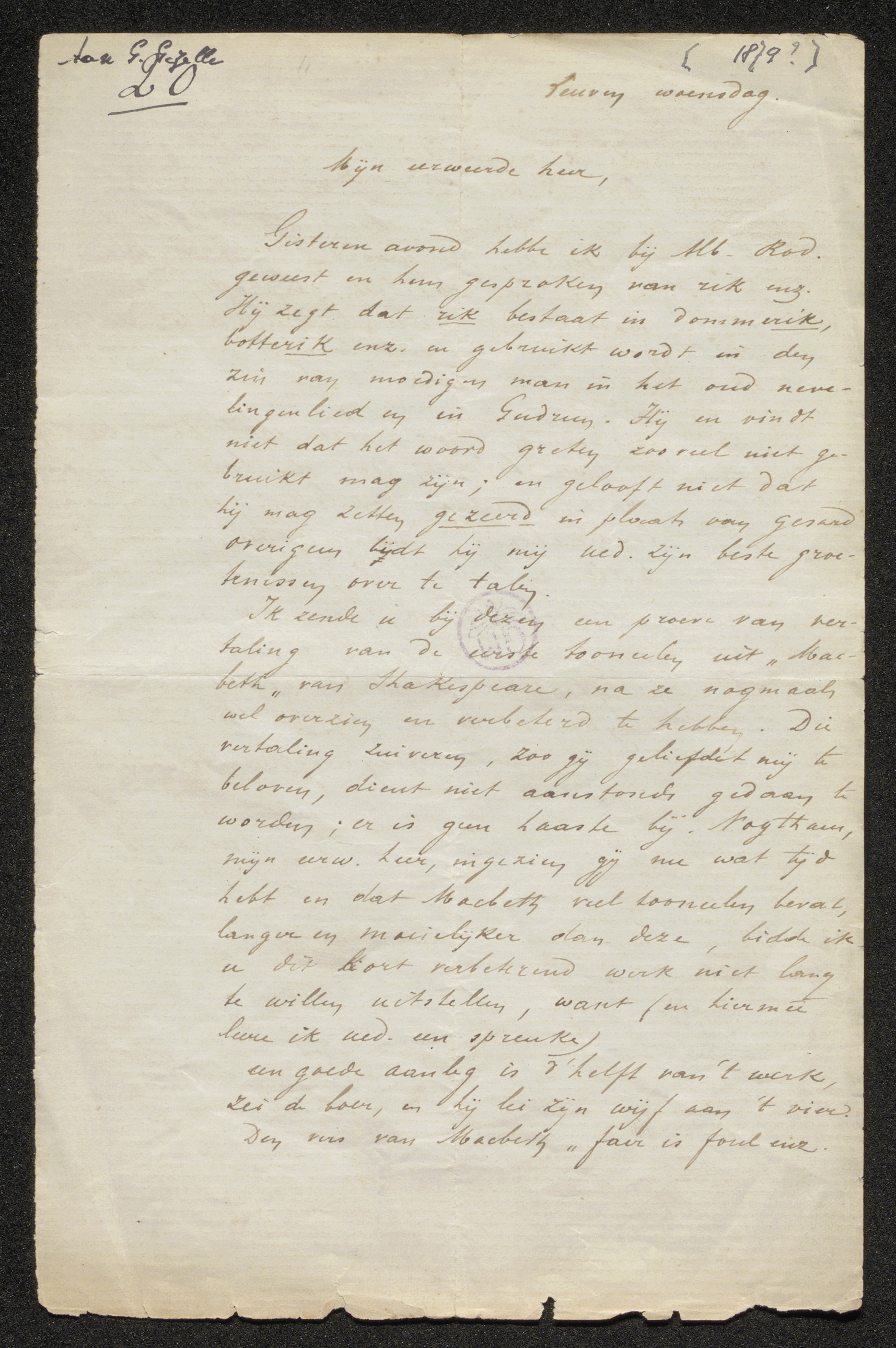 Ik zende u bij dezen een proeve van vertaling van de eerste tooneelen uit "Macbeth"[4] van Shakespeare na ze nogmaals wel overzien en verbeterd te hebben.[5] Die vertaling zuiveren, zoo gij geliefdet mij te beloven, dient niet aanstonds gedaan te worden; er is geen haaste bij. Nogthans, mijn eerw. heer, ingezien gij nu wat tijd hebt in dat Macbeth veel tooneelen bevat, langer en moeilijker dan deze, bidde ik u dit kort verbeterend werk niet lang te willen uitstellen, want (en hiermeê leere ik uedele een spreuke)