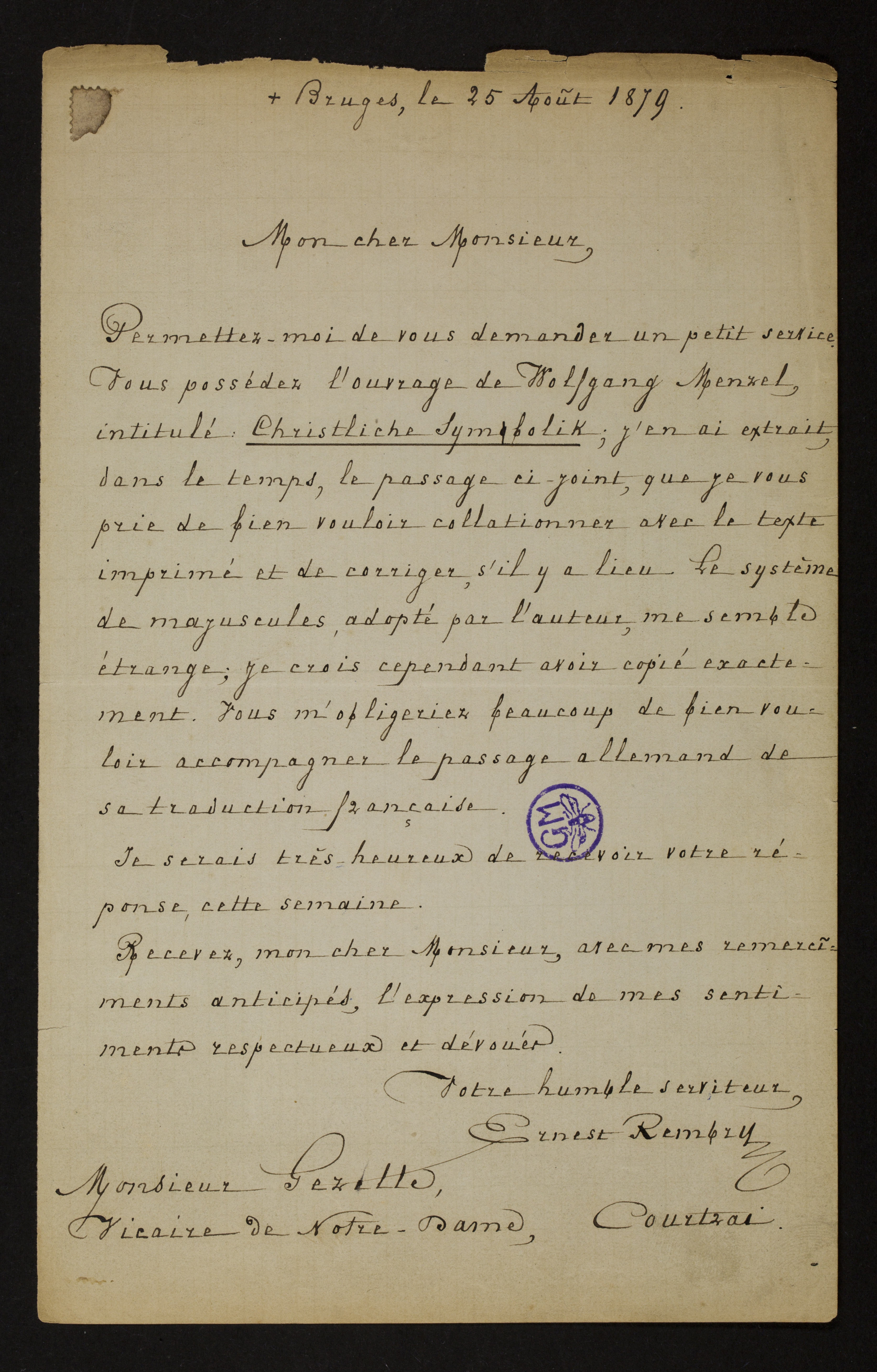 CiterenRik Van Gorp; Els Depuydt; Universiteit Antwerpen, Rembry Ernest aan Gezelle Guido, Brugge (Brugge), 25/08/1879. In: GezelleBrOn, Wetenschappelijke editie van de correspondentie van Guido Gezelle. 2026 Available from World Wide Web: link .