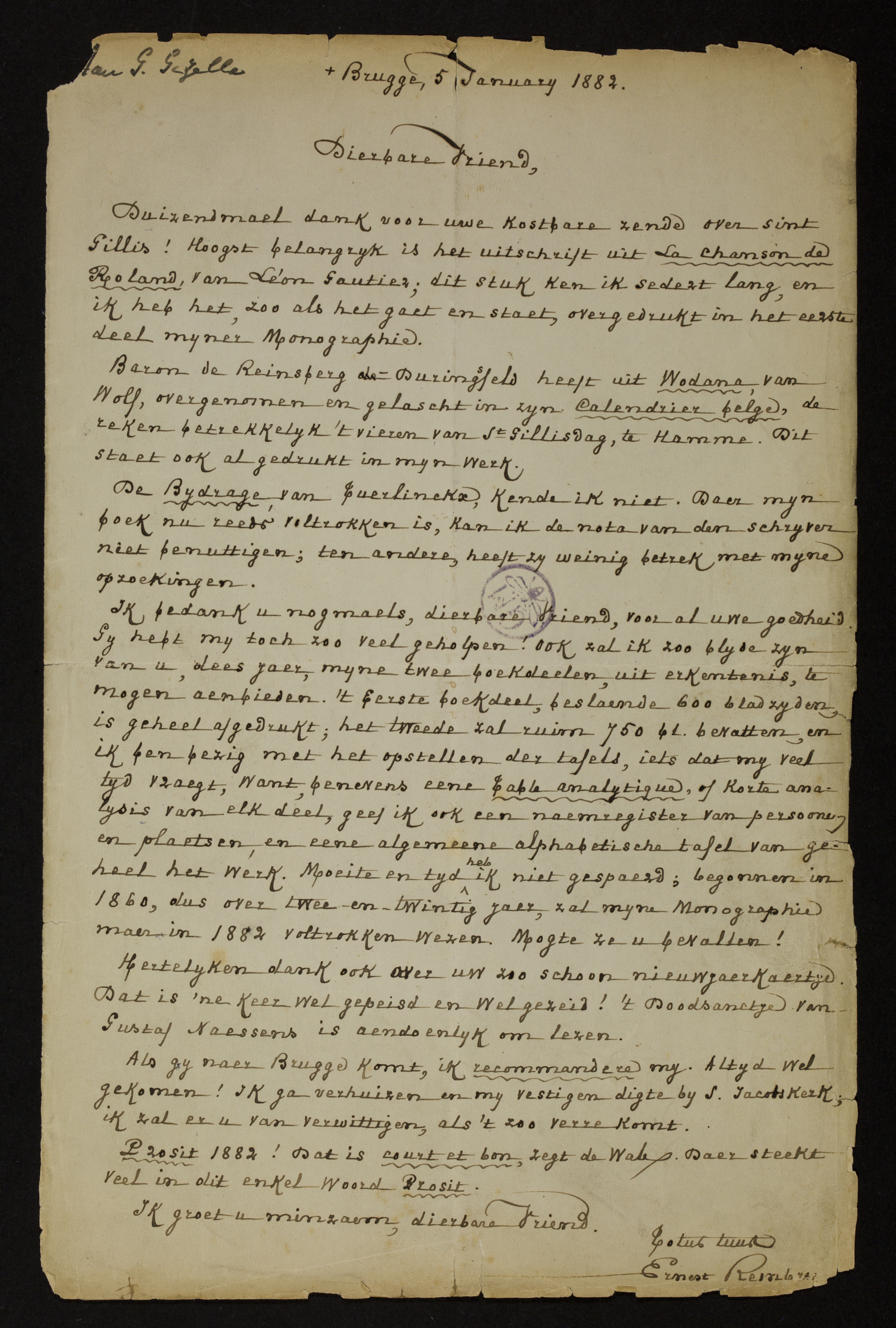 Duizendmael dank voor uwe kostbare zende over sint Gillis! Hoogst belangryk is het uitschrift uit La chanson de Roland, van Léon Gautier; dit stuk ken ik sedert lang, en ik heb het, zoo als het gaet en staet, overgedrukt in het eerste deel myner monographie.[1]