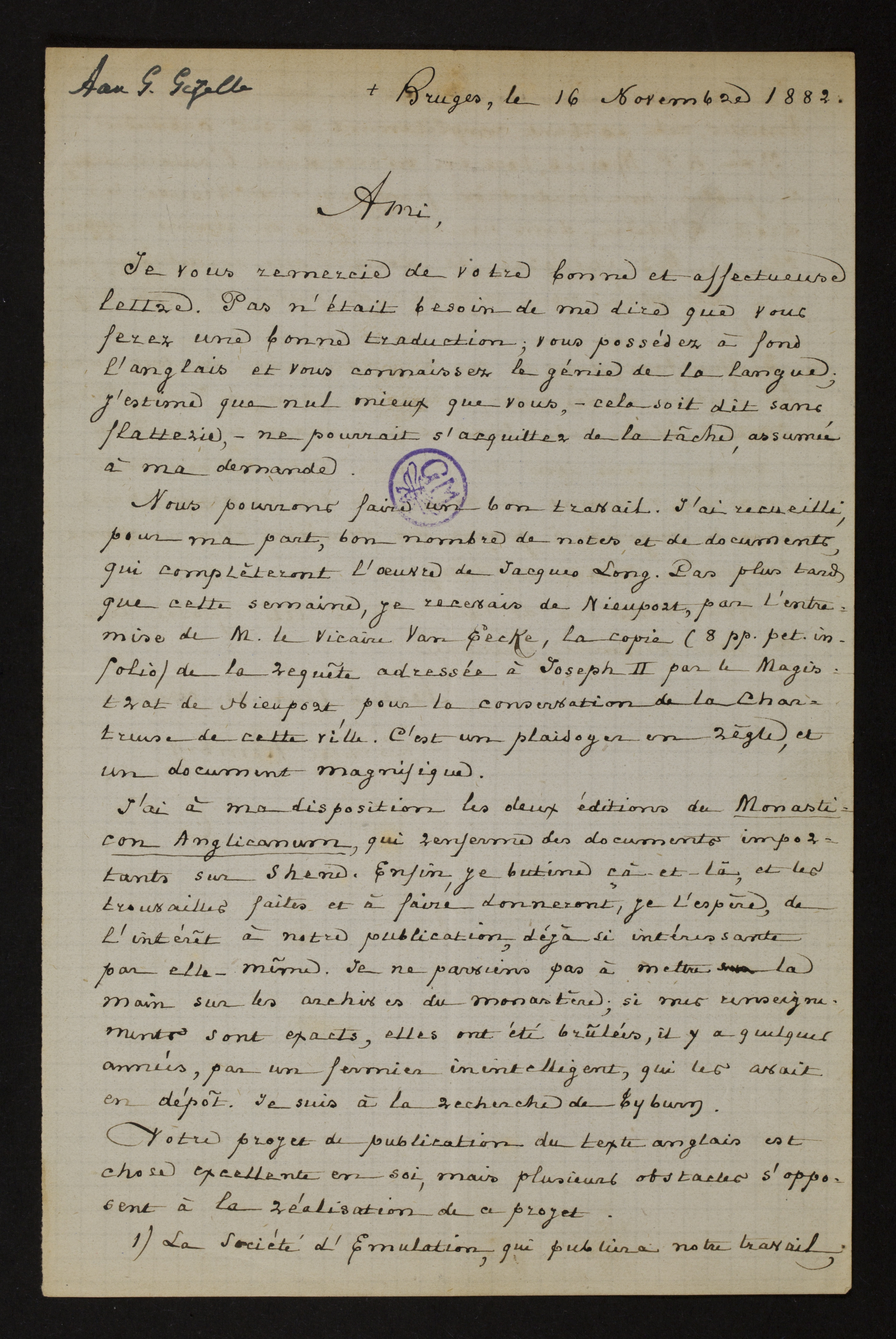 Nous pourrons faire un bon travail. J’ai receuilli, pour ma part, bon nombre de notes, et de documents, qui complèteront l’oeuvre de Jacques Long. Pas plus tard que cette semaine, je recevais de Nieuport, par l’entreprise de M. le Vicaire Van Eecke, la copie (8 pp. petit in folio)[3] de la requête adressée à Joseph II par le Magistrat de Nieuport, pour la conservation de la Chartreuse de cette ville. C’est un plaidoyer en règle, et un document magnifique.