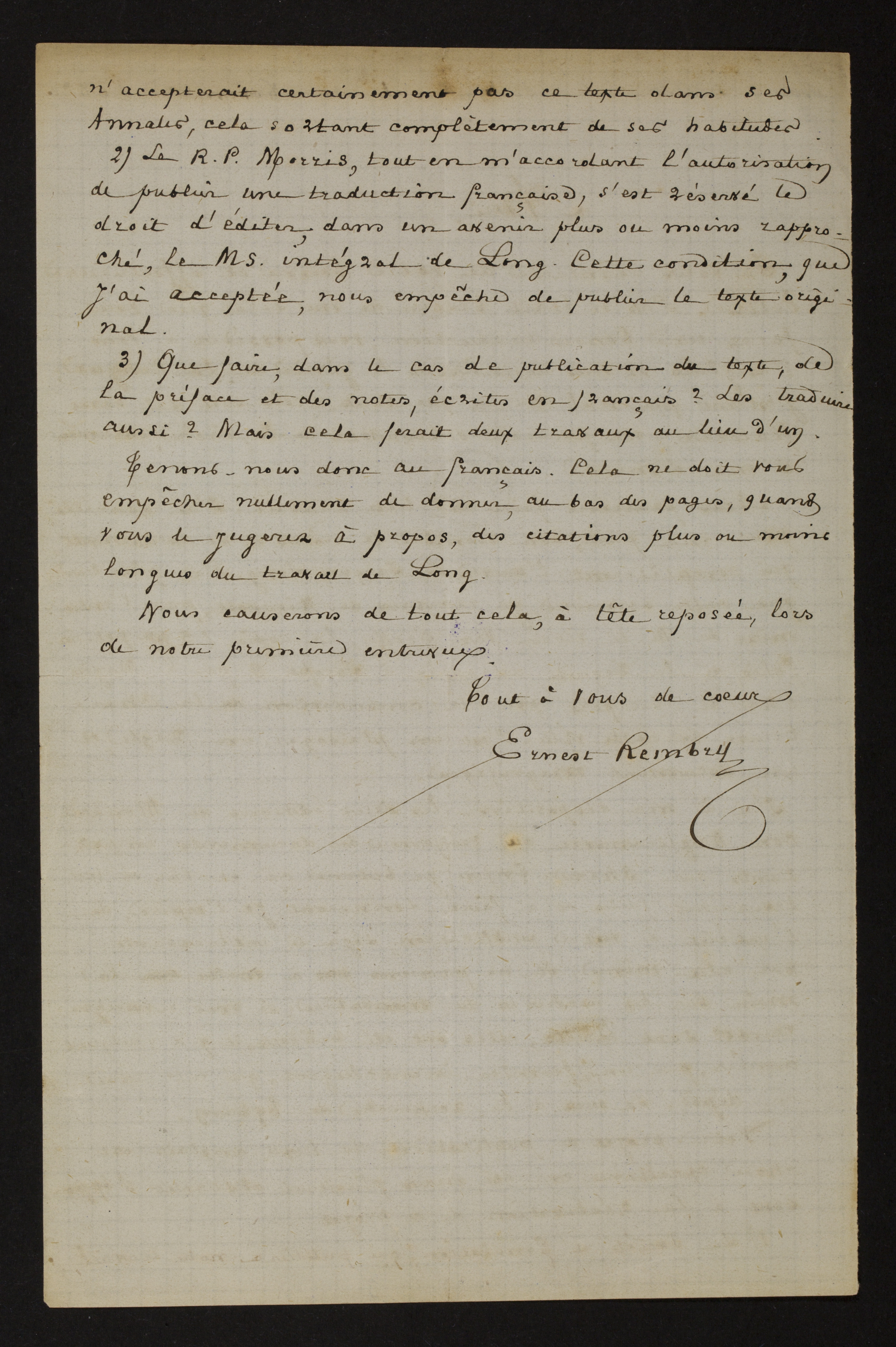 2) Le Révérend Père Morris, tout en m’accordant l’autorisation de publier une traduction française, s’est réservé le droit d’éditer, dans un avenir plus ou moins rapproché, le manuscrit intégral de Long. Cette condition, que j’ai acceptée, nous empêche de publier le texte original.