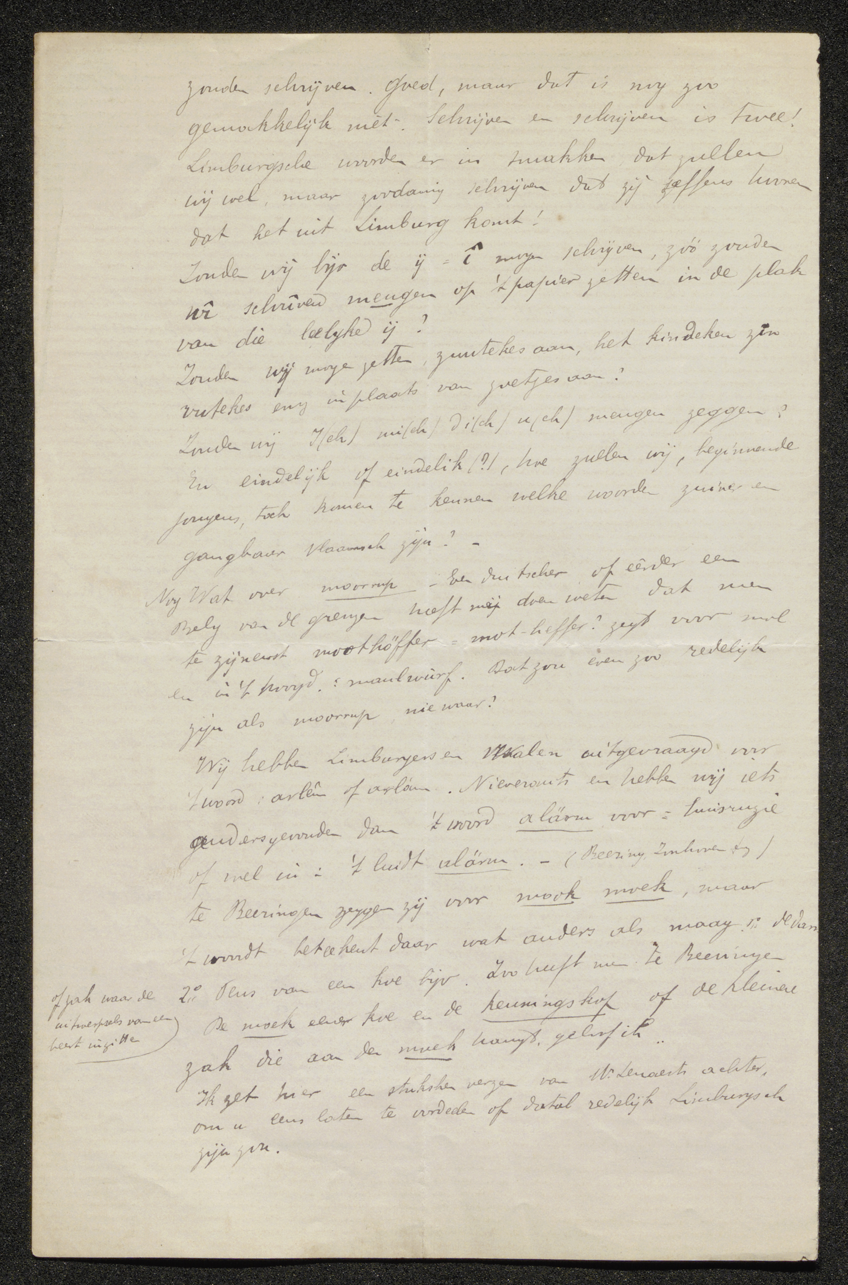 Ge zegt ook in uwen brief dat wij Limburgsch p2 zouden schrijven. Goed, maar dat is nog zoo gemakkelijk niet. Schrijven en schrijven is twee! Limburgsche woorden er in smakken[8] dat zullen wij wel, maar zoodanig schrijven dat zij seffens hooren dat het uit Limburg komt!