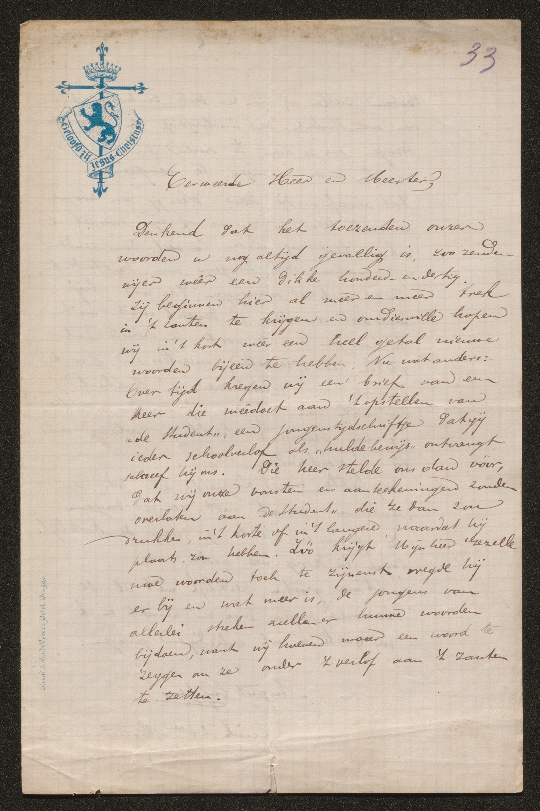 Vormelijke bijzonderheden briefpapier: kruisteken, met kroon en leeuw op schild, en met bijhorende spreuk, alles blauw gedrukt: Geloofd zij Jezus Christus