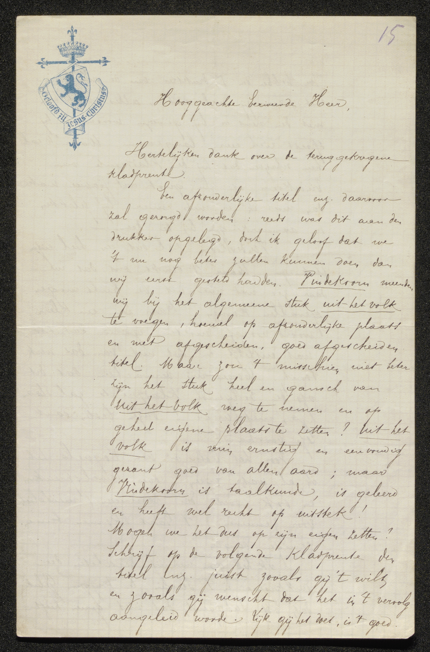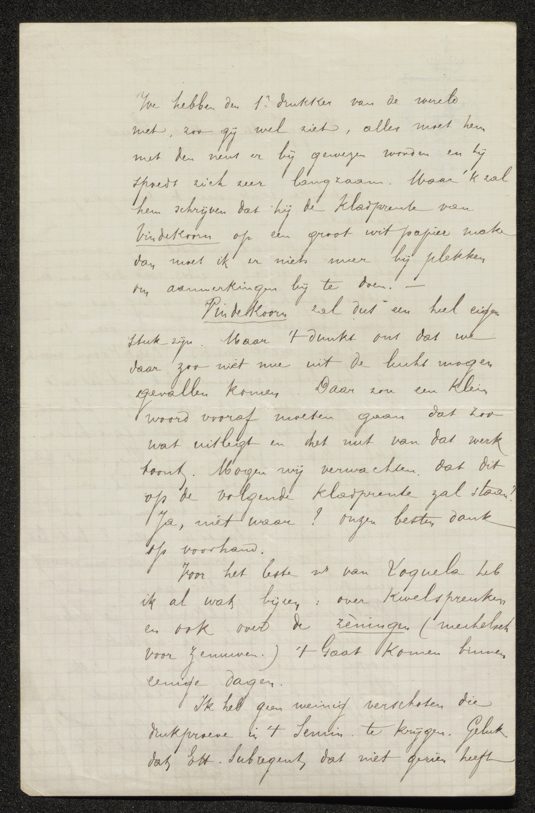Een afzonderlijke titel enz. daarvoor zal gezorgd worden: reeds was dit aan den drukker[2] opgelegd, doch ik geloof dat we 't nu nog beter zullen kunnen doen dan wij eerst gesteld hadden. Vindekoorn[3] meenden wij bij het algemeene stuk uit het volk[4] te voegen, hoewel op afzonderlijke plaats en met afgescheiden, goed afgescheiden titel. Maar zou 't misschien niet beter zijn het stuk heel en gansch van Uit het volk weg te nemen en op geheel eigene plaats te zetten?[5] Uit het volk is min ernstig en eenvoudig gezant goed van allen aard; maar Vindekoorn is taalkunde, is geleerd en heeft wel recht op uitstek! Mogen we het dus op zijn eigen zetten? Schrijf op de volgende kladprente den titel enz. juist zooals gij 't wilt en zooals gij wenscht dat het in 't vervolg aangeleid worde. Lijk gij het doet, is 't goed.p2We hebben den 1n drukker van de wereld niet, zoo gij wel ziet, alles moet hem met den neus er bij gewezen worden en hij spoedt zich zeer langzaam. Maar 'k zal hem schrijven dat hij de kladprente van Vindekoorn op een groot wit papier make dan moet ik er niets meer bij plekken om aanmerkingen bij te doen. -