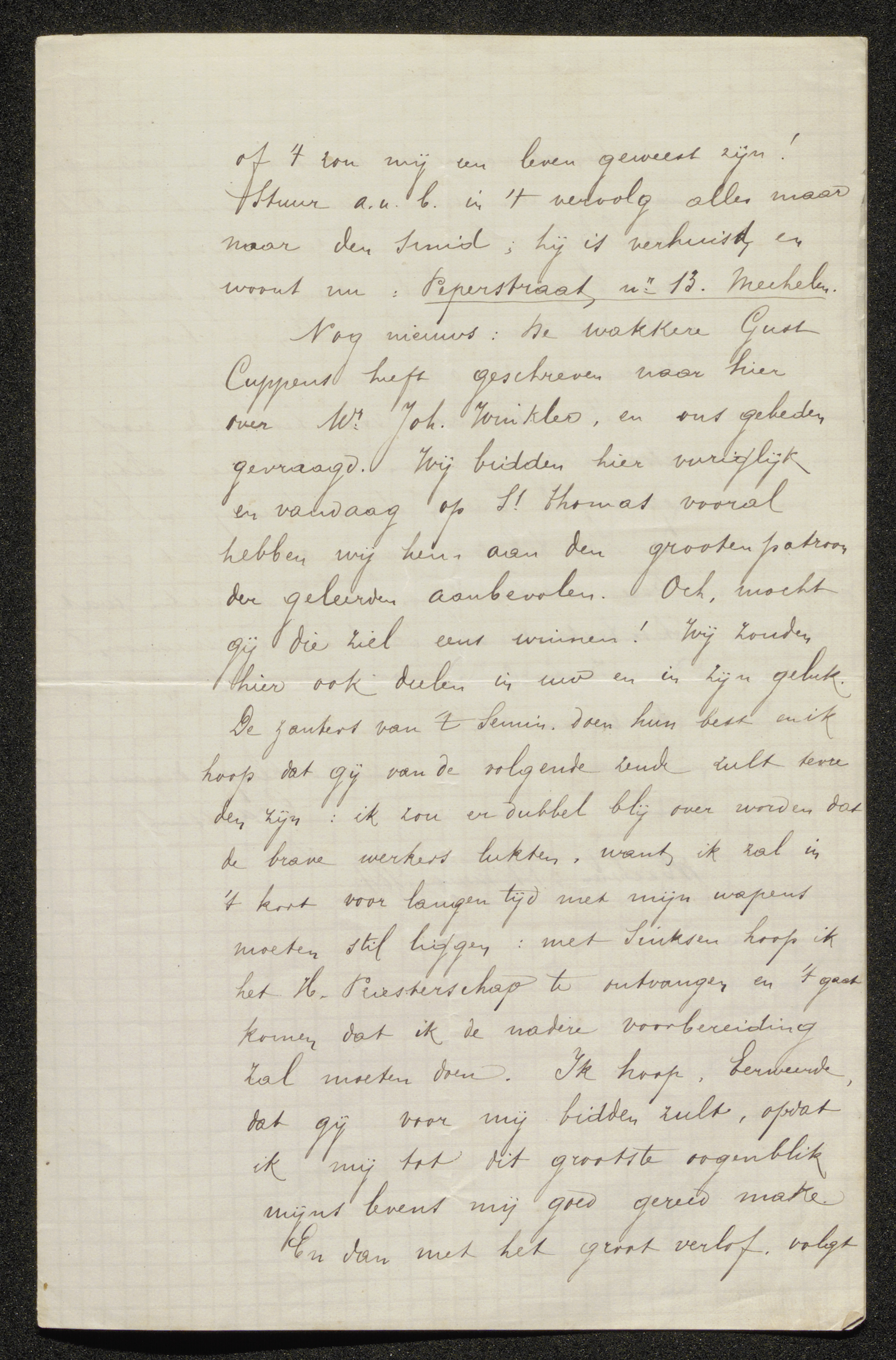 Nog nieuws: ne wakkere Gust Cuppens heeft geschreven naar hier over Mr Joh. Winkler, en ons gebeden gevraagd. Wij bidden hier vuriglijk en vandaag op St Thomas[9] vooral hebben wij hem aan den grooten patroon der geleerden aanbevolen. Och, mocht gij die ziel eens winnen! Wij zouden hier ook deelen in uw en in zijn geluk. De zanters[10] van 't Semin. doen hun best en ik hoop dat gij van de volgende zende zult tevreden zijn: ik zou er dubbel blij over worden dat de brave werkers lukken, want ik zal in 't kort voor langen tijd met mijn wapens moeten stil liggen: met Sinksen hoop ik het H. Priesterschap te ontvangen[11] en 't gaat komen dat ik de nadere voorbereiding zal moeten doen. Ik hoop, Eerweerde, dat gij voor mij bidden zult, opdat ik mij tot dit grootste oogenblik mijns levens mij goed gereed make. En dan met het groot verlof, volgtp4misschien al gauw het ministerie[12] en wie weet waar we aan zitten. Maar overal, als 't God belieft, trouwe zanter blijven en voor 't goede al de steentjes bij brengen die we kunnen hoe klein en hoe schaarsch ze ook mogen zijn.