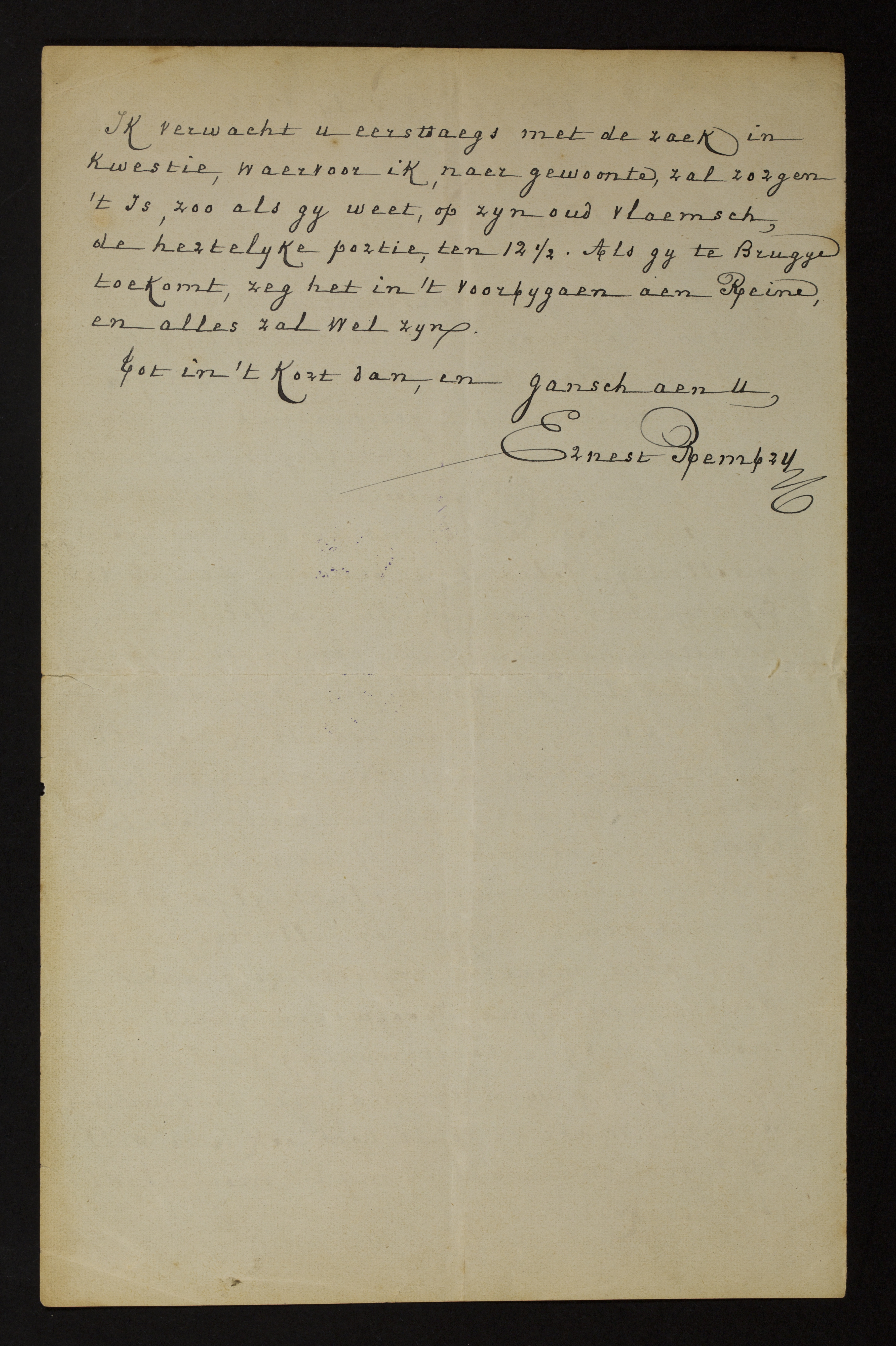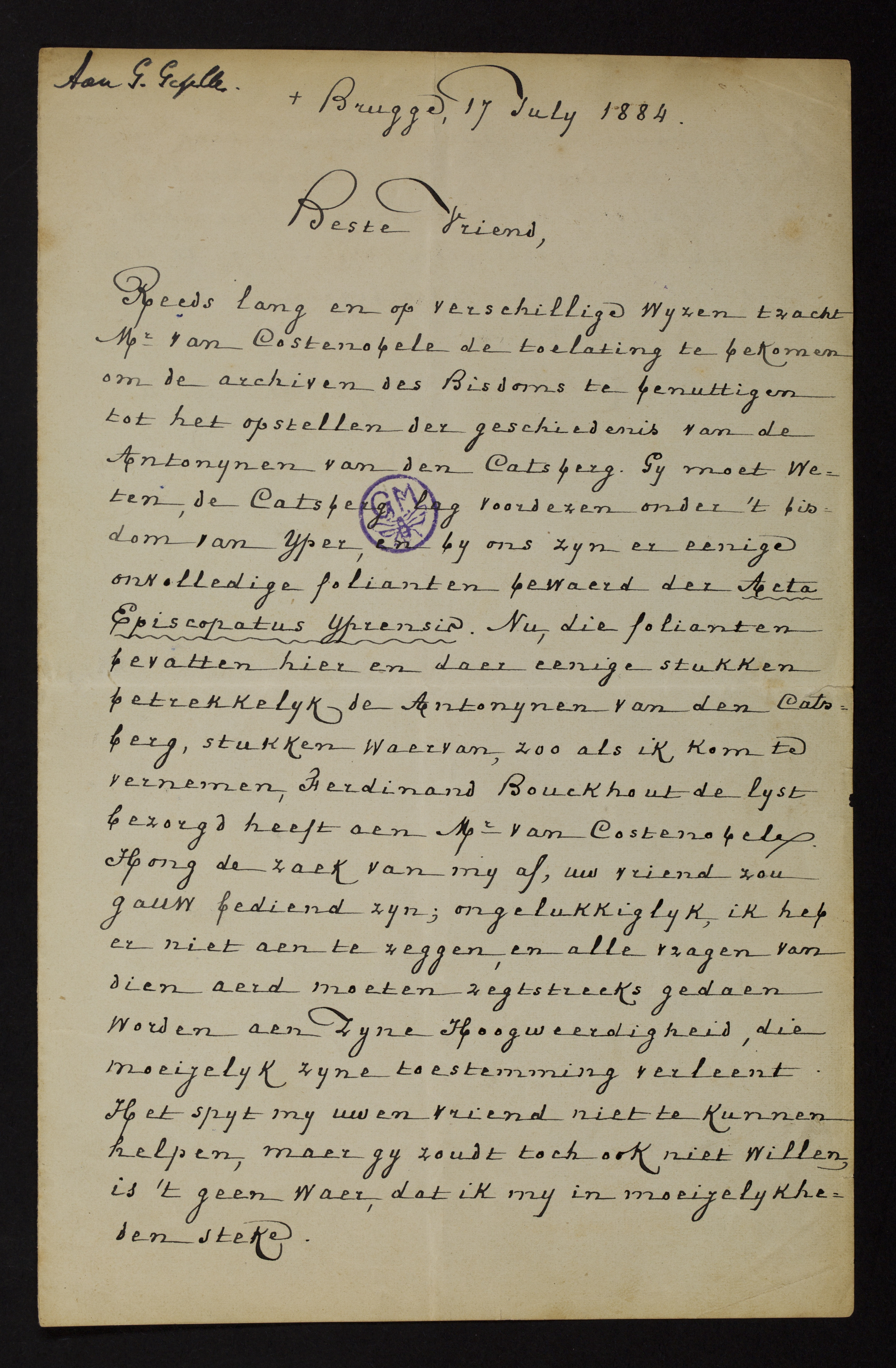 Reeds lang en op verschillige wyzen tracht Mr Van Costenobele de toelating te bekomen om de archiven des Bisdoms te benuttigen tot het opstellen der geschiedenis van de Antonynen van den Catsberg. Gy moet weten, de Catsberg lag voordezen onder ‘t bisdom van Yper, en by ons zyn er eenige onvolledige folianten bewaerd der Acta Episcopatus Yprensis.[1] Nu, die folianten bevatten hier en daer eenige stukken betrekkelyk de Antonynen van den Catsberg, stukken waervan, zoo als ik kom te vernemen, Ferdinand Bouckhout de lyst bezorgd heeft aen Mr Van Costenobele. Hong de zaek van my af, uw vriend zou gauw bediend zyn; ongelukkiglyk, ik heb er niet aen te zeggen, en alle vragen van dien aerd moeten regtstreeks gedaen worden aen Zyne Hoogweerdigheid, die moeyelyk zyne toestemming verleent. Het spyt my uwen vriend niet te kunnen helpen, maer gy zoudt toch ook niet willen, is ‘t geen waer, dat ik my in moeyelykheden steke.p2Ik verwacht u eerstdaegs met de zaek in kwestie, waervoor ik, naer gewoonte, zal zorgen. ‘t Is, zoo als gy weet, op zyn oud vlaemsch, de hertelyke portie, ten 12 ½. Als gy te Brugge toekomt, zeg het in ‘t voorbygaen aen Reine, en alles zal wel zyn.