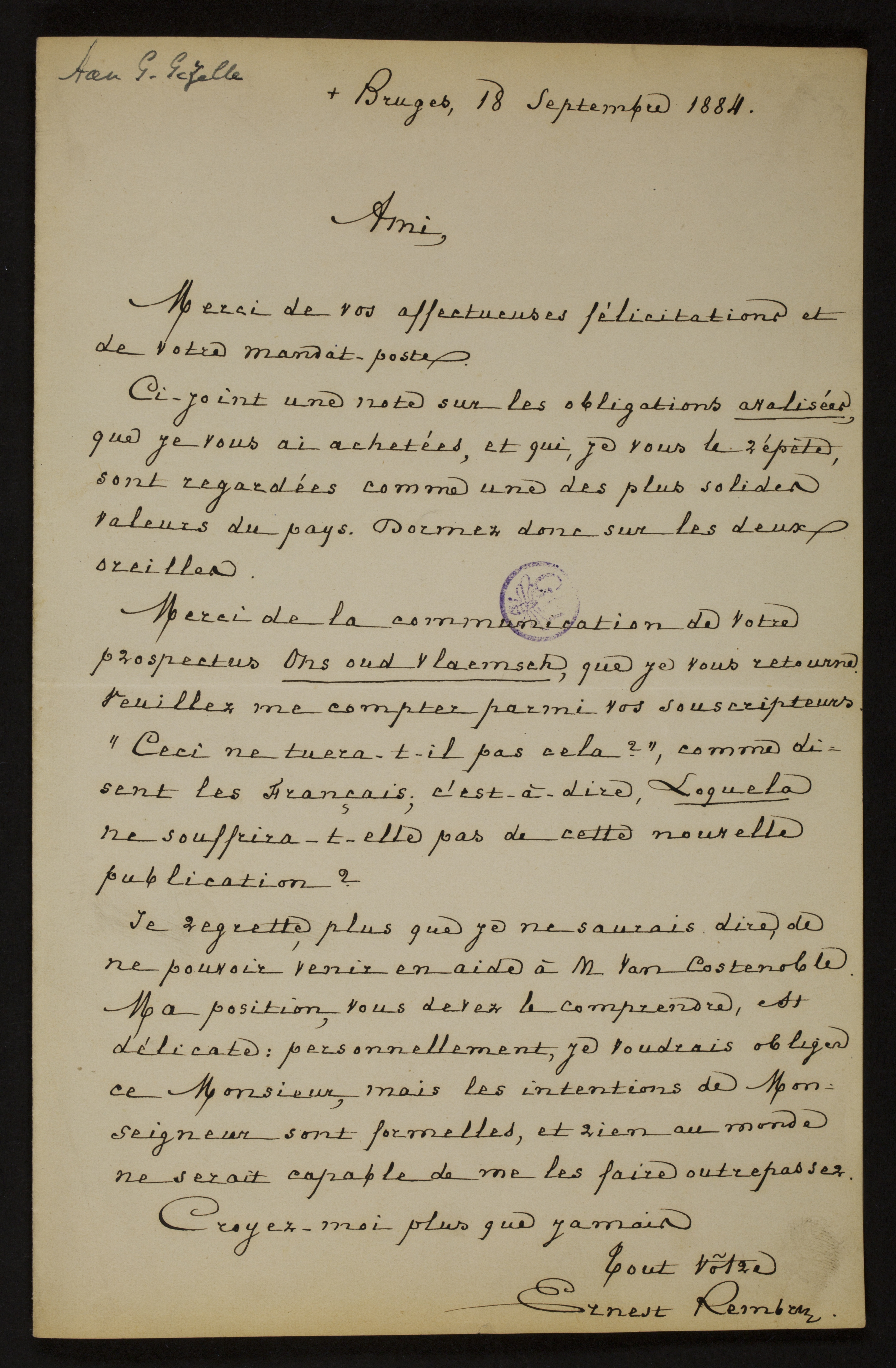 Titel18/09/1884, Brugge, Ernest Rembry aan [Guido Gezelle]