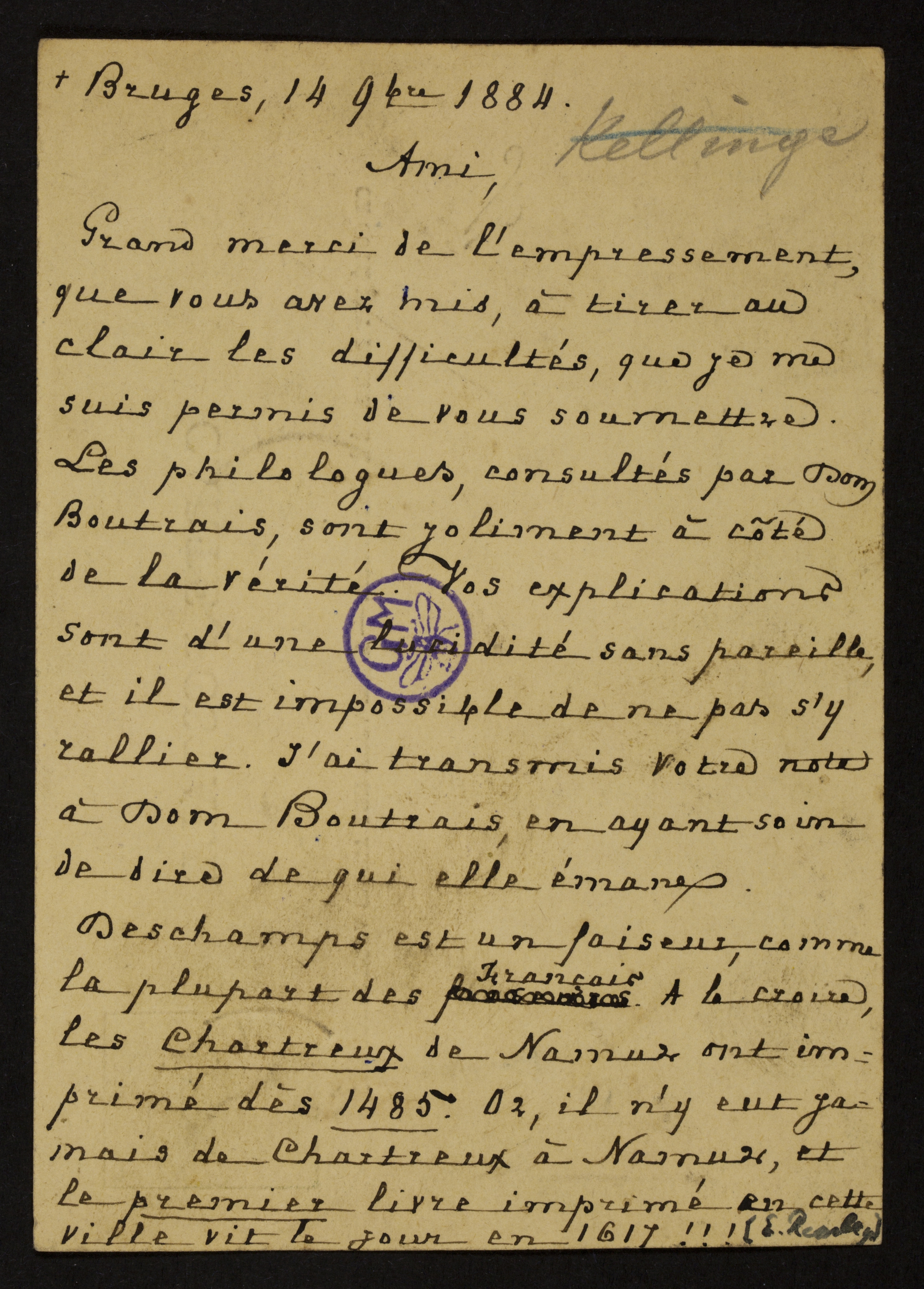 [1] In zijn brief van 08/11/1884 aan G. Gezelle had Rembry twee brieven van Dom Boutrais toegevoegd en had hij Gezelle dringend verzocht om de kwestie van de twee genoemde titels op te helderen en hem de precieze betekenis van de woorden ’thediet‘ en ’theerne‘ te melden. Hij had gevraagd zijn antwoord in het Frans te formuleren, zodat hij dit aan Dom Boutrais kon doorgeven, en hoopte het dinsdagmorgen te ontvangen.