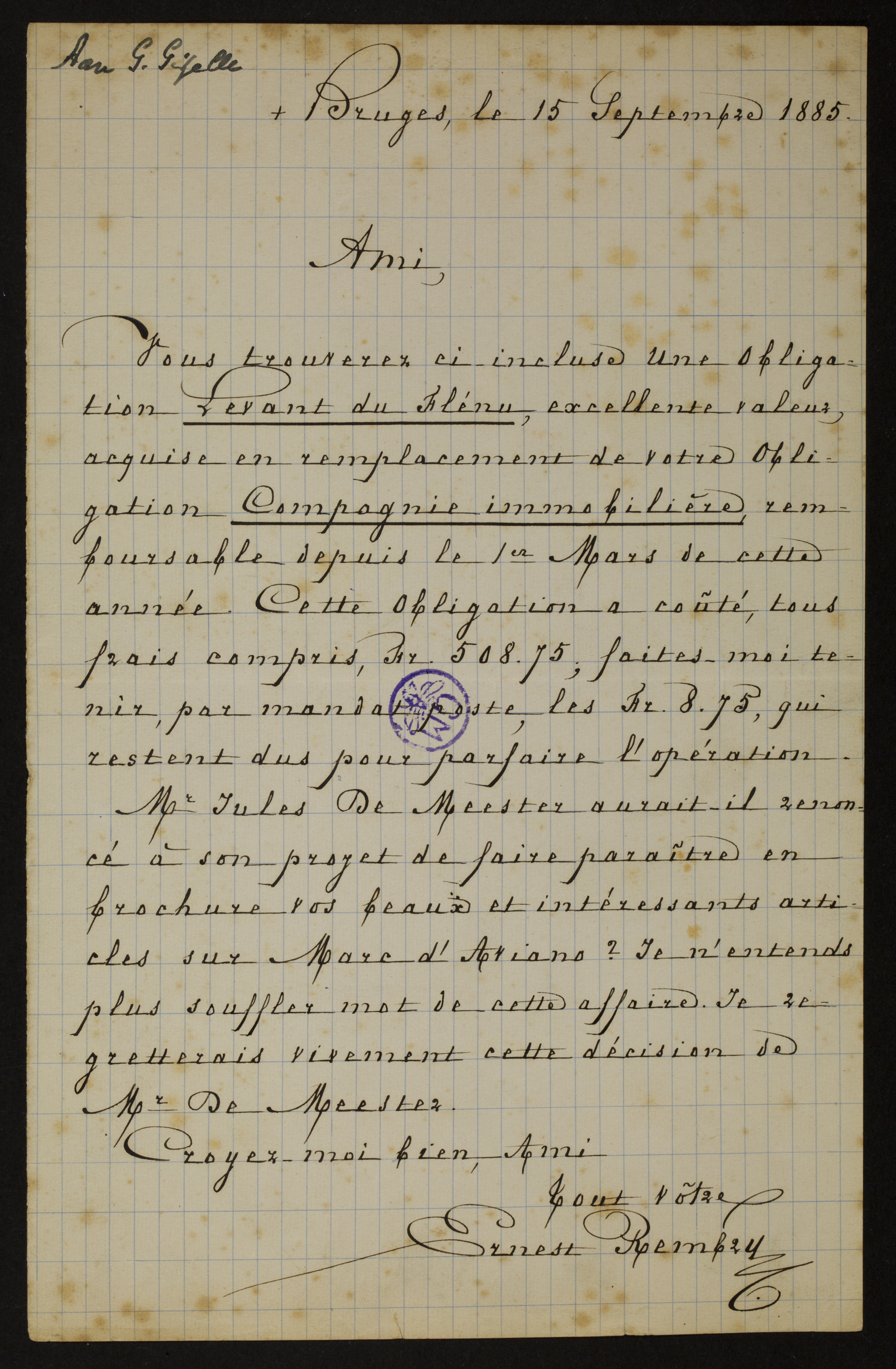 Vous trouverez ci-incluse une Obligation Levant du Flénu, excellente valeur, acquise en remplacement de votre Obligation Compagnie immobilière, remboursable depuis le 1er Mars de cette année. Cette Obligation a coûté, tous frais compris, Fr. 508.75; faites-moi tenir, par mandat-poste, les Fr. 8.75, qui restent dus pour parfaire l’opération.[1]