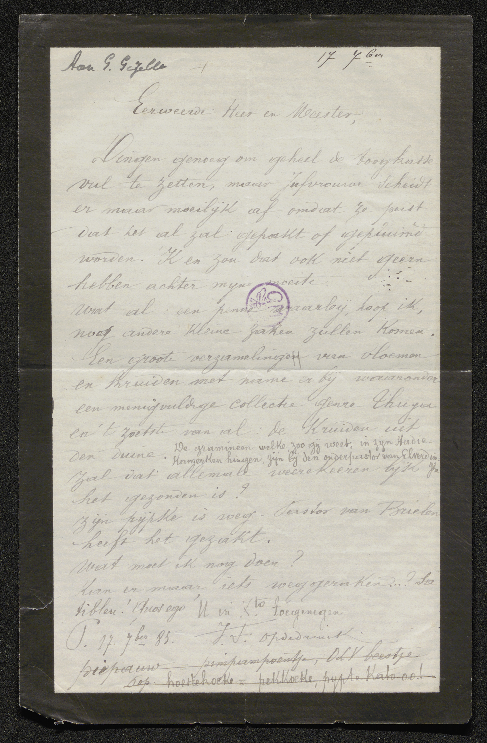 Toevoegingen op zijde 1 links in de bovenrand: Aan G. Gezelle (inkt, hand P.A.); idem rechts: 17 7ber (inkt)