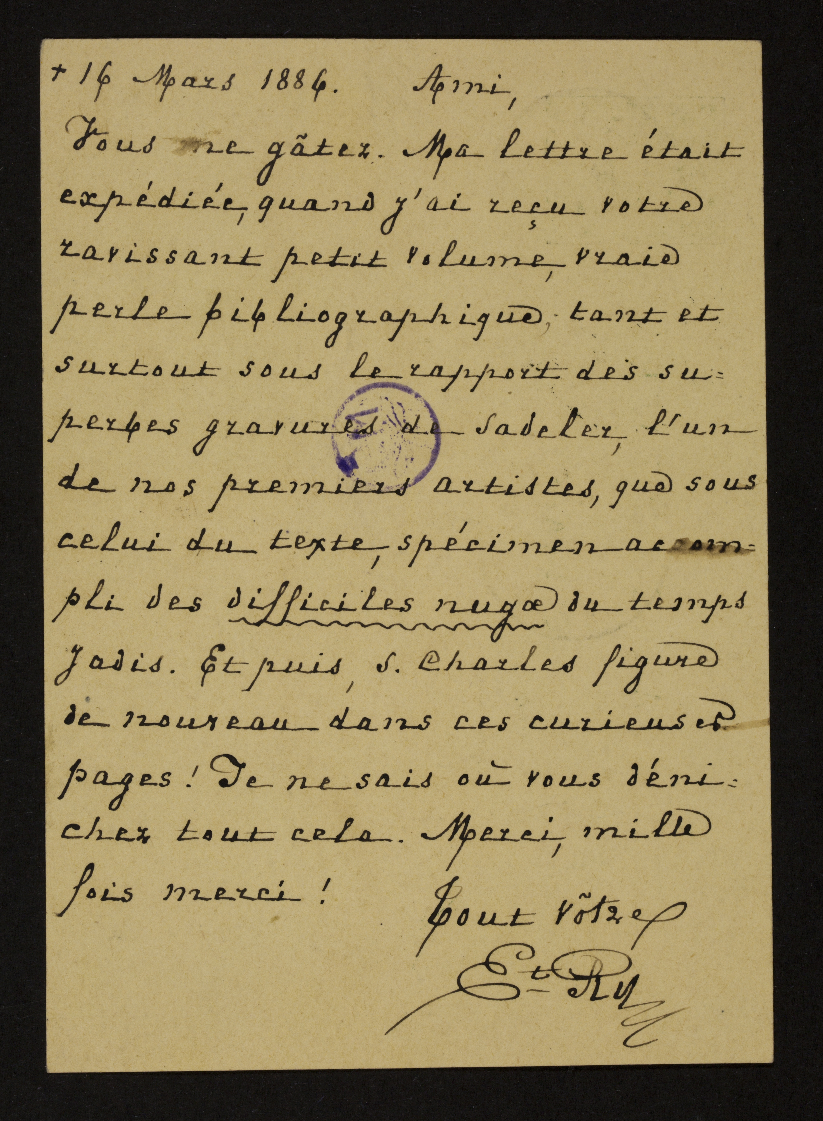 Vous me gâtez. Ma lettre était expédiée, quand j’ai reçu votre ravissant petit volume, vraie perle bibliographique, tant et surtout sous le rapport des superbes gravures de Sadeler,[1] l’un de nos premiers artistes, que sous celui du texte, spécimen accompli des difficiles nugae[2] du temps jadis. Et puis, S. Charles figure de nouveau dans ces curieuses pages![3] Je ne sais où vous dénichez tout cela. Merci, mille fois merci!