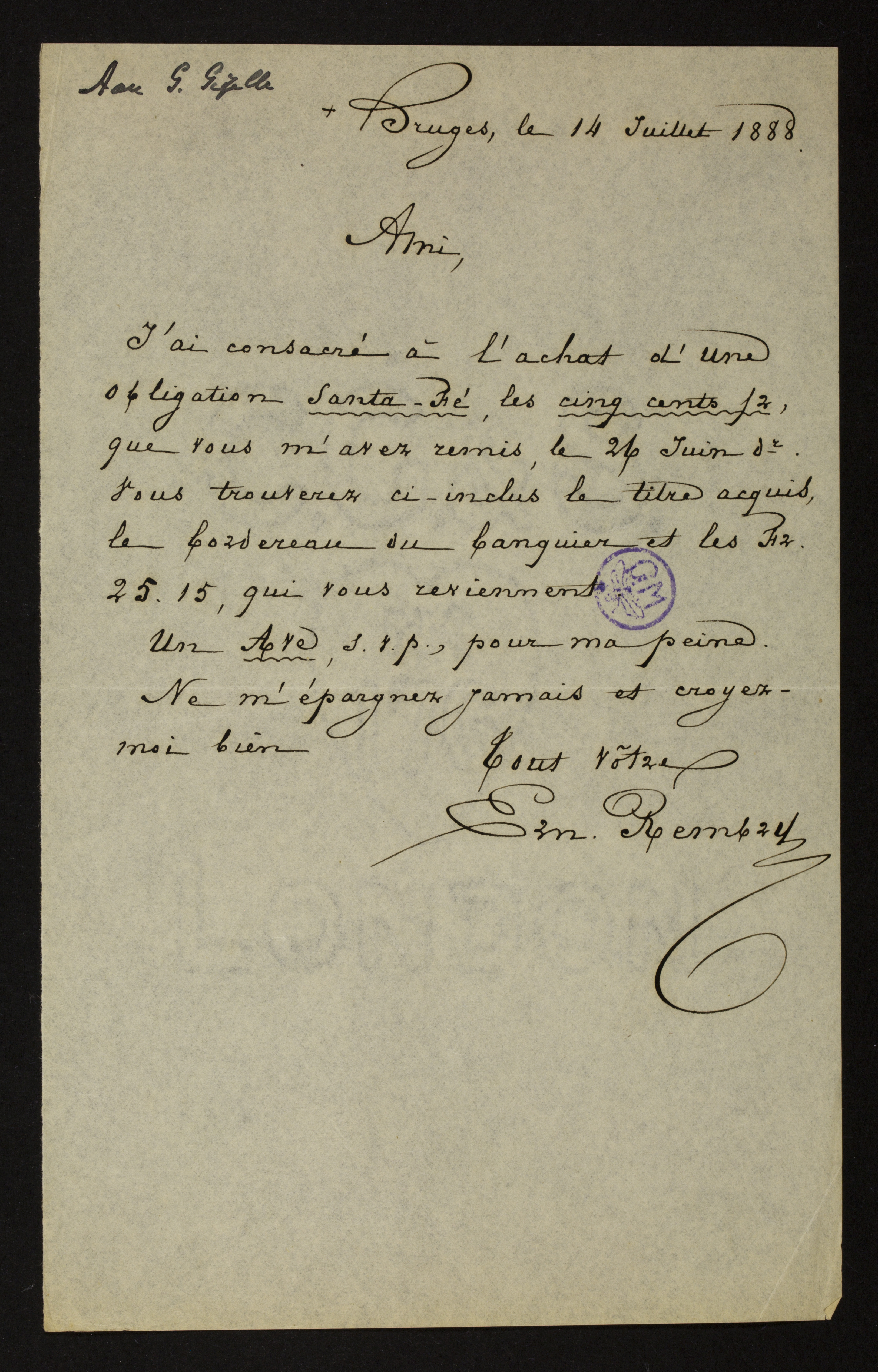 J’ai consacré à l’achat d’une obligation Santa-Fé,[1] les cinq cents fr, que vous m’avez remis, le 26 Juin dernier Vous trouverez ci-inclus le titre acquis, le bordereau du banquier et les Fr. 25.15, qui vous reviennent.[2]