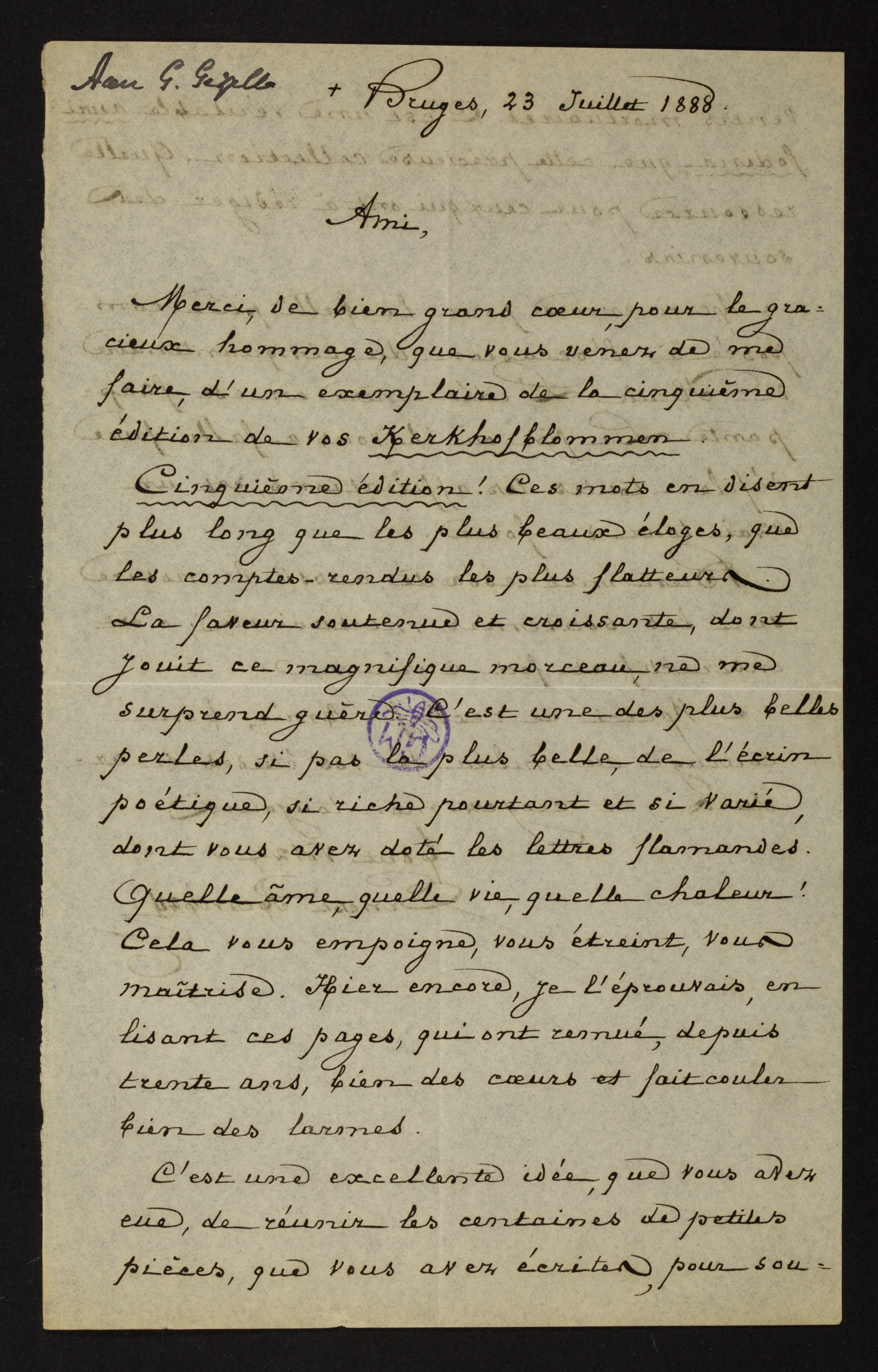 Merci de bien grand cœur, pour le gracieux hommage, que vous venez de me faire, d’un exemplaire de la cinquième édition de vos Kerkhofblommen.[1]