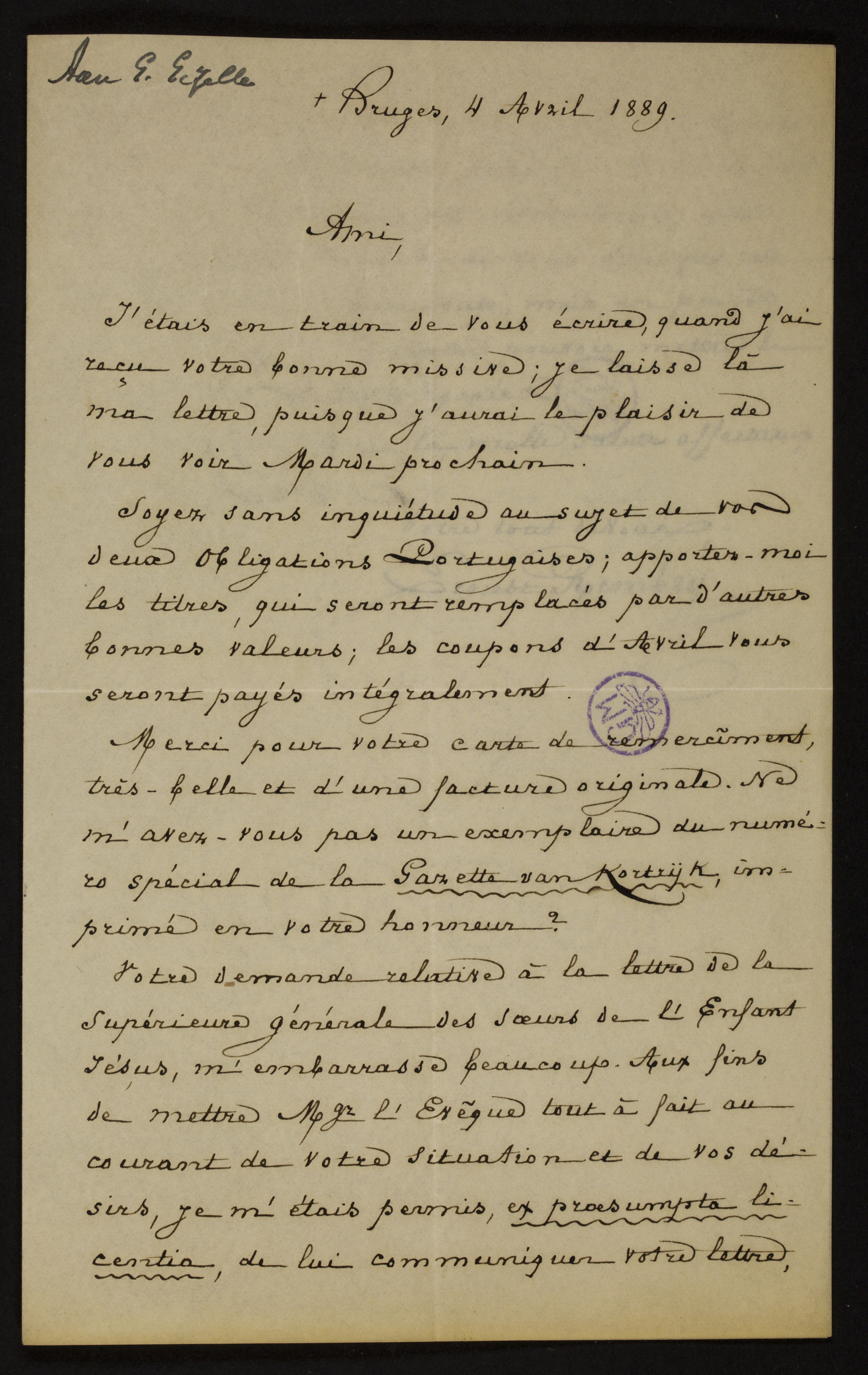 Merci pour votre carte de remercîment, très-belle et d’une facture originale. Ne m’avez-vous pas un exemplaire du numéro spécial de la Gazette van Kortrijk, imprimé en votre honneur?[3]