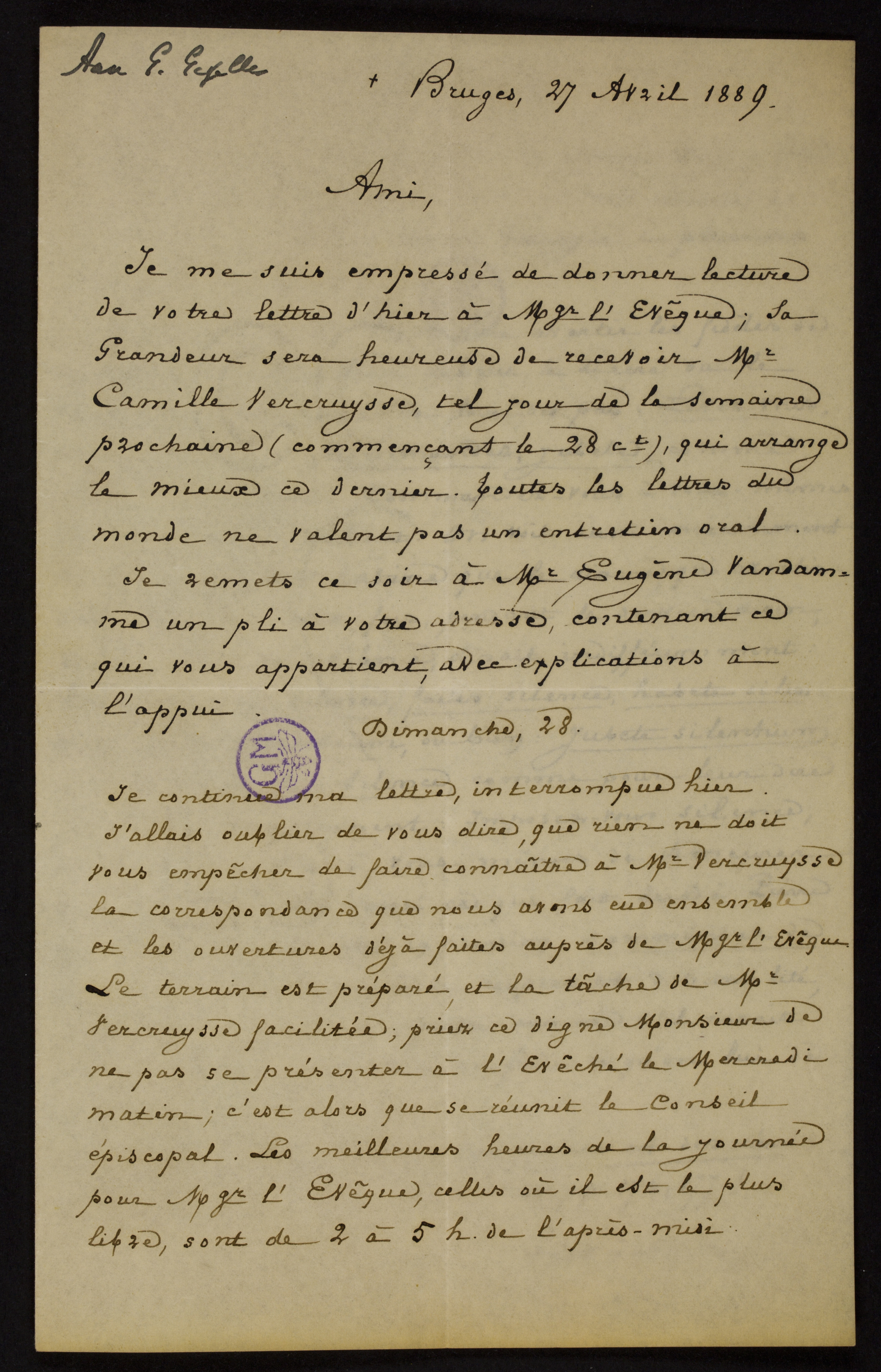 Je me suis empressé de donner lecture de votre lettre d’hier à Mgr l’Evêque; Sa Grandeur sera heureuse de recevoir Mr Camille Vercruysse,[1] tel jour de la semaine prochaine (commençant le 28 ct), qui arrange le mieux ce dernier. Toutes les lettres du monde ne valent pas un entretien oral.