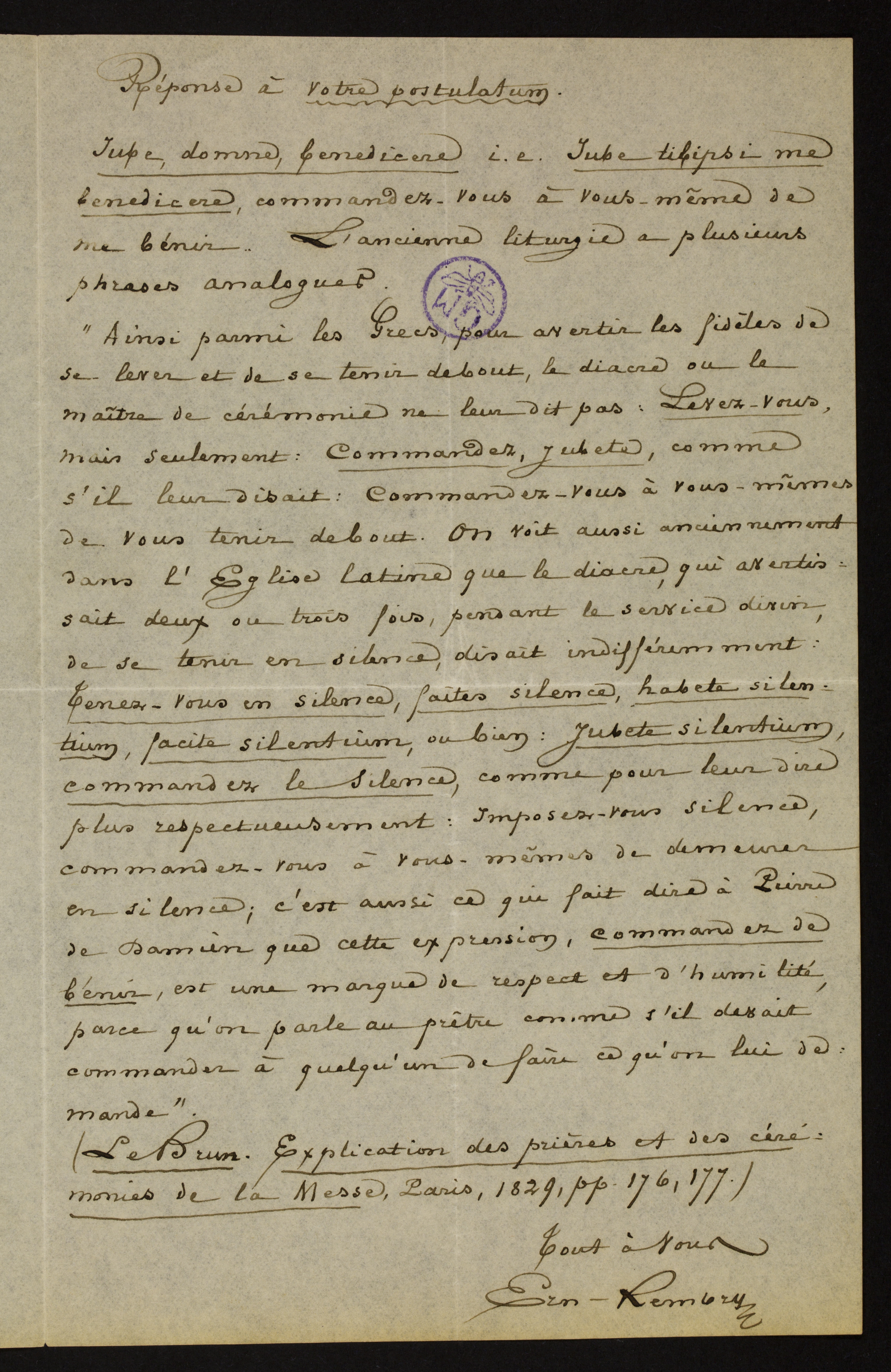 “Ainsi parmi les Grecs, pour avertir les fidèles de se lever et de se tenir debout, le diacre ou le maître de cérémonie ne leur dit pas: Levez-vous, mais seulement: Commandez, jubete, comme s’il leur disait: commandez-vous à vous-mêmes de vous tenir debout. On voit aussi anciennement dans l’Eglise latine que le diacre, qui avertissait deux ou trois fois, pendant le service divin, de se tenir en silence, disait indifféremment: Tenez-vous en silence, faites silence, habete silentium, facite silentium, ou bien: Jubete silentium, commandez le silence, comme pour leur dire plus respectueusement: Imposez-vous silence, commandez-vous à vous-mêmes de demeurer en silence; c’est aussi ce qui fait dire à Pierre de Damien que cette expression, commandez de bénir, est une marque de respect et d’humilité, parce qu’on parle au prêtre comme s’il devait commander à quelqu’un de faire ce qu’on lui demande”.