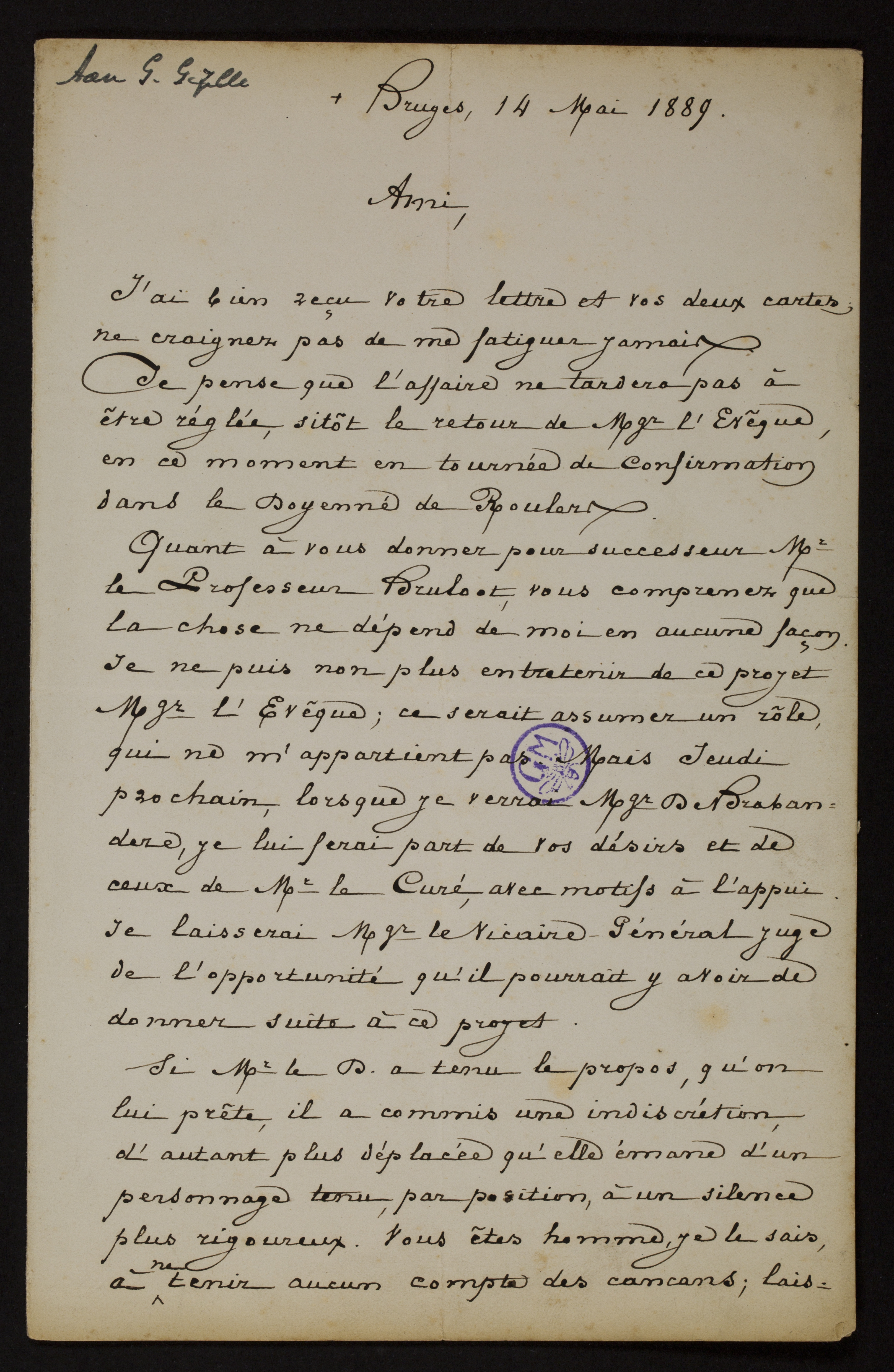 Quant à vous donner pour successeur Mr le Professeur Bruloot, vous comprenez que la chose ne dépend de moi en aucune façon. Je ne puis non plus entretenir de ce projet Mgr l’Evêque; ce serait assumer un rôle, qui ne m’appartient pas. Mais Jeudi prochain, lorsque je verrai Mgr De Brabandere, je lui ferai part de vos désirs et de ceux de Mr le Curé, avec motifs à l’appui. Je laisserai Mgr le Vicaire-Général juge de l’opportunité qu’il pourrait y avoir de donner suite à ce projet.