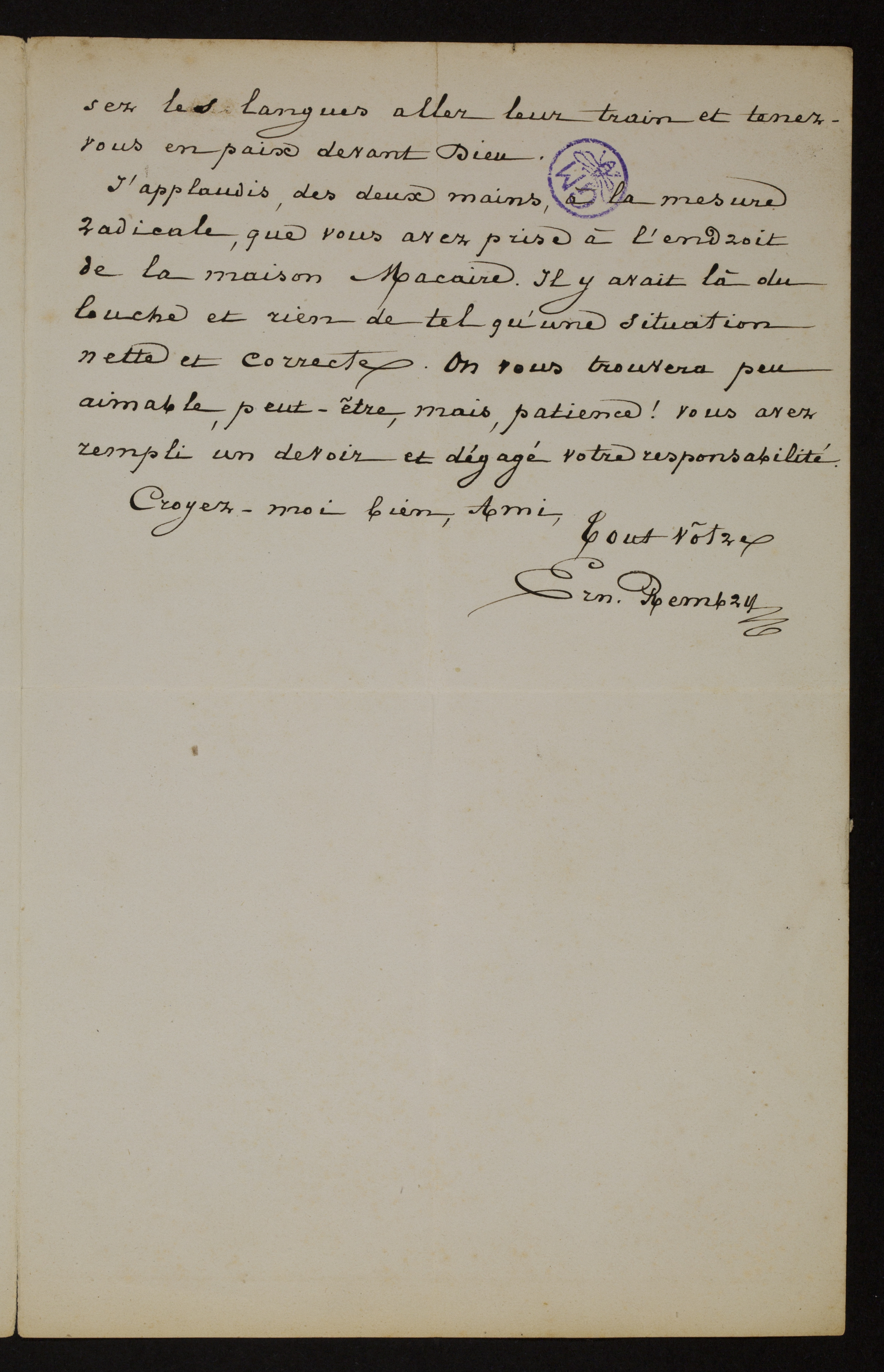 J’applaudis, des deux mains, à la mesure radicale, que vous avez prise à l’endroit de la maison Maison Macaire.[4] Il y avait là du louche et rien de tel qu’une situation nette et correcte. On vous trouvera peu aimable, peut-être, mais, patience! vous avez rempli un devoir et dégagé votre responsabilité.
