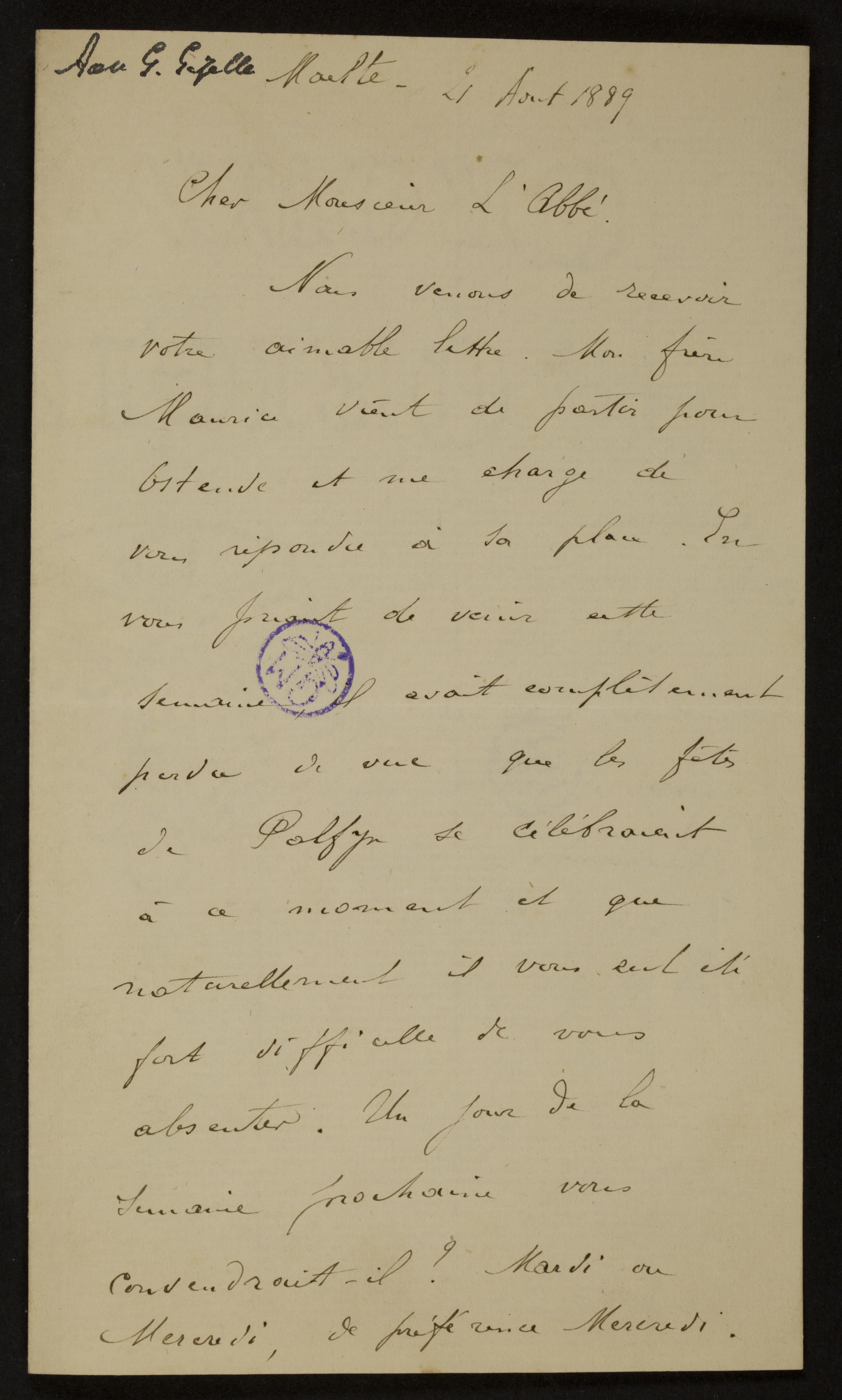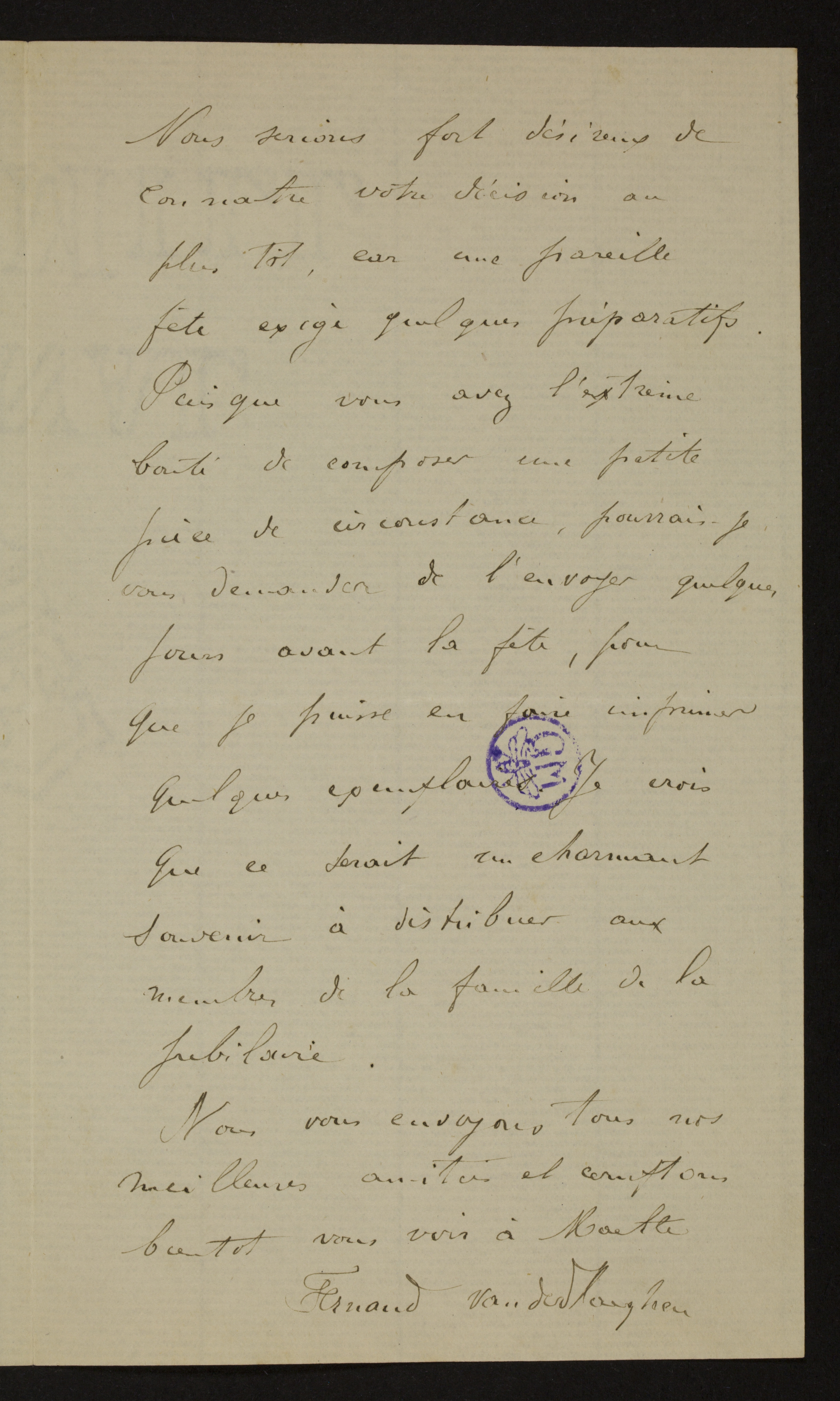 Nous venons de recevoir votre aimable lettre[2] Mon frère Maurice vient de partir pour Ostende et me charge de vous répondre à sa place. En vous priant de venir cette semaine, il avait complètement perdu de vue que les fêtes de Palfyn[3] se célébraient à ce moment et que naturellement il vous eut été fort difficille de vous absenter. Un jour de la semaine prochaine vous conviendrait-il? Mardi ou Mercredi, de préférence Mercredi. p2Nous serions fort désireux de connaitre votre décision au plus tôt, car une pareille fête exige quelques préparatifs. Puisque vous avez l’extrême bonté de composer une petite pièce de circonstance, pourrais-je vous demander de l’envoyer quelques jours avant la fête, pour que je puisse en faire imprimer quelques exemplaires[4] Je crois que ce serait un charmant souvenir à distribuer aux membres de la famille de la jubilaire.