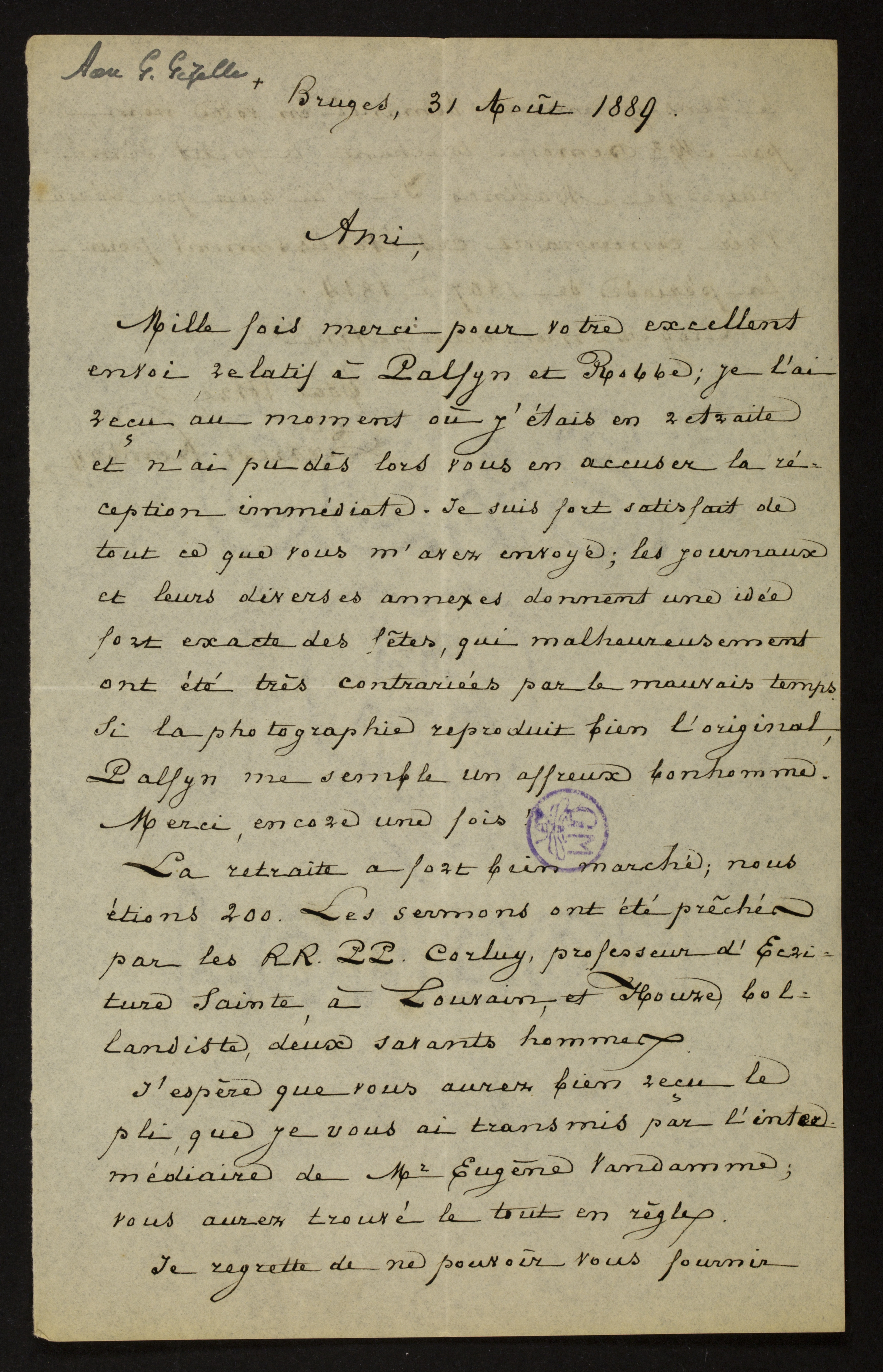 Mille fois merci pour votre excellent envoi relatif à Palfyn et Robbe; je l’ai reçu au moment où j’étais en retraite et n’ai pu dès lors vous en accuser la réception immédiate. Je suis fort satisfait de tout ce que vous m’avez envoyé; les journaux et leurs diverses annexes donnent une idée fort exacte des fêtes, qui malheureusement ont été très contrariées par le mauvais temps. Si la photographie reproduit bien l’original, Palfyn me semble un affreux bonhomme.