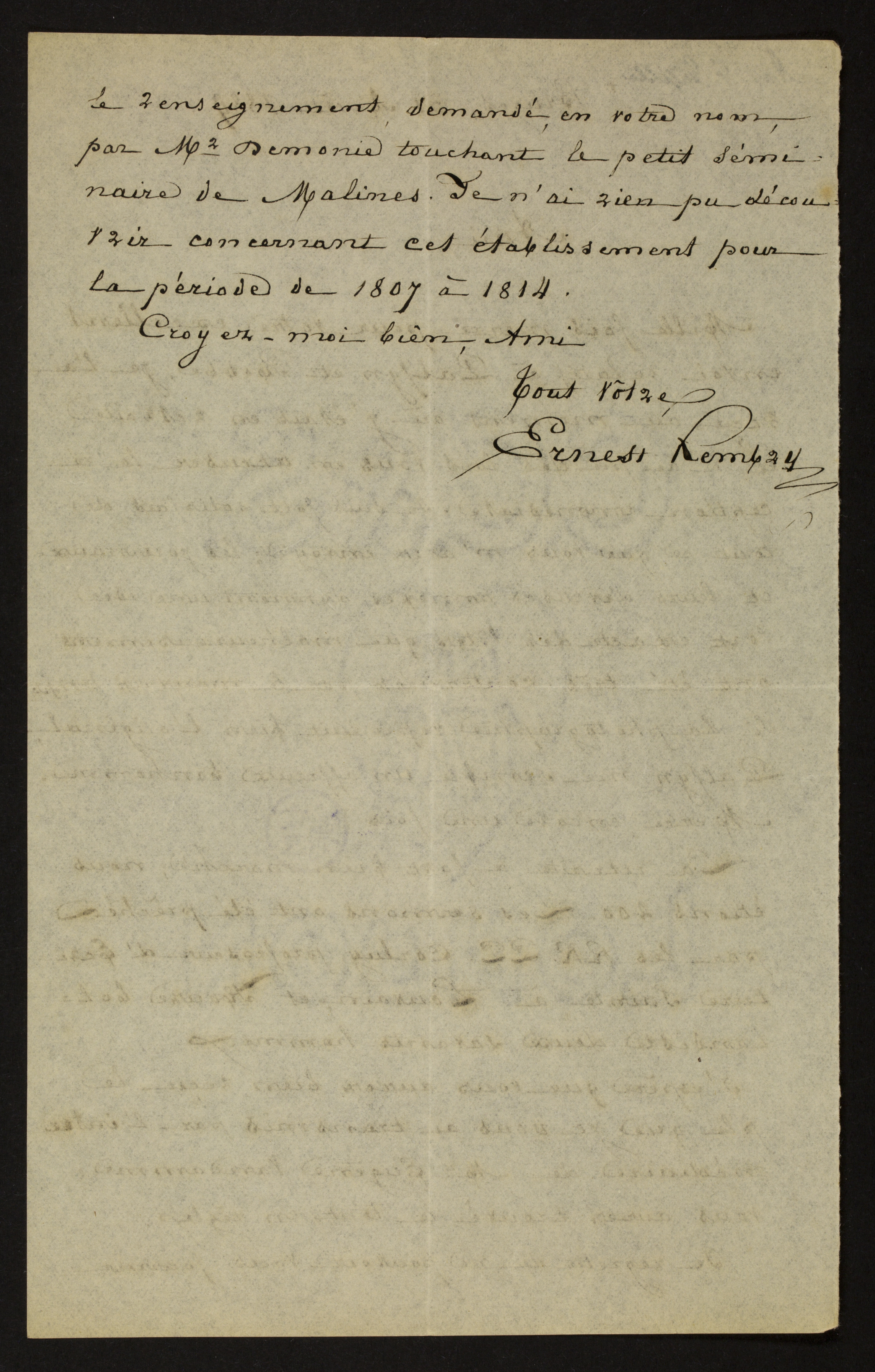 Je regrette de ne pouvoir vous fournirp2le renseignement demandé, en votre nom, par Mr Demonie touchant le petit séminaire de Malines. Je n’ai rien pu découvrir concernant cet établissement pour la période de 1807 à 1814.