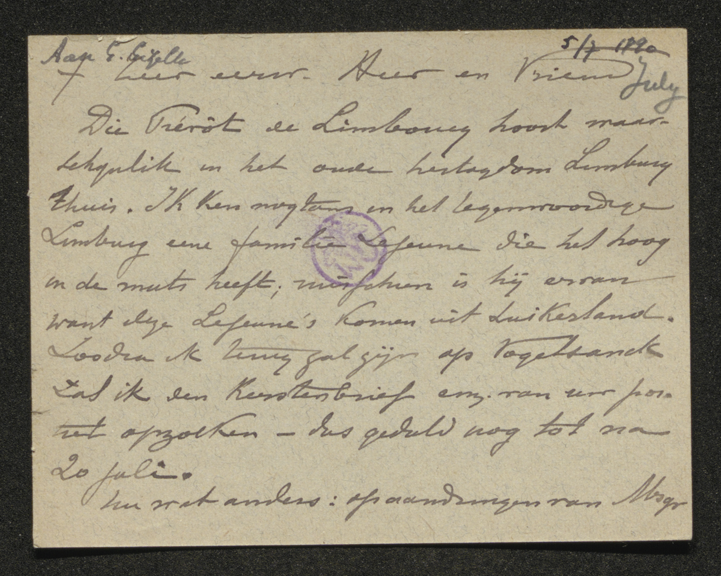 Die Prévôt de Limbourg hoort waarschijnlik in het oude hertogdom Limburg thuis. Ik ken nogtans in het tegenwoordige Limburg eene familie Lejeune[1] die het hoog in de muts heeft; misschien is hij ervan want deze Lejeune's komen uit Luikerland.[2] Zoodra ik terug zal zijn op Vogelsanck[3] zal ik een Kerstenbrief enz. van een portret opzoeken - dus geduld nog tot na 20 juli.