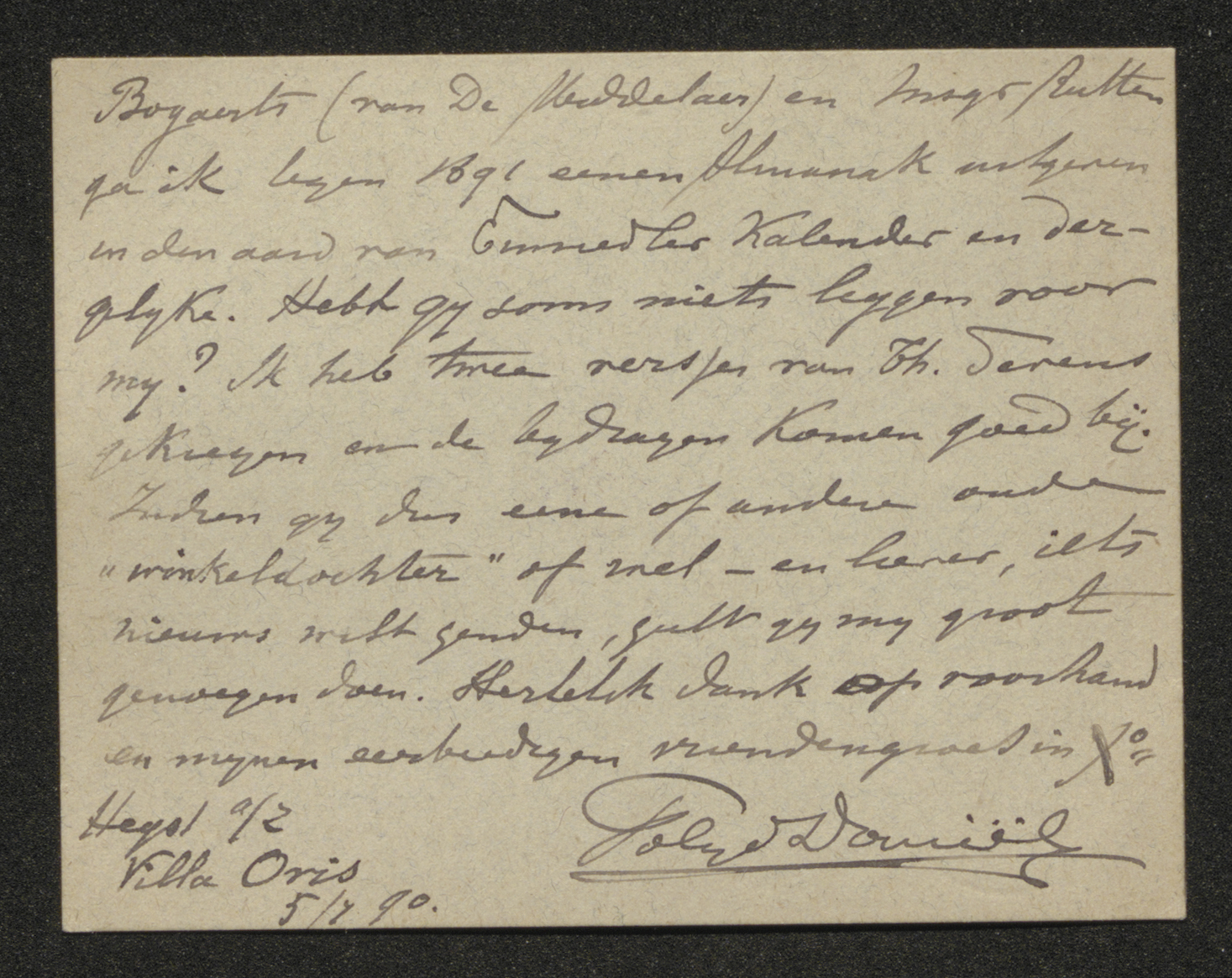 Nu wat anders: op aandringen van Msgr p2Bogaerts (van De Middelaer) en Msgr Rutten ga ik tegen 1891 eenen Almanak uitgeven in den aard van Einsiedler Kalender en dergelijke. Hebt gij soms niets liggen voor mij? Ik heb twee versjes van Th. Sevens gekregen en de bijdragen komen goed bij. Indien gij dus eene of andere oude "winkeldochter"[4] of wel -en liever, iets nieuws wilt zenden, zult gij mij groot genoegen doen.
