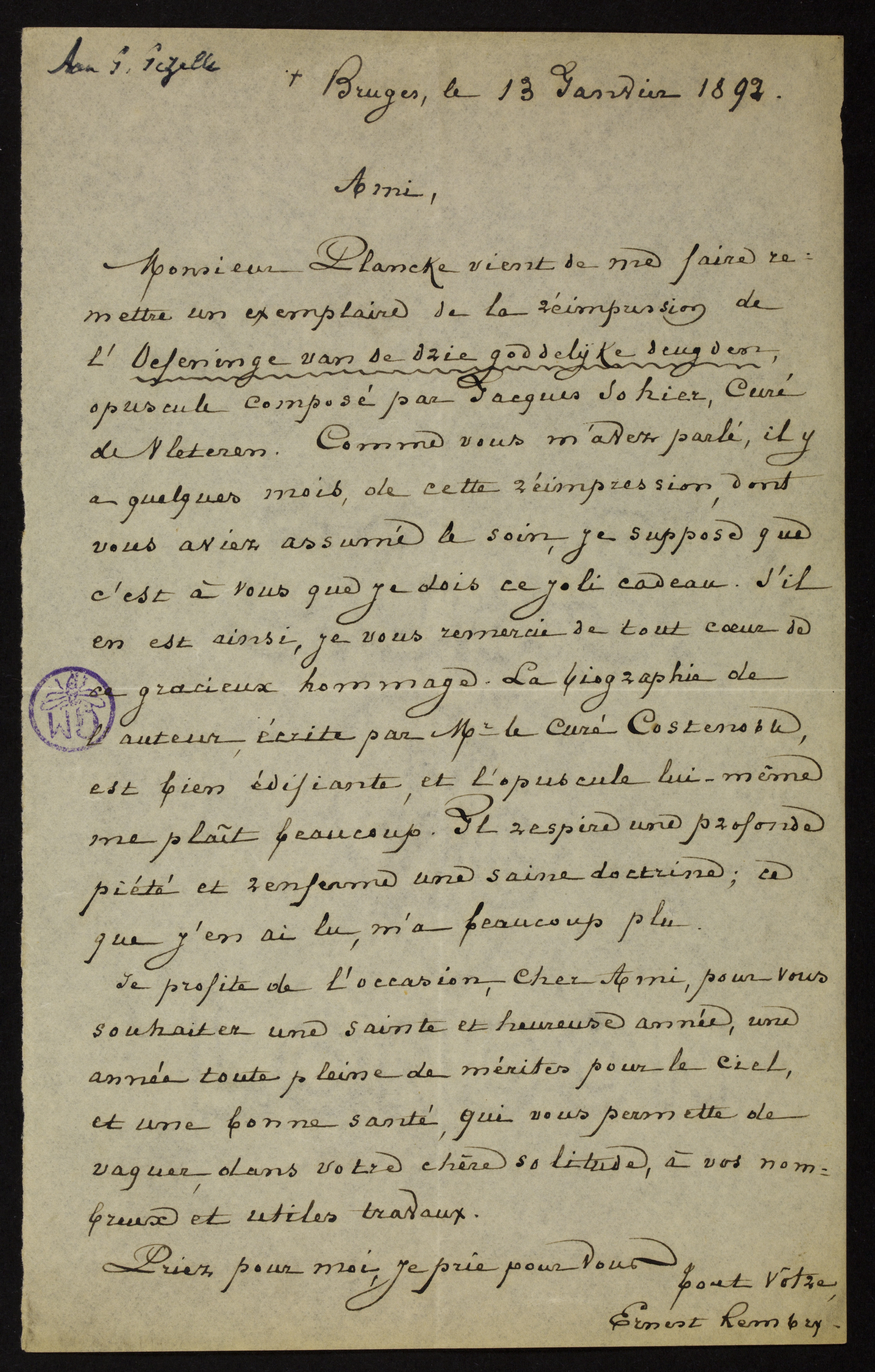 Monsieur Plancke vient de me faire remettre un exemplaire de la réimpression de l’Oefeninge van de drie goddelijke deugden, opuscule composé par Jacques Sohier, Curé de Vleteren.[1] Comme vous m’avez parlé, il y a quelques mois, de cette réimpression, dont vous aviez assumé le soin, je suppose que c’est à vous que je dois ce joli cadeau. S’il en est ainsi, je vous remercie de tout cœur de ce gracieux hommage. La biographie de l’auteur, écrite par Mr le Curé Costenoble, est bien édifiante, et l’opuscule lui-même me plaît beaucoup. Il respire une profonde piété et renferme une saine doctrine; ce que j’en ai lu, m’a beaucoup plu.