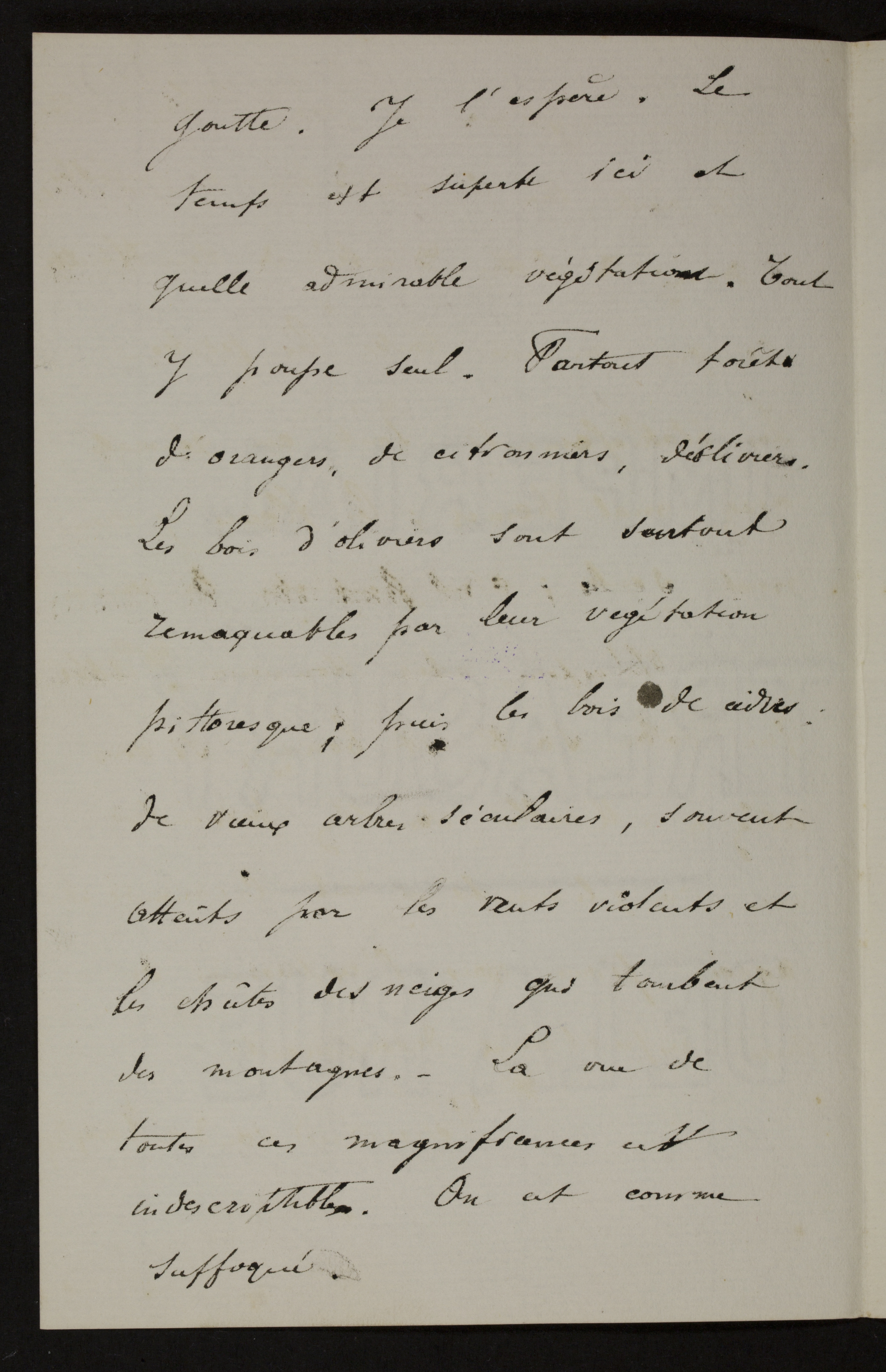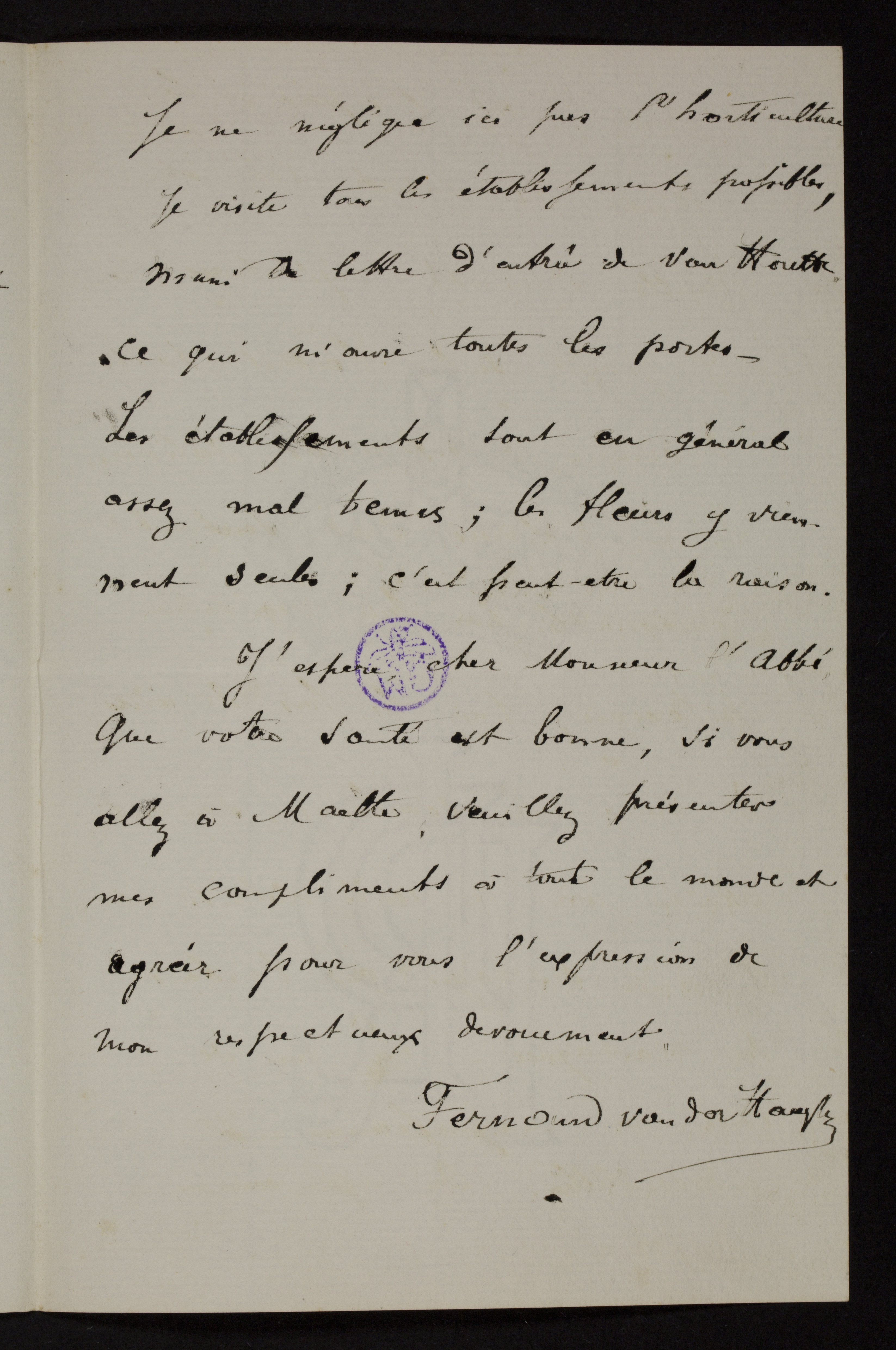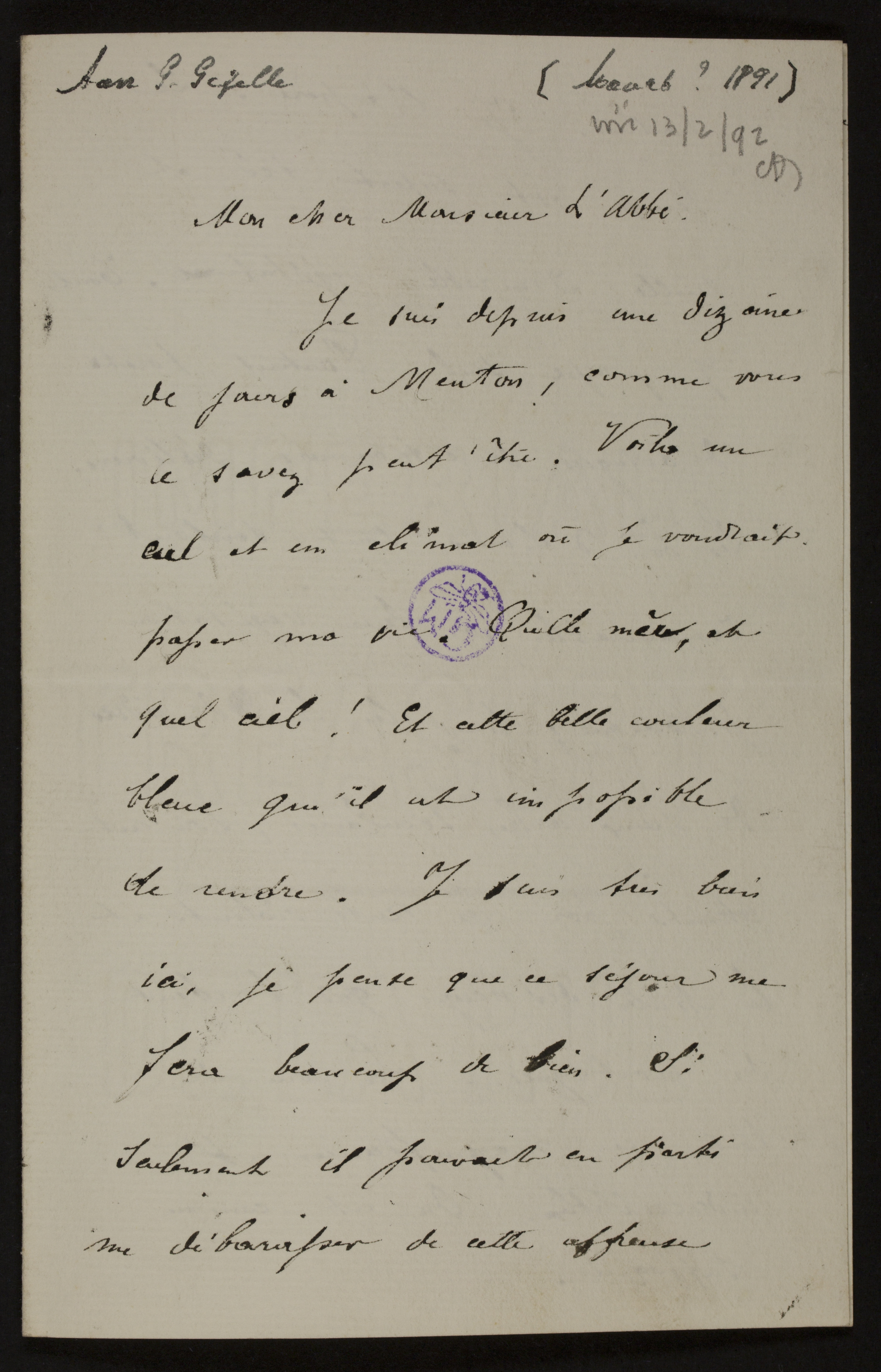 Je suis depuis une dizaine de jours à Menton, comme vous le savez peut’être. Voila un ciel et un climat où je voudrait passer ma vie. Quelle mèr, et quel ciel! Et cette belle couleur bleue qu’il est impossible de rendre. Je suis tres bien ici, je pense que ce séjour me fera beaucoup de bien. Si seulement il pouvait en parti me débarasser de cette affreusep2goutte. Je l’espère. Le temps est superbe ici et quelle admirable végétation. Tout y pousse seul. Partout forêts d’orangers, de citronniers, d’oliviers. Les bois d’oliviers sont surtout remarquables par leur vegétation pittoresque; puis les bois de cèdres: de vieux arbres séculaires, souvent atteints par les vents violents et les chûtes des neiges qui tombent des montagnes. - La vue de toutes ces magnificences est indescriptible. On est comme suffoqué.p3Je ne néglige ici pas l’horticulture. Je visite tous les établissements possibles, muni de lettre d’entrée de Van Houtte, ce qui m’ouvre toutes les portes -