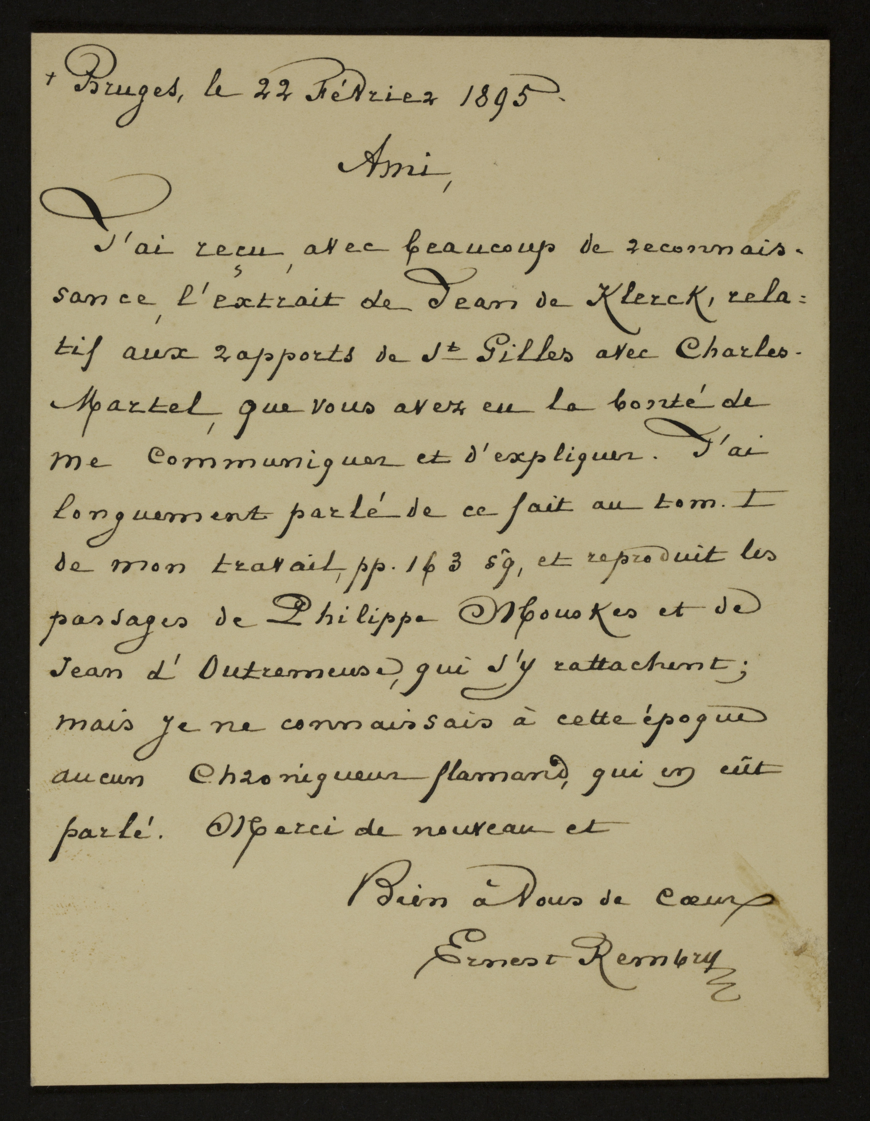 J’ai reçu, avec beaucoup de reconnaissance, l’extrait de Jean de Klerck, relatif aux rapports de St Gilles[1] avec Charles-Martel, que vous avez eu la bonté de me communiquer et d’expliquer. J’ai longuement parlé de ce fait au tom. I de mon travail, pp. 163 sequentes,[2] et reproduit les passages de Philippe Mouskes et de Jean d’Outremeuse, qui s’y rattachent; mais je ne connaissais à cette époque aucun Chroniqueur flamand, qui en eût parlé. Merci de nouveau et