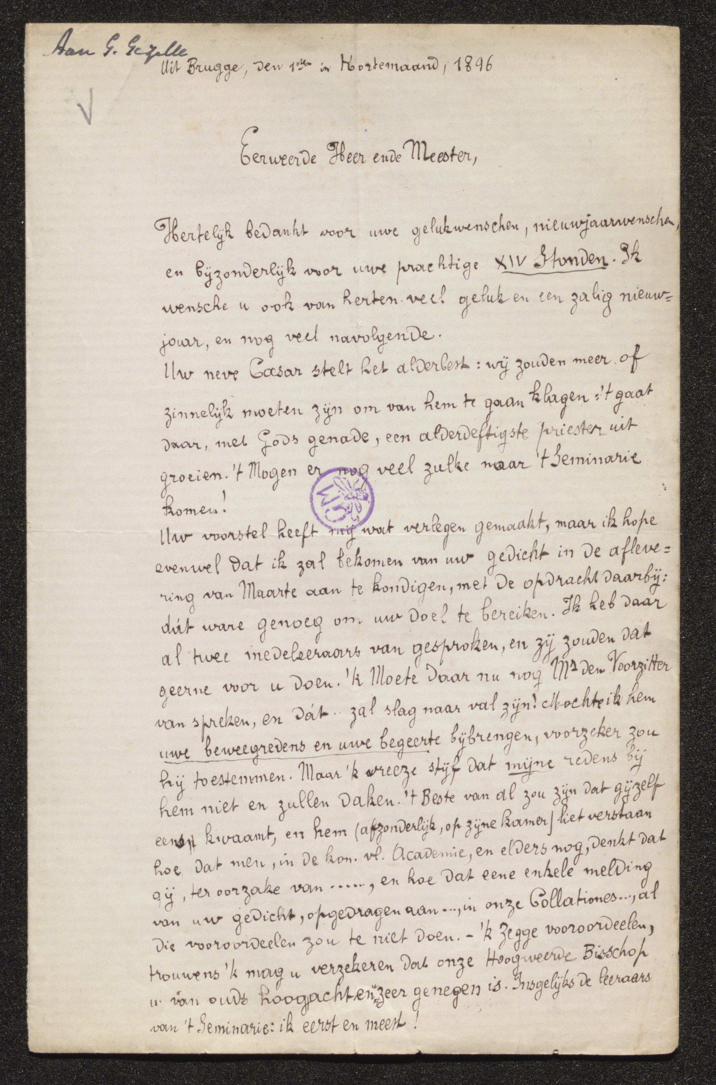 [1] Guido Gezelle was niet naar de aanstelling van G.J. Waffelaert tot bisschop geweest op 28 juni 1895. Dat gaf aanleiding tot roddels, tot in de Academie. Gezelle wou dit euvel rechtzetten en de ‘XIV stonden’ aan de bisschop opdragen en laten verschijnen in tijdschrift Collationes. De opdracht in ‘XIV stonden’ luidt: ‘Met oorlof zijner Vaderlijke toegevendheid, opgedragen aan Mijn Hoogweerdigsten Heere, Dr. G.J. Waffelaert, den 22sten Bisschop van Brugge’. In deze brief antwoordt G. Vandeputte diplomatisch dat hij het gedicht in het nummer van maart van Collationes zal proberen aan te kondigen. Hij heeft er al twee ‘medeleeraars’ over gesproken. Maar hij moet de voorzitter of ‘President’ van het grootseminarie, Henri Vanden Berghe nog om toestemming vragen. Vandeputte raadt Gezelle aan om zelf naar Brugge te komen en te lunchen bij de leraars van het grootseminarie en bij de voorzitter op zijn eigen kamer in audiëntie te gaan en die toestemming te vragen. Hij troost Gezelle verder in zijn brief door erop te wijzen dat de bisschop hem zeker acht en ‘zeer genegen’ is.