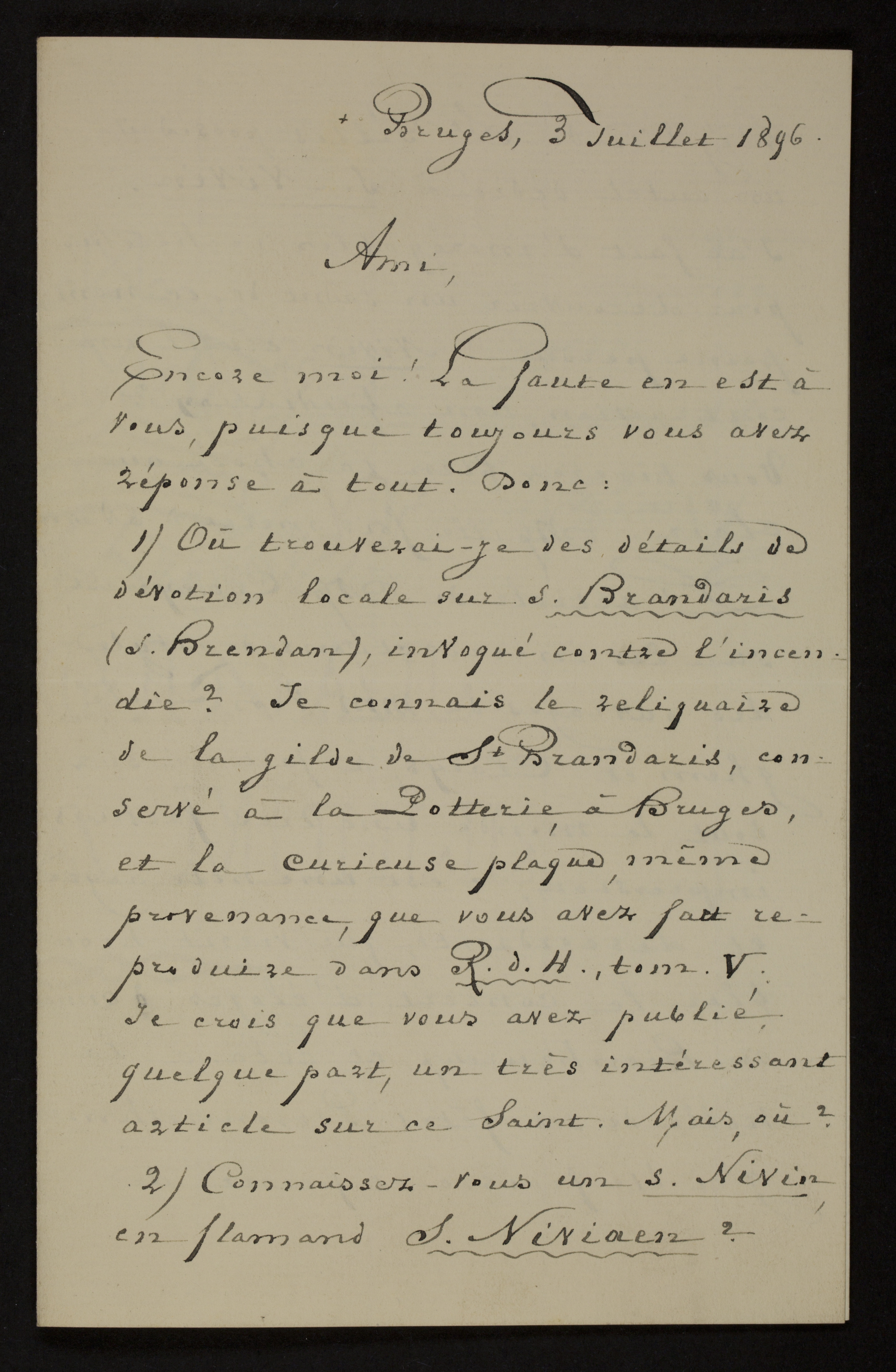 1) Où trouverai-je des détails de dévotion locale sur S. Brandaris (S. Brendan), invoqué contre l’incendie? Je connais le reliquaire de la gilde de St Brandaris, conservé à la Potterie, à Bruges, et la curieuse plaque, même provenance, que vous avez fait reproduire dans R.d.H., tom. V.[1] Je crois que vous avez publié quelque part, un très intéressant article sur ce Saint. Mais, où?[2]