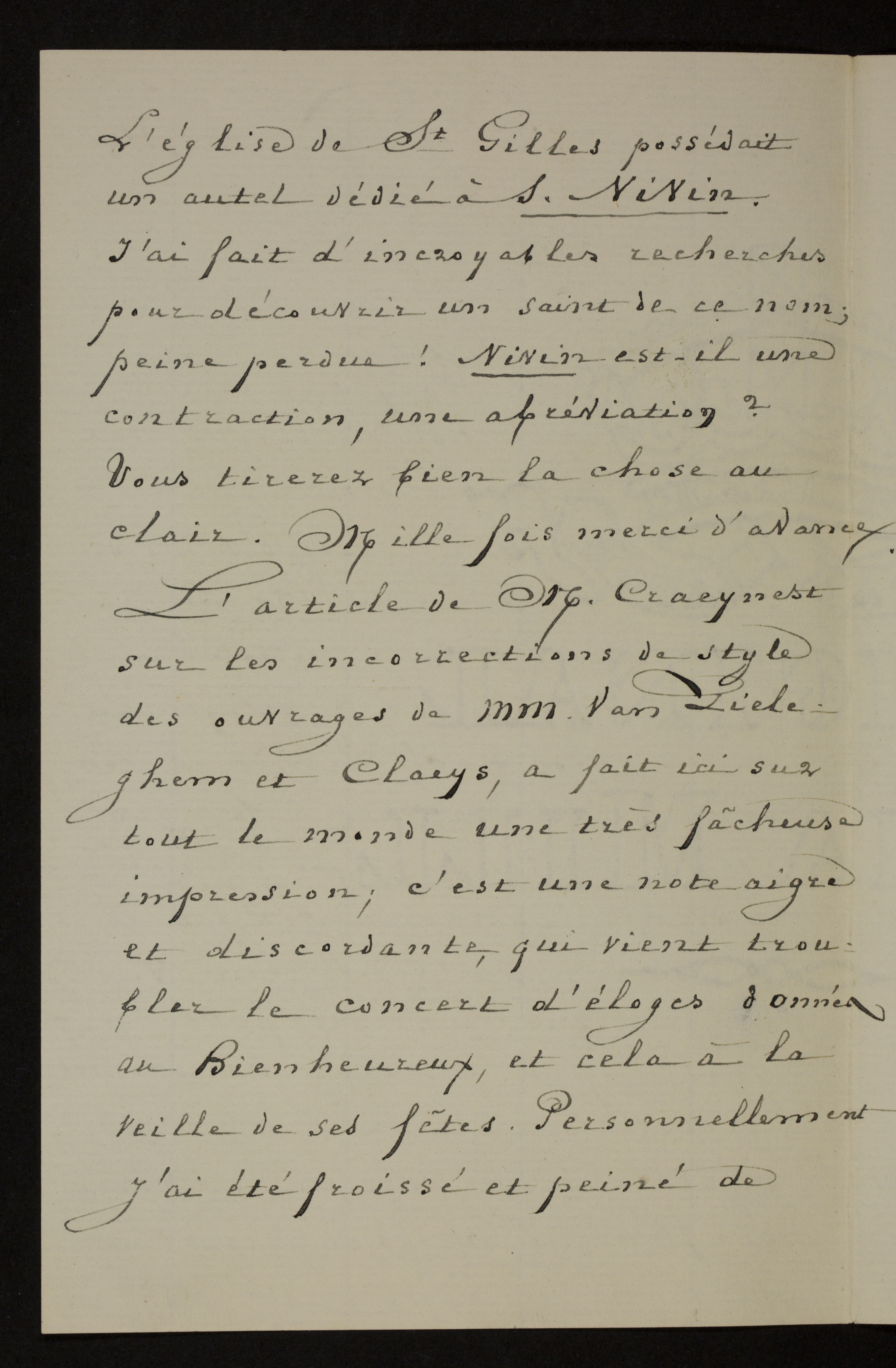 2) Connaissez-vous un S. Nivin, en flamand S. Niviaen?[3]p2L’église de St Gilles possédait un autel dédié à S. Nivin. J’ai fait d’incroyables recherches pour découvrir un saint de ce nom; peine perdue! Nivin est-il une contraction, une abréviation? Vous tirerez bien la chose au clair. Mille fois merci d’avance.