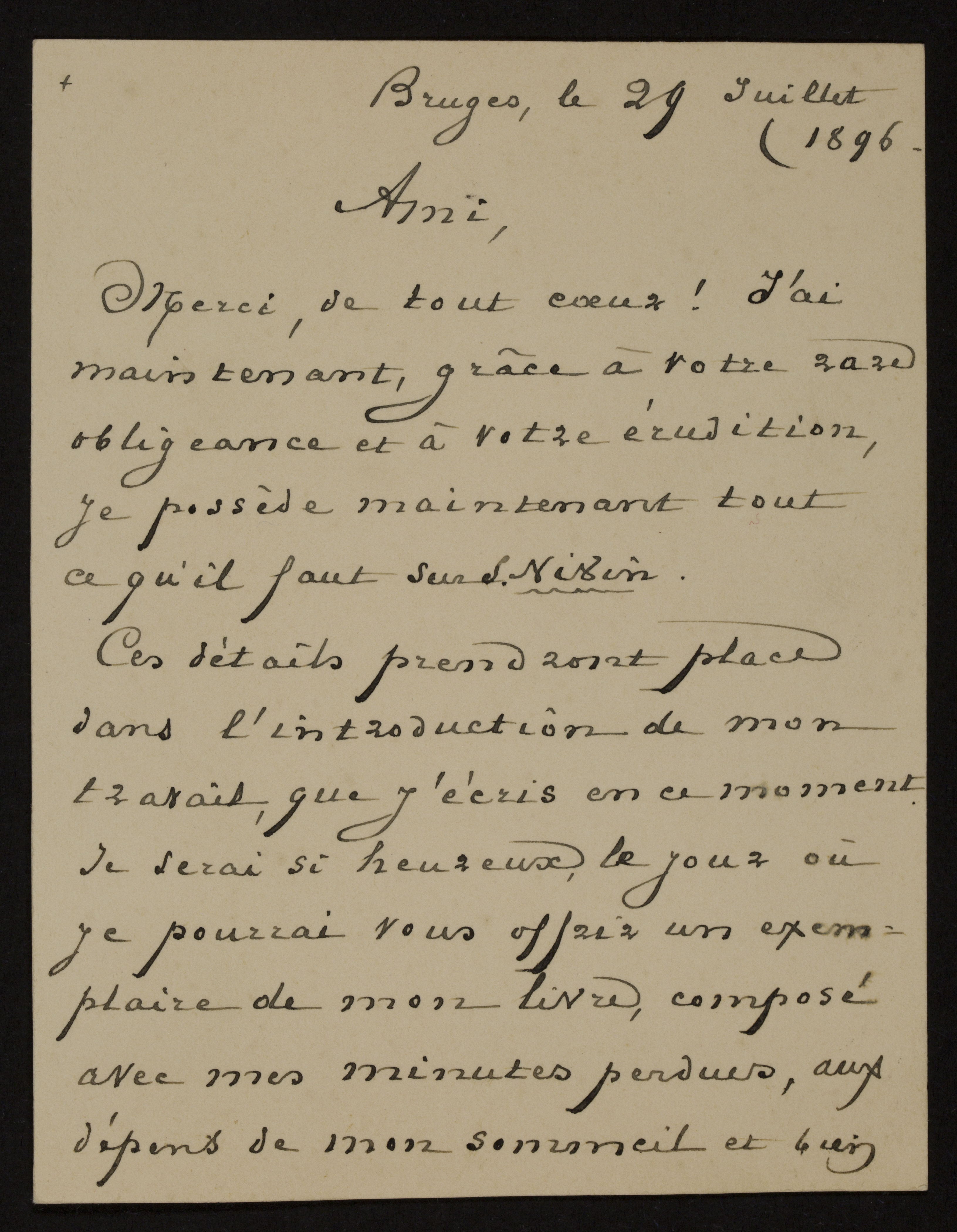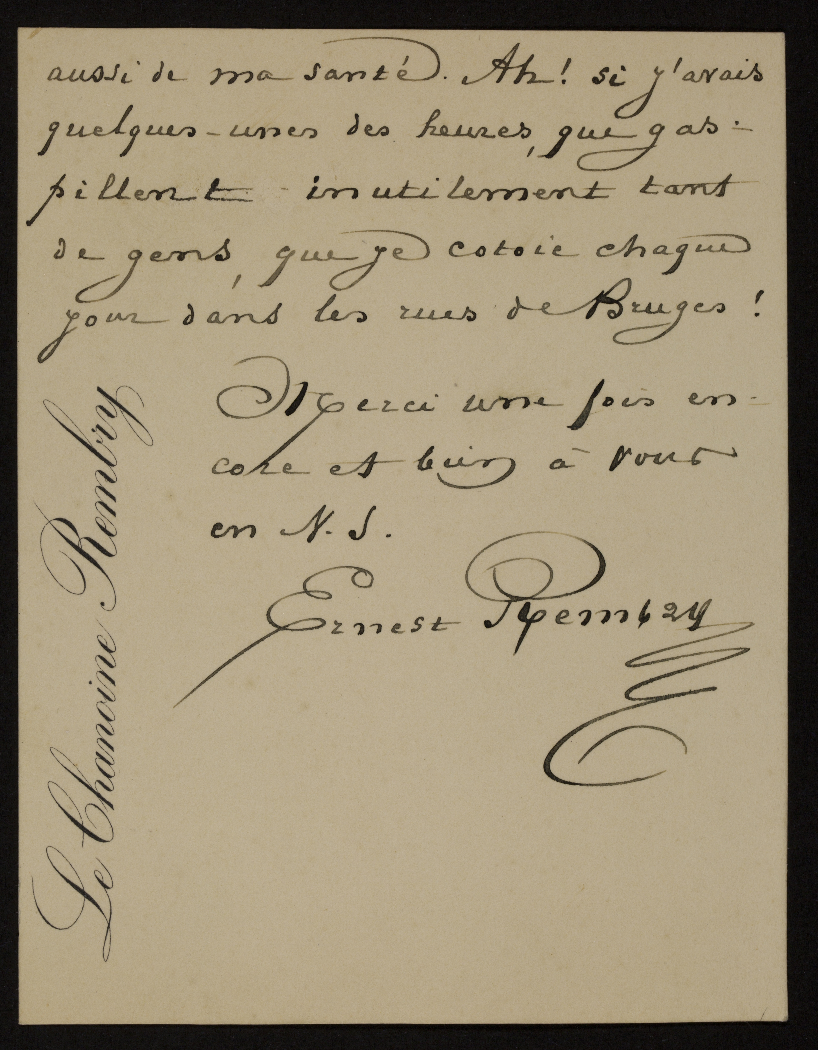 Ces détails prendront place dans l’introduction de mon travail, que j’écris en ce moment. Je serai si heureux, le jour où je pourrai vous offrir un exemplaire de mon livre, composé avec mes minutes perdues, aux dépens de mon sommeil et bienp2aussi de ma santé. Ah! si j’avais quelques-unes des heures, que gaspillent inutilement tant de gens, que je cotoie chaque jour dans les rues de Bruges!
