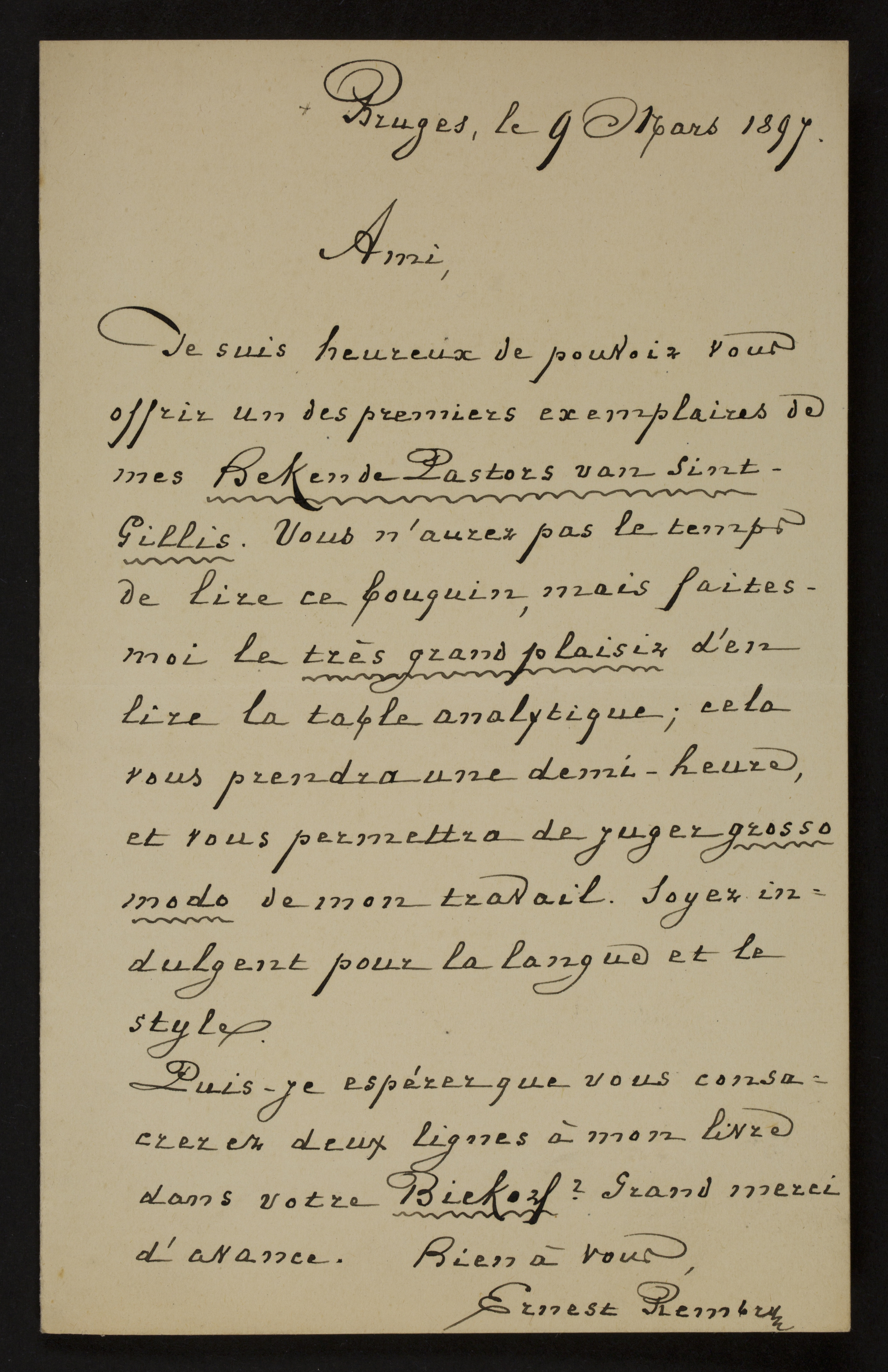 Je suis heureux de pouvoir vous offrir un des premiers exemplaires de mes Bekende Pastors van Sint-Gillis. Vous n’aurez pas le temps de lire ce bouquin, mais faites-moi le très grand plaisir d’en lire la table analytique; cela vous prendra une demi-heure, et vous permettra de juger grosso modo de mon travail. Soyez indulgent pour la langue et le style.[1]
