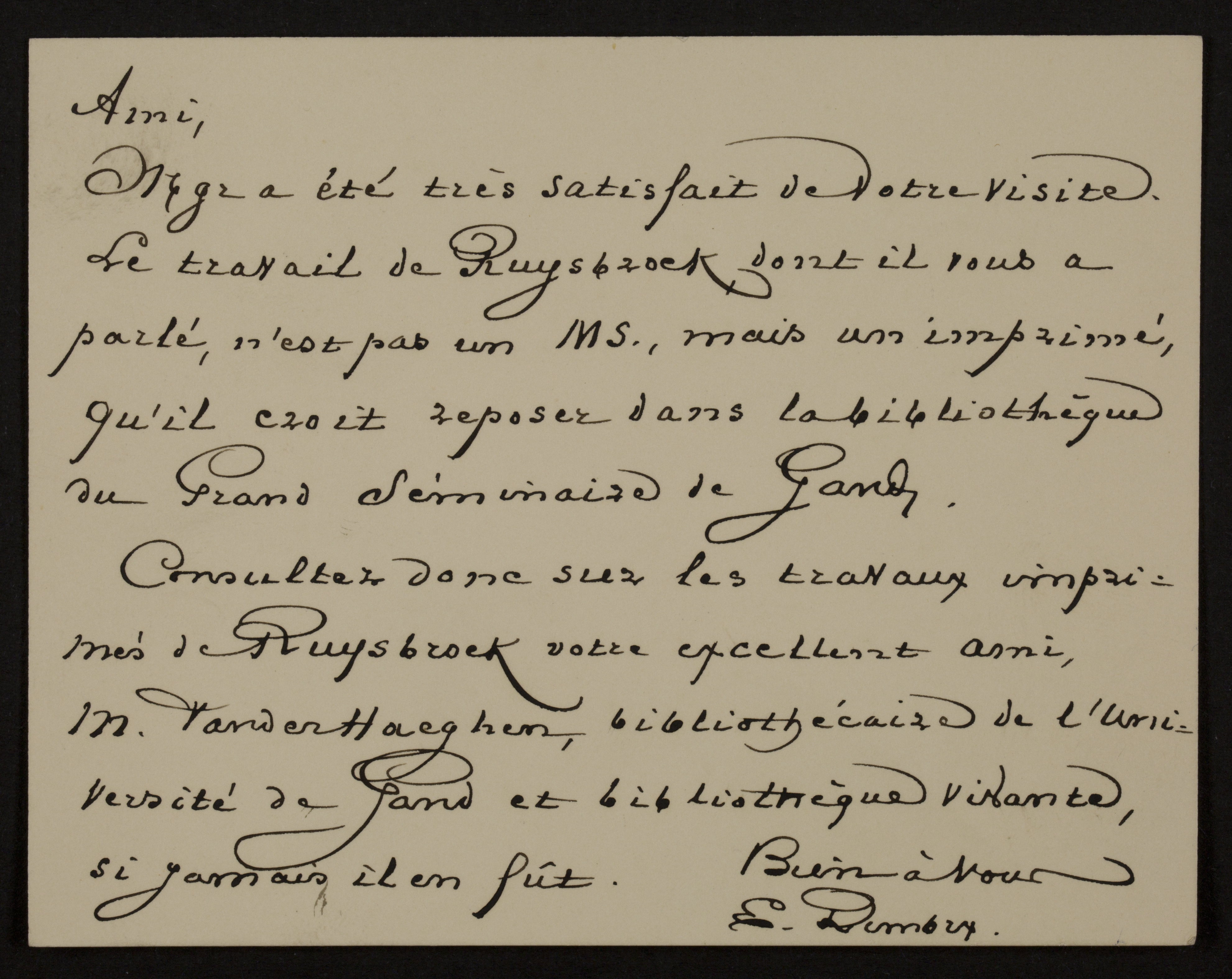 Mgr a été très satisfait de votre visite.[1] Le travail de Ruysbroek, dont il vous a parlé,[2] n’est pas un Manuscrit, mais un imprimé, qu’il croit reposer dans la bibliothèque du Grand Séminaire de Gand.