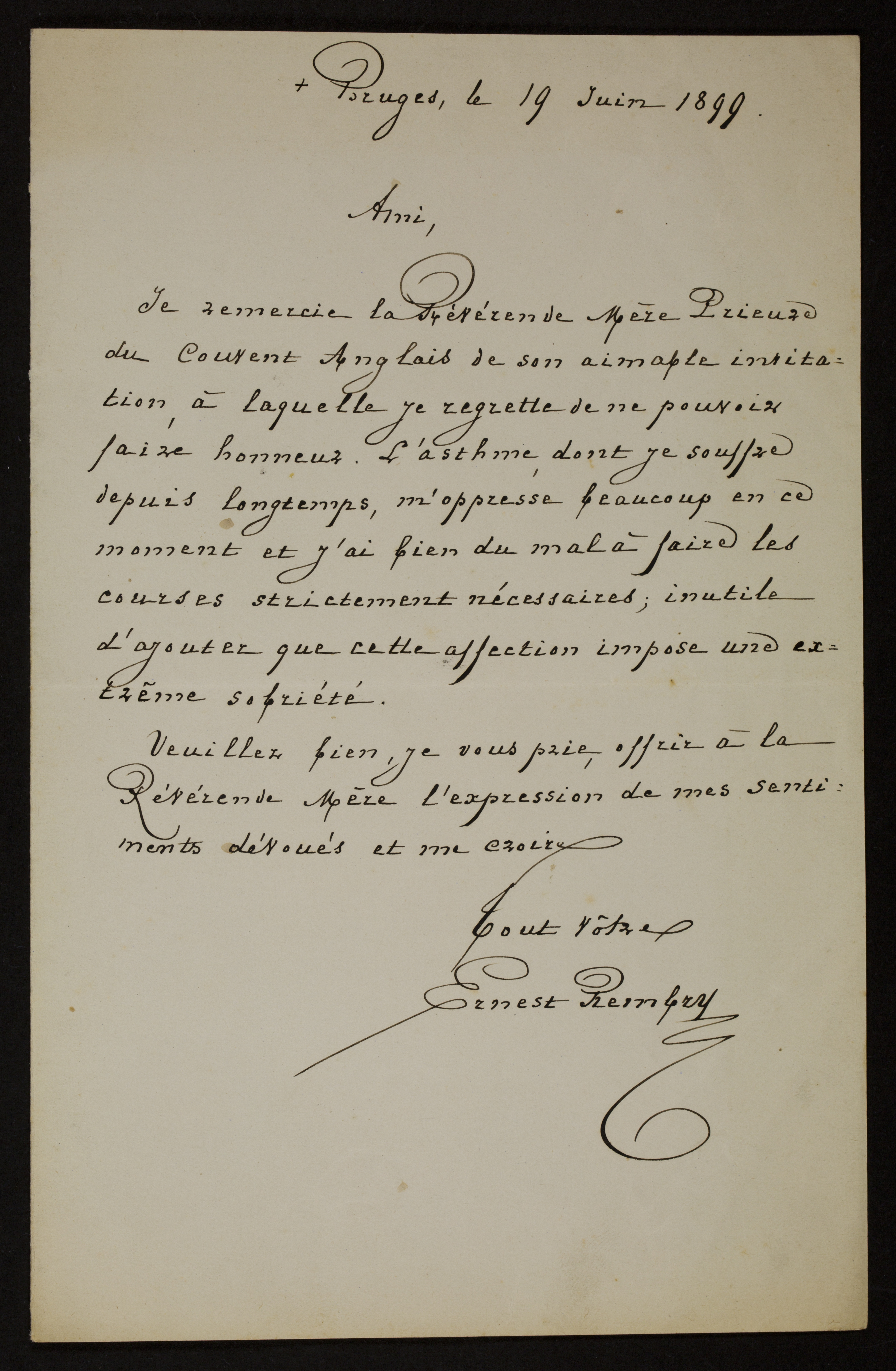 Je remercie la Révérende Mère Prieure du Couvent Anglais de son aimable invitation, à laquelle je regrette de ne pouvoir faire honneur. L’asthme, dont je souffre depuis longtemps, m’oppresse beaucoup en ce moment et j’ai bien du mal à faire les courses strictement nécessaires; inutile d’ajouter que cette affection impose une extrême sobriété.