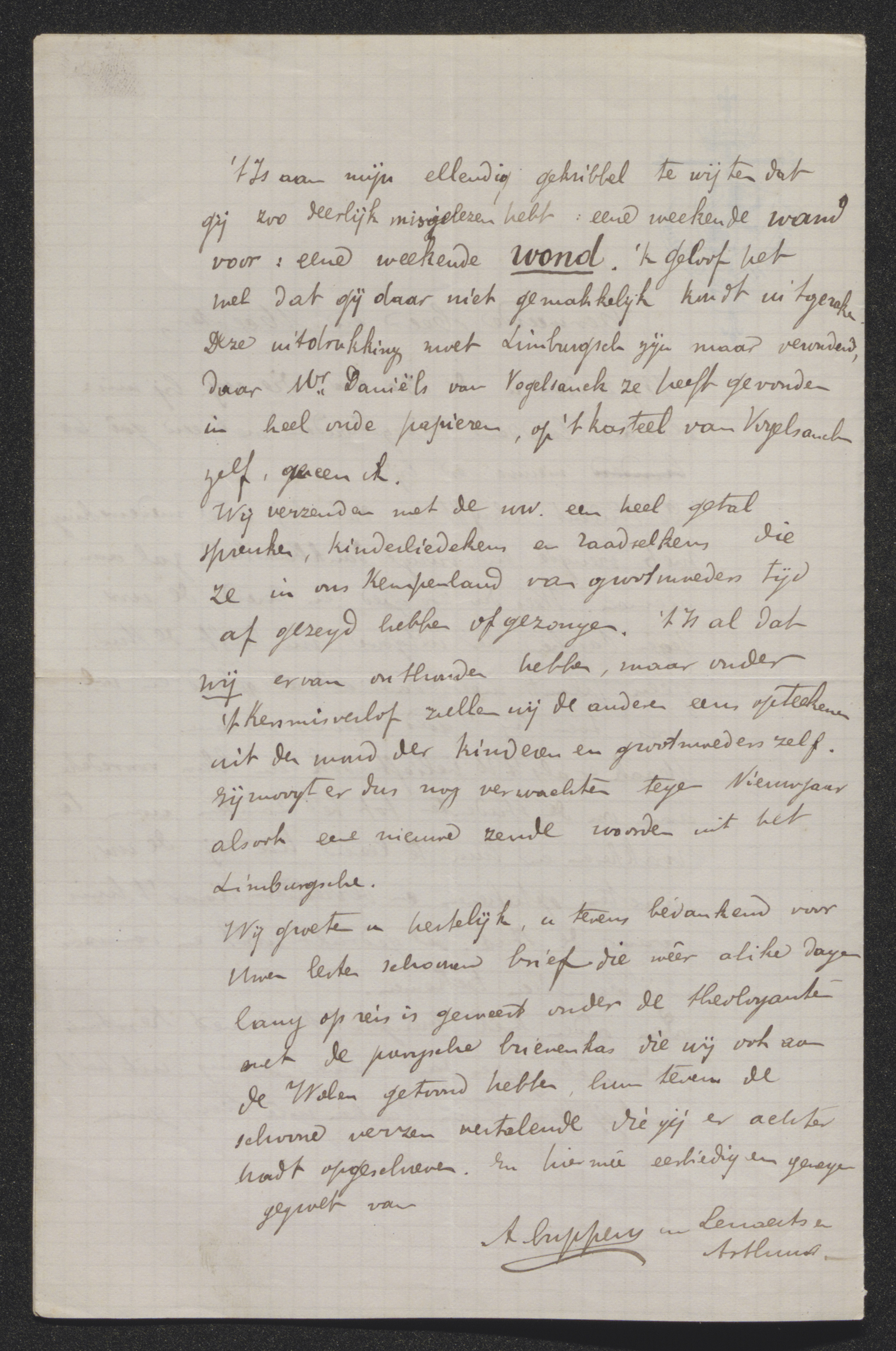 Den ouden boek[2] brengt Arthur met Kerstmis meê, als gij er dan uwen honing uit trekt kunt gij hem tegen Paschen meê terug geven.[3]p2't Is aan mijn ellendig gekribbel te wijten dat gij zoo deerlijk misgelezen hebt: eene weekende wand voor: eene weekende wond.[4] k geloof het wel dat gij daar niet gemakkelijk kundt uitgeraken. Deze uitdrukking moet Limburgsch zijn maar verouderd, daar Mr Daniëls van Vogelsanck ze heeft gevonden in heel oude papieren, op 't kasteel van Vogelsanck zelf,[5] meen ik.