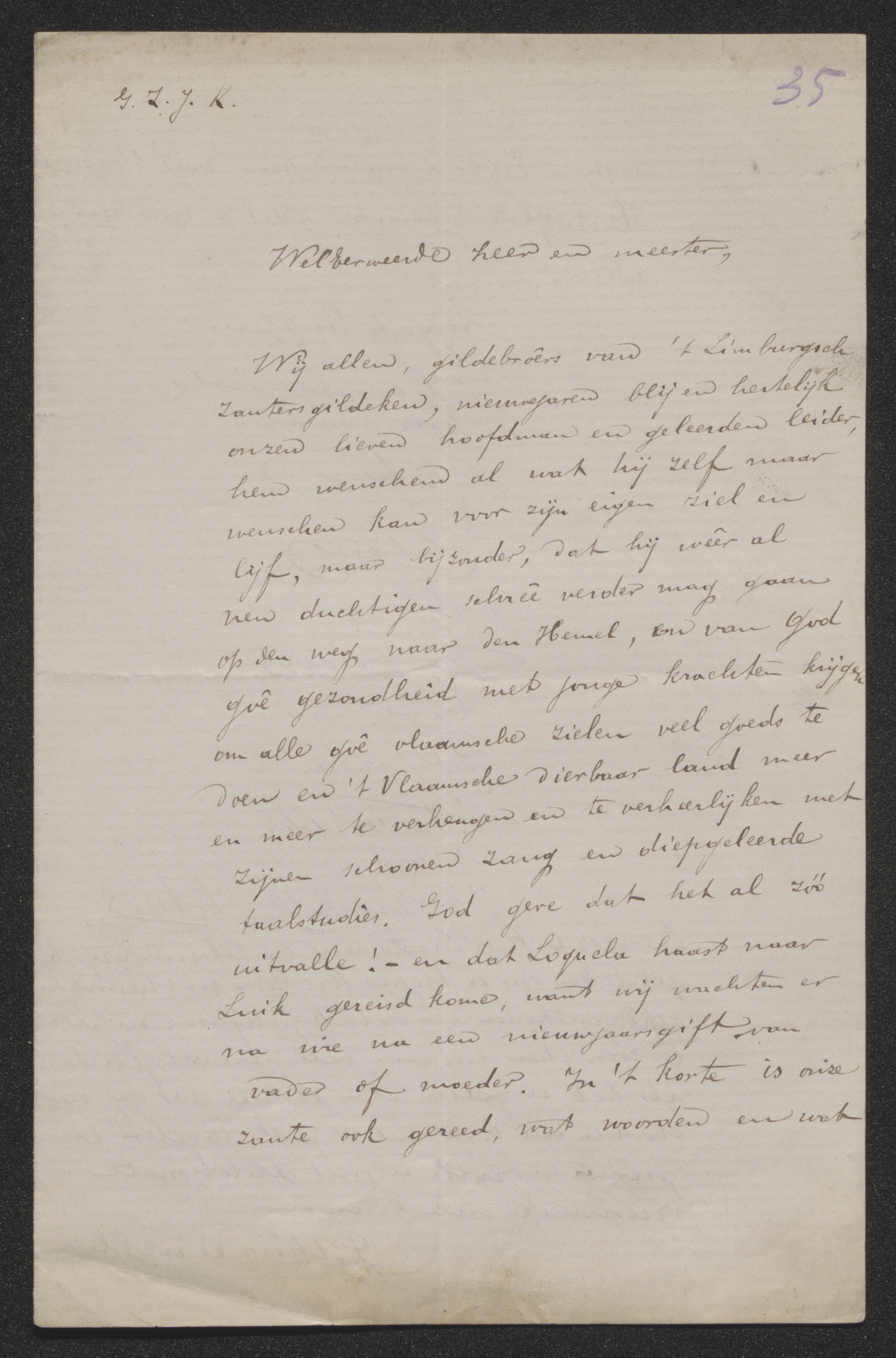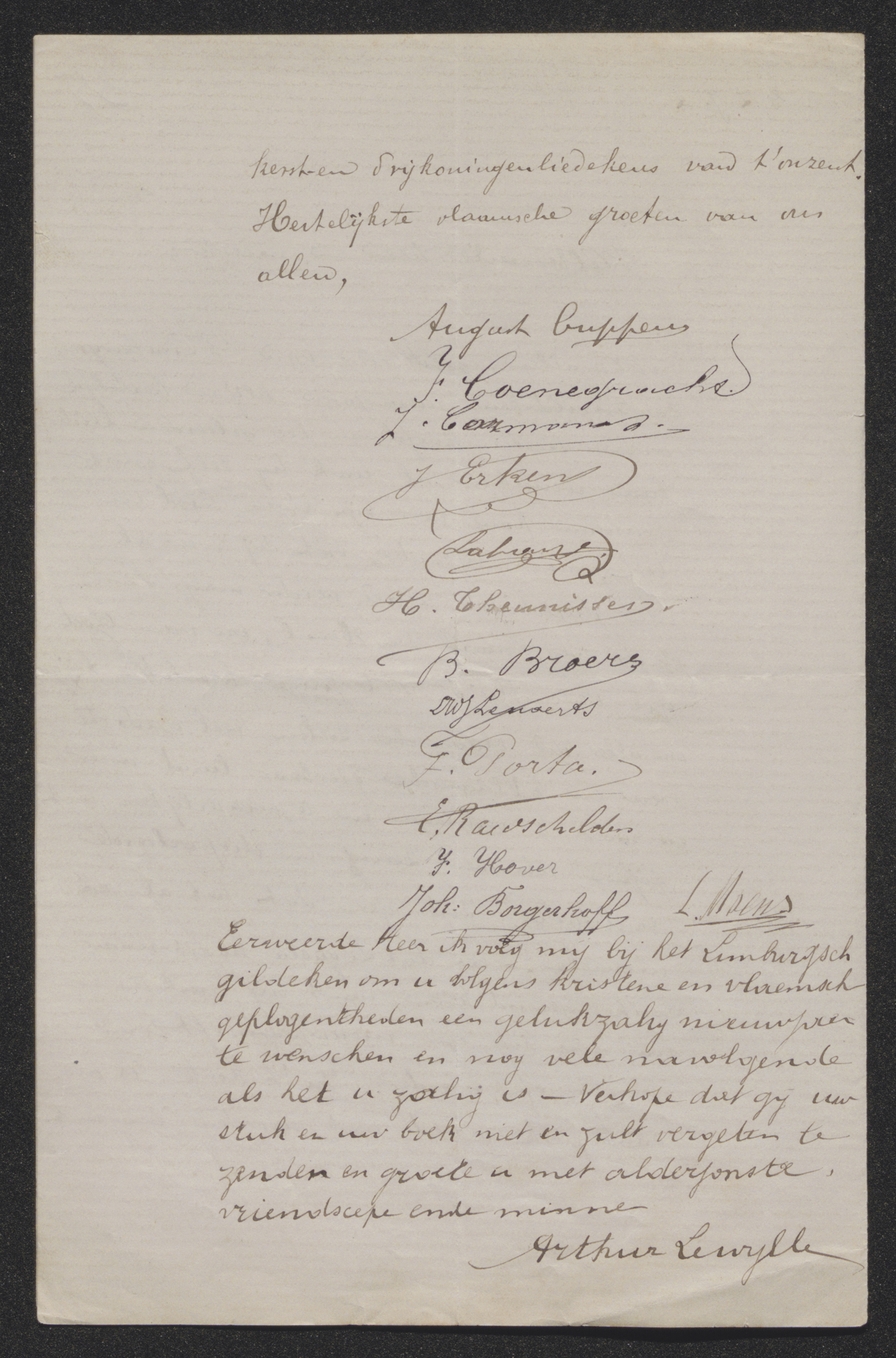 Wij allen, gildebroêrs van 't Limburgsch zanters gildeken, nieuwejaren blij en hertelijk onzen lieven hoofdman en geleerden leider, hem wenschend al wat hij zelf maar wenschen kan voor zijn eigen ziel en lijf, maar bijzonder, dat hij weêr al nen duchtigen schreê verder mag gaan op den weg naar de Hemel; en van God goê gezondheid met jonge krachten krijgen om alle goê vlaamsche zielen veel goeds te doen en 't Vlaamsche dierbaar land meer en meer te verheugen en te verheerlijken met zijnen schoonen zang en diepgeleerde taalstudies. God geve dat het al zóó uitvalle! - en dat Loquela haast naar Luik gereisd kome, want wij wachten er na wie na een nieuwjaarsgift van vader of moeder. In 't korte is onze zante ook gereed, wat woorden en wat p2kerst- en drijkoningenliedekens van t'onzent.