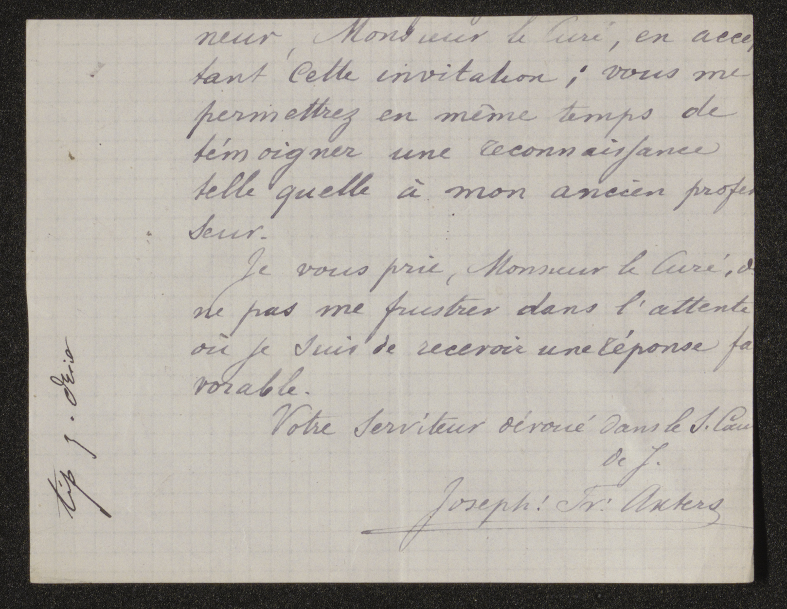 Je vous prie, Monsieur le Curé, de ne pas me frustrer dans l’attente où je suis de recevoir une réponse favorable.