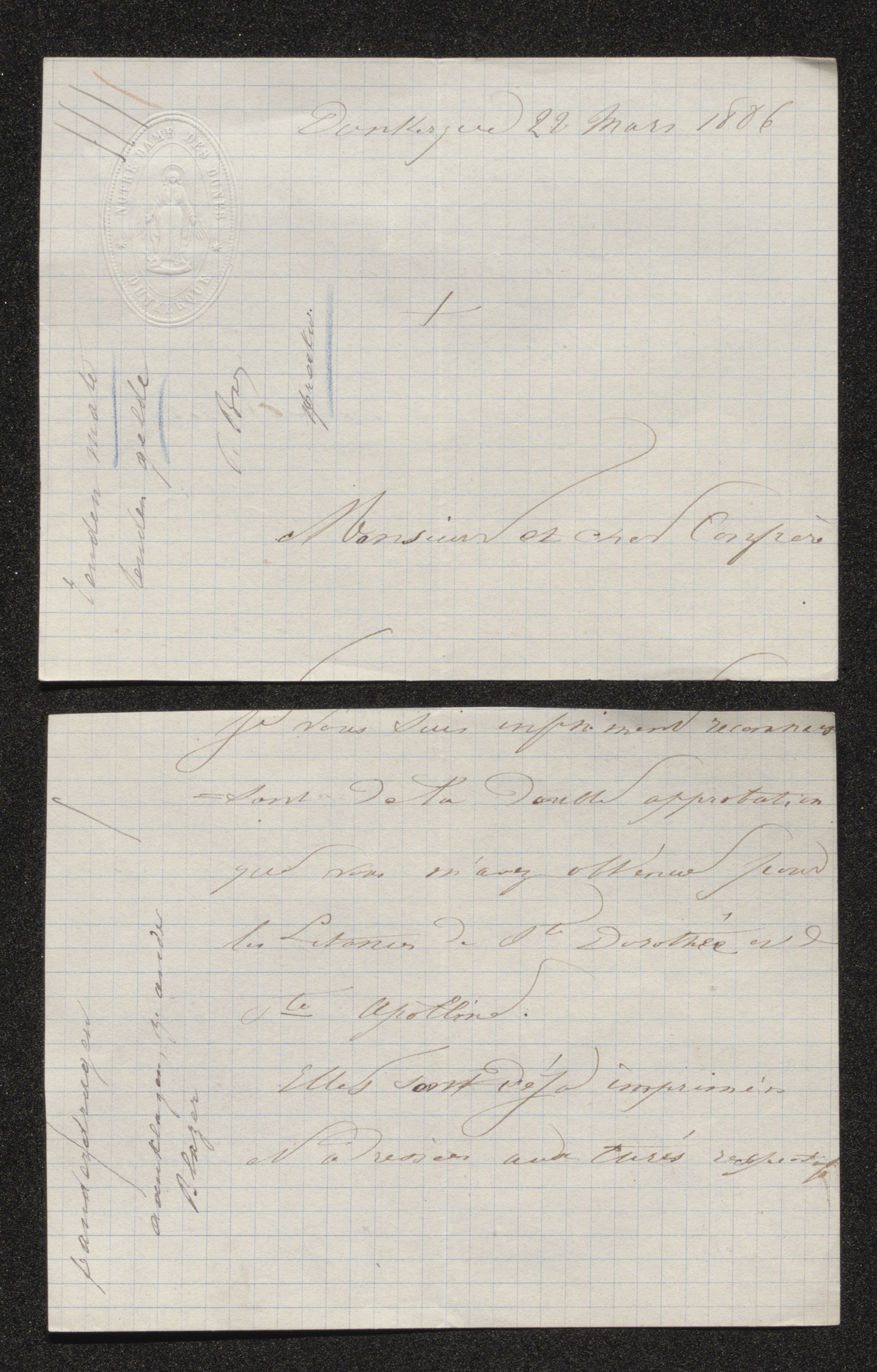 Je vous suis infiniment reconnaissant de la double approbation que vous m'avez obtenue pour les Litanies de Ste Dorothée et de Ste Apolline.