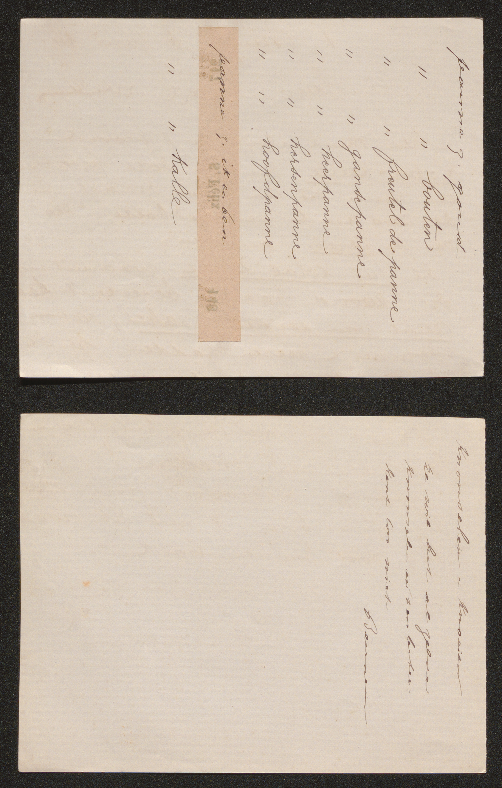 Toevoegingen op zijde 2 rechts: taalkundige notities: panne z. goud // " " bouten // " " freutel de panne // " " gansepanne // " " heerpanne // " " hersenpanne // " " hoofdpanne // panne z. ik en ben // " " kalle (inkt, verticaal, hand G.G en Cordelia VDW); op blanco zijde 4 rechts: taalkundige notities: knonselen = knoeien // Ze wil het al zelve // knonselen en 't en beteekent ton niet // Beernem (inkt, verticaal, hand G.G.)