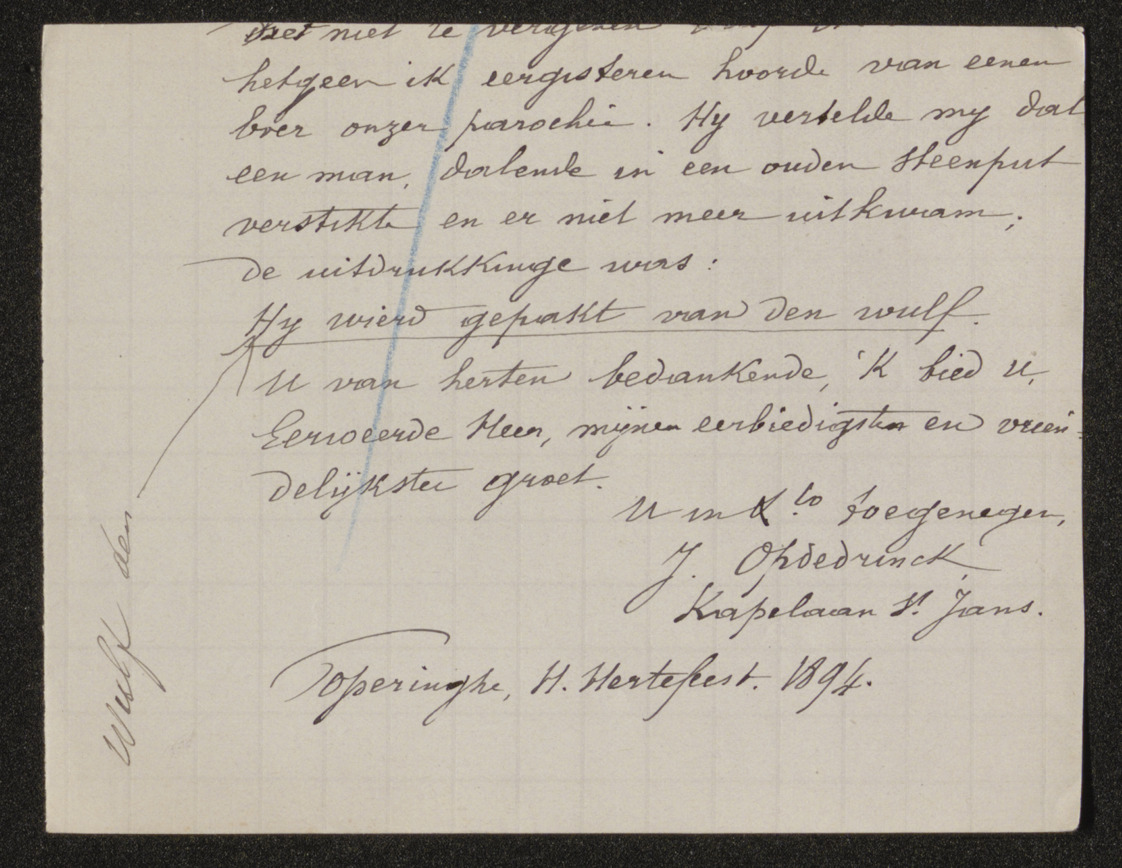 hetgeen ik eergisteren hoorde van eenen boer onzer parochie. Hij vertelde mij dat een man, dalende in een ouden steenput verstikte en er niet meer uitkwam;