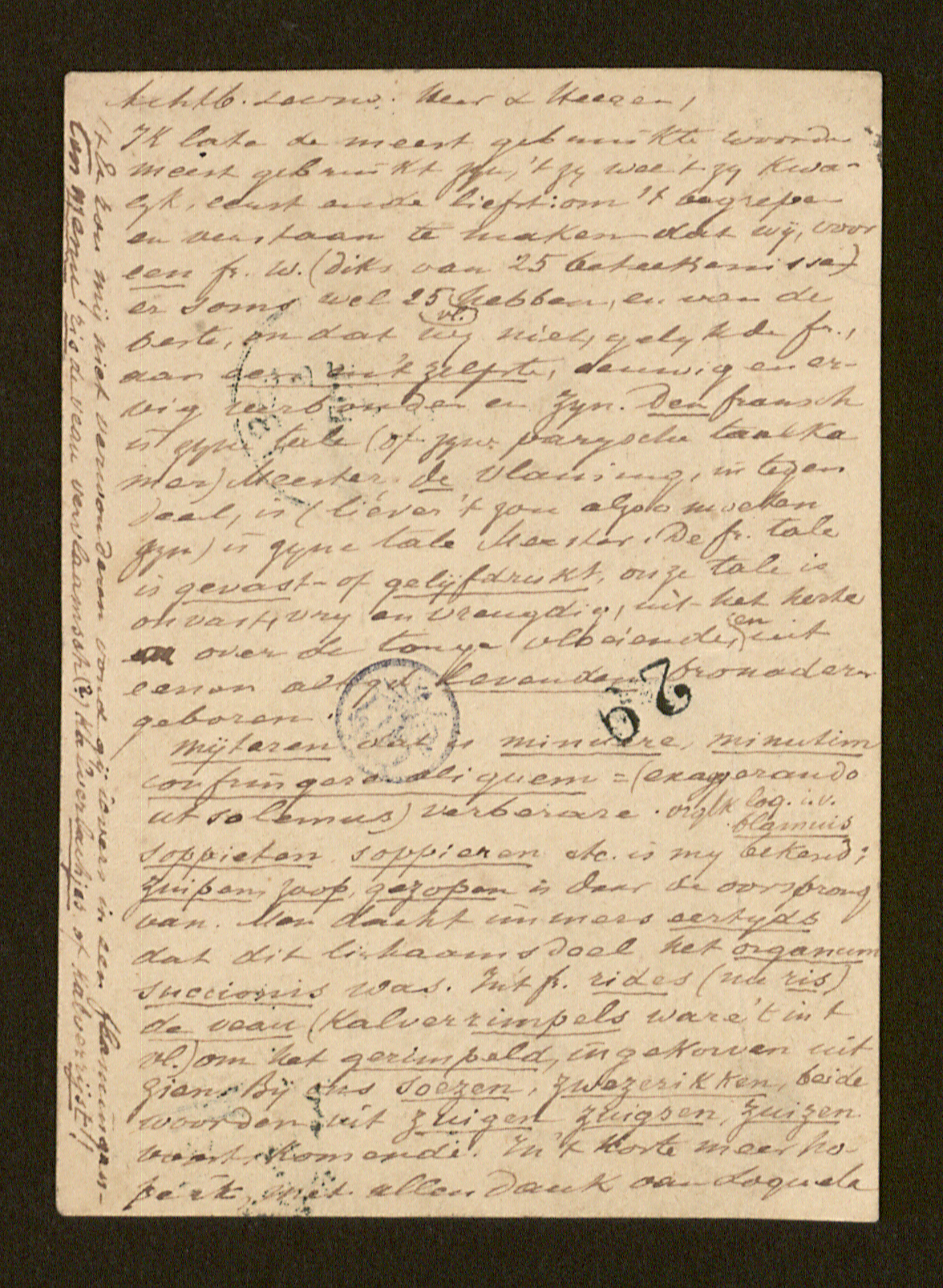 Mijteren[2] dat is minuere, minutim confringere aliquem = (exaggerando ut solemus) verberare.[3] vergelijk loq. in verbo blamuis.[4] soppieten, soppieren etc. is mij bekend; zuipen, zoop, gezopen is daar de oorsprong van. Men dacht immers eertijds dat dit lichaamsdeel het organum succionis[5] was. In ’t fransch rides[6] (nu ris[7]) de veau (kalverrimpels ware ‘t in t vlaamsch) om het gerimpeld, ingekorven uitzien. Bij ons soezen, zwezerikken, beide woorden uit zuigen, zuigsen, zuizen voortkomende. In ’t korte meer hope ik, met allen dank van Loquela.