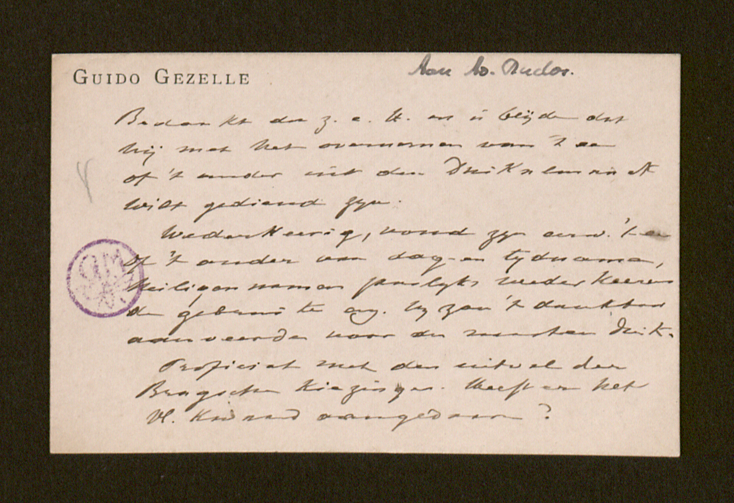 DisclaimerDe editie van de Guido Gezellecorrespondentie is het resultaat van een samenwerkingsproject met vrijwilligers. De databank is in opbouw, aanvullingen en opmerkingen kunnen gemeld worden aan els.depuydt@brugge.be.