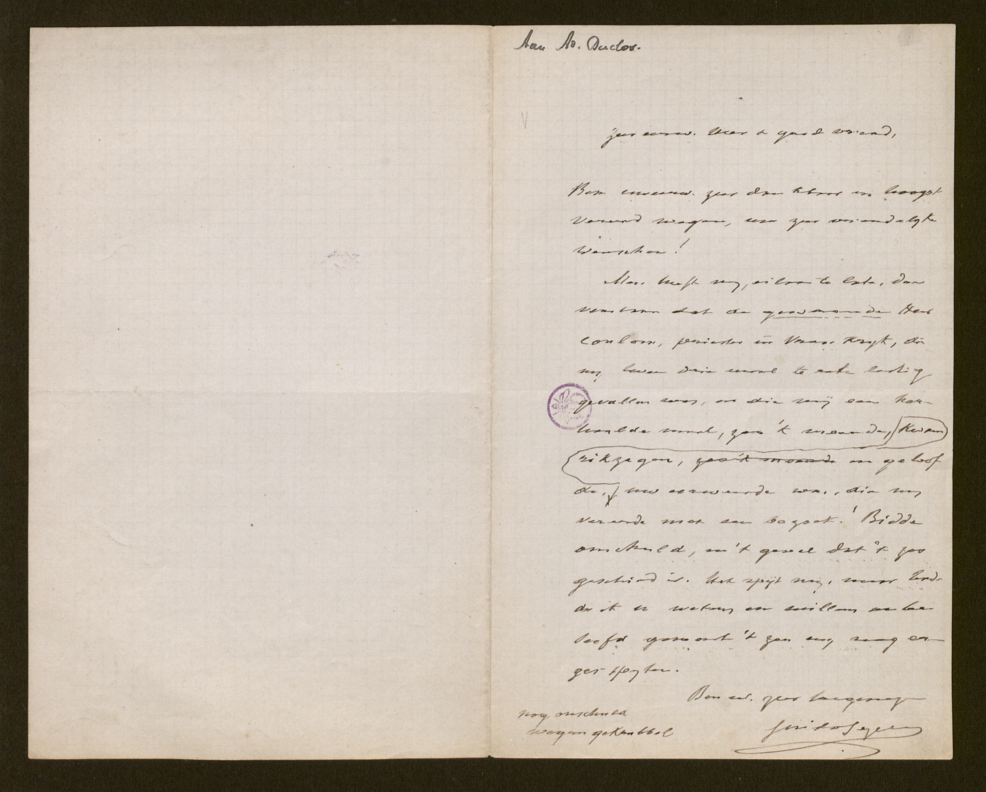 Men heeft mij, eilaas te late, doen verstaan dat de gewaanden Heer Coulon, priester in Vrankrijk, die mij twee drie maal te reke lastig gevallen was, en die mij een herhaalde maal, zoo 'k meende, rikzagen,[1] en geloofde, kwam uw eerweerde was, die mij vereerde met een bezoek! Bidde onschuld, in 't geval dat 't zoo geschied is. Het spijt mij, maar hadde ik u wetens en willens onbeleefd geweest 't zou mij nog erger spijten.