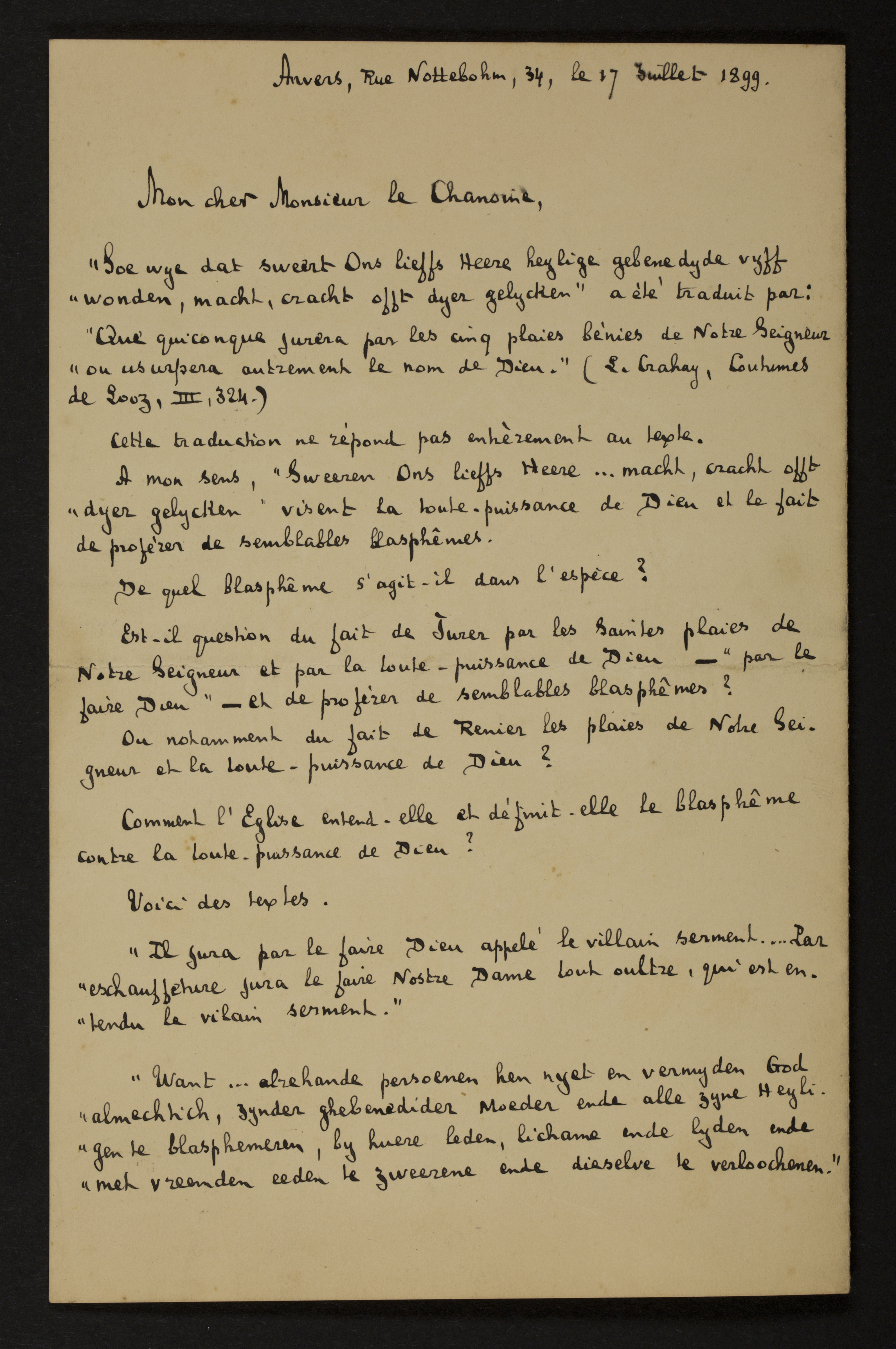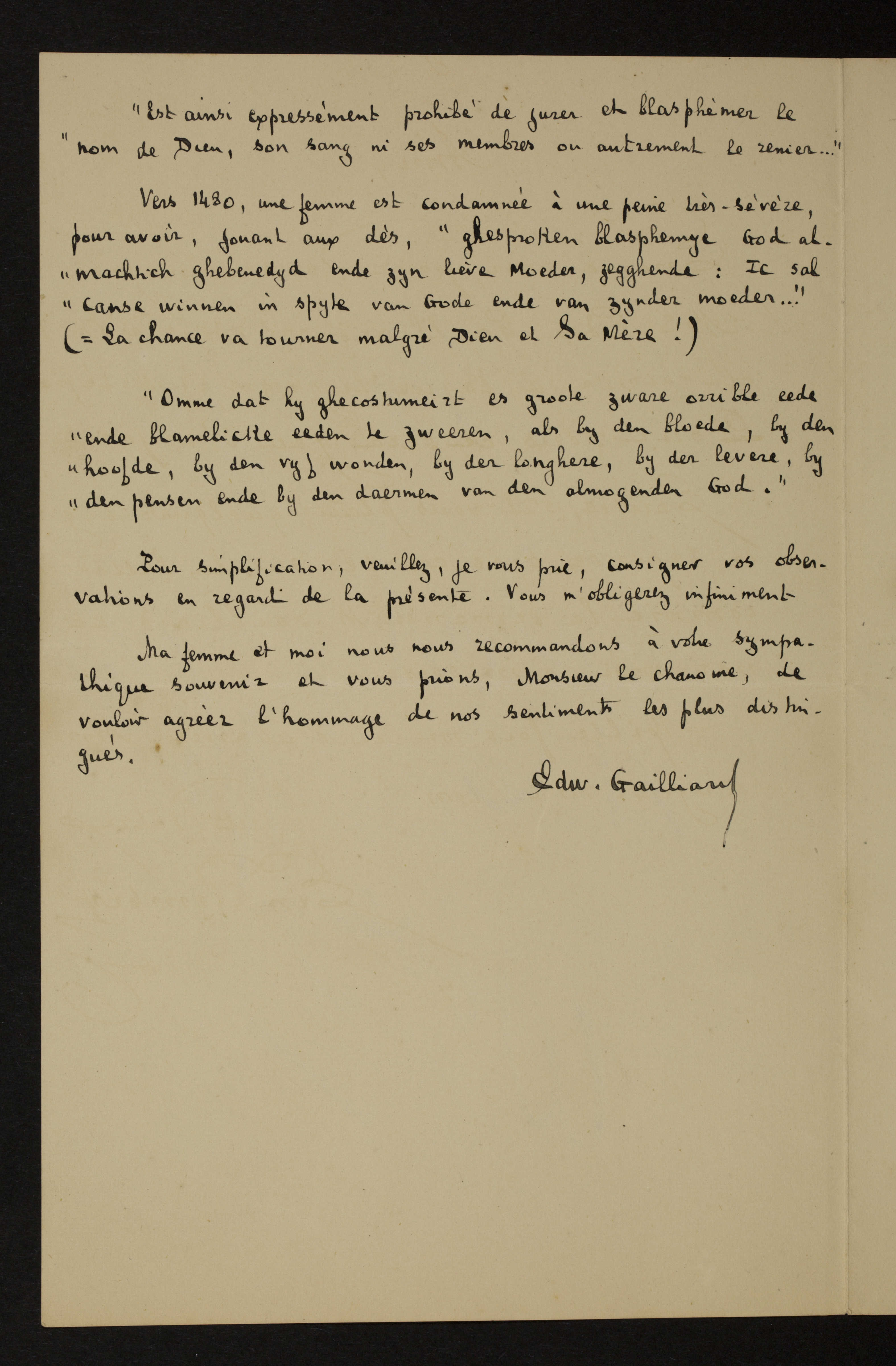 "Want ... alrehande persoenen hen nyet en vermyden God almechtich, zynder ghebenedider Moeder ende alle zyne Heyligen te blasphemeren, by huere leden, lichame ende lyden ende met vreemden eeden te zweerene ende dieselve te verloochenen." p2"Est ainsi expressément prohibé de jurer et blasphémer le nom de Dieu, son sang ni ses membres ou autrement le renier..."
