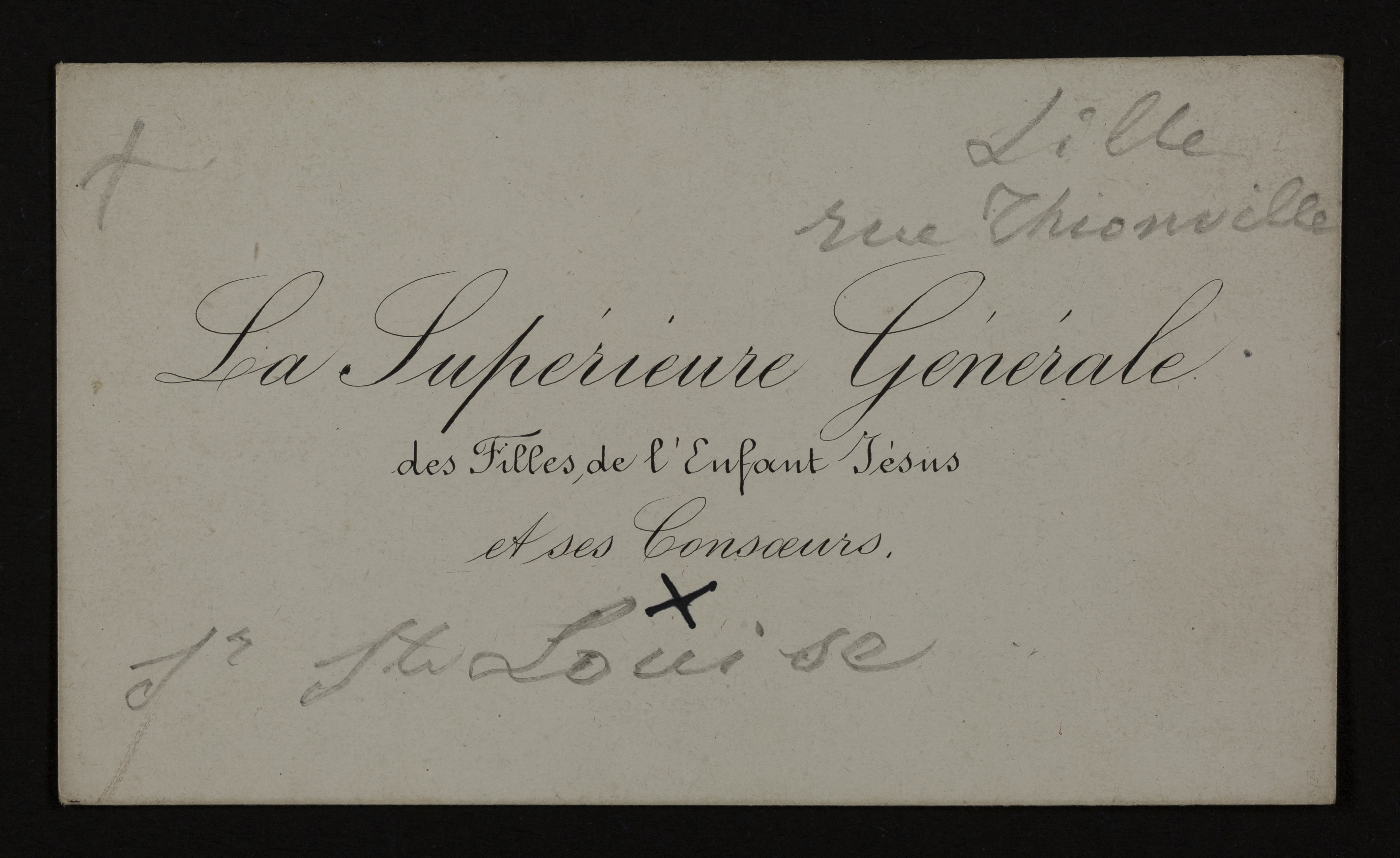 Vormelijke bijzonderheden op recto in het midden: La Supérieure Générale // des Filles de l'Enfant Jésus // et ses Consoeurs.